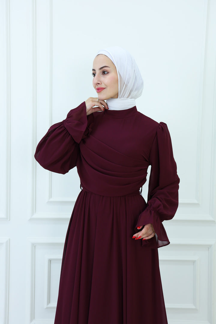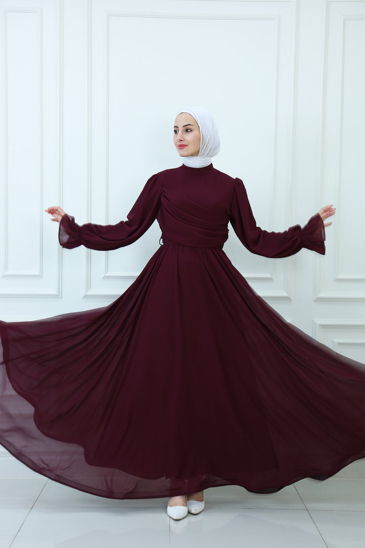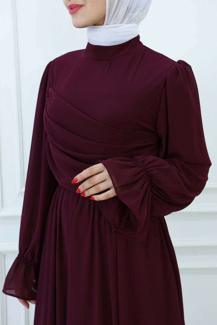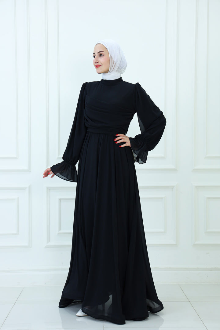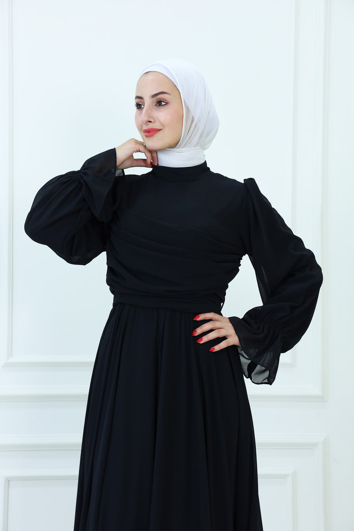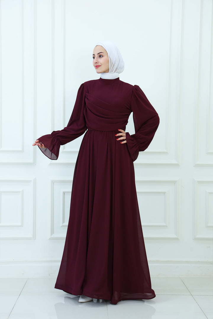 فستان ماكسي شيفون بقبعة مع تفاصيل مطوية