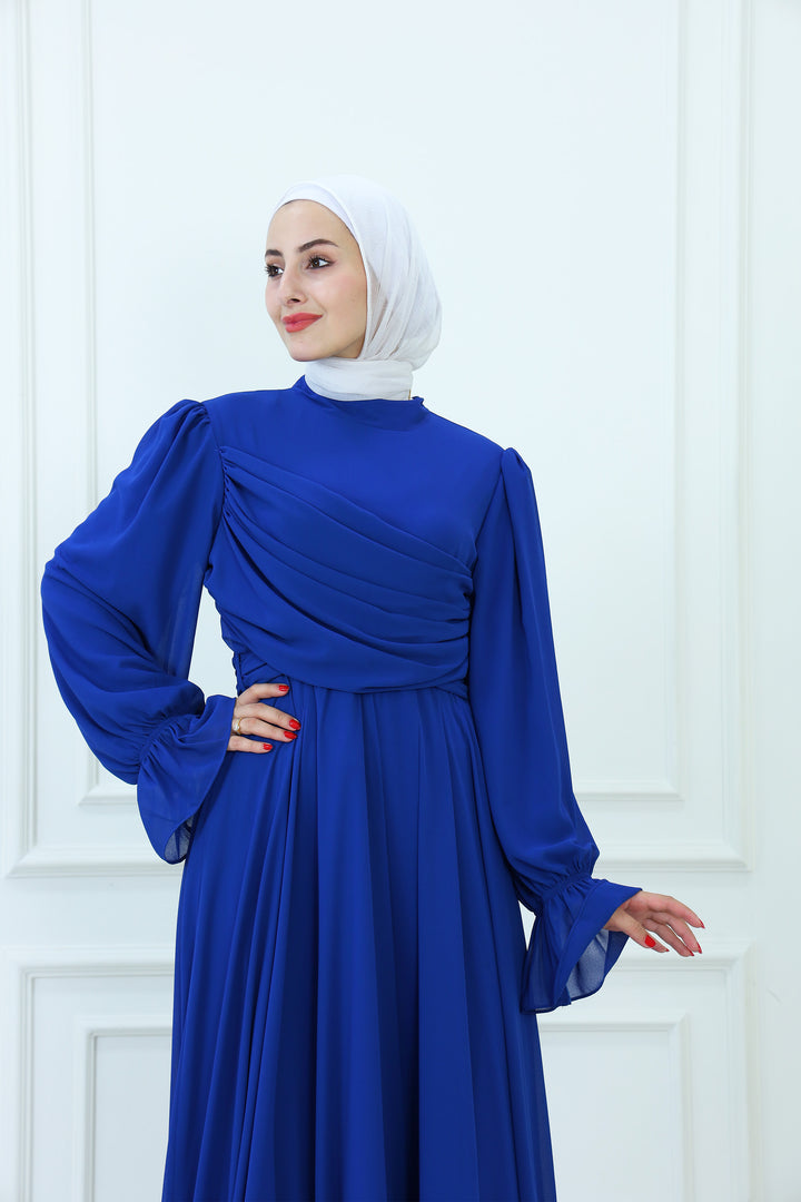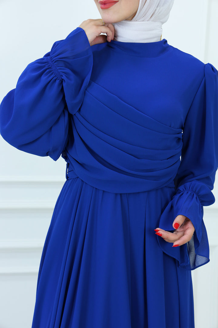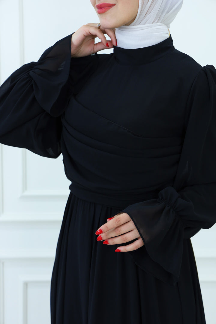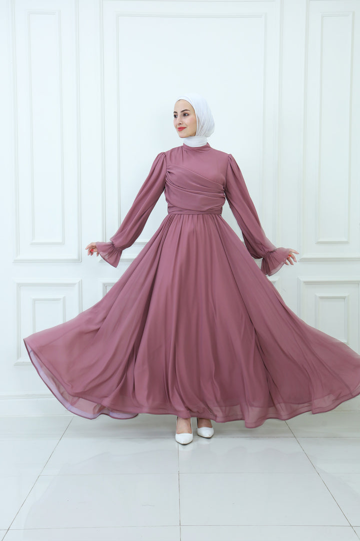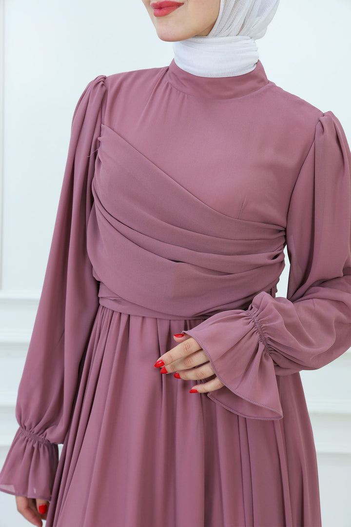 فستان ماكسي شيفون بقبعة مع تفاصيل مطوية