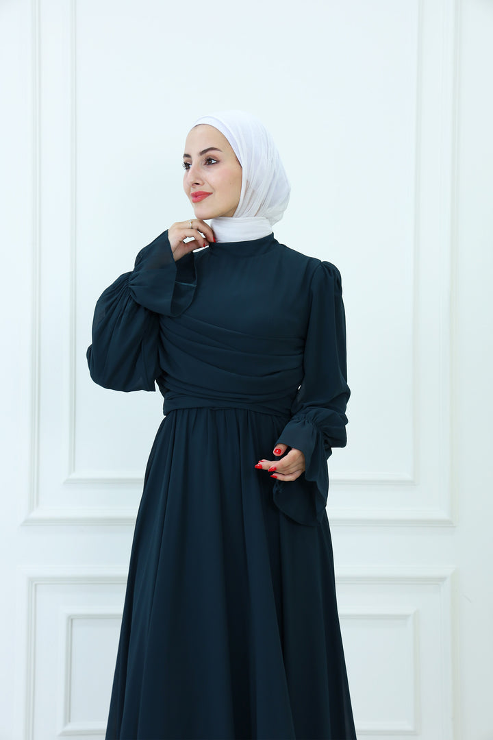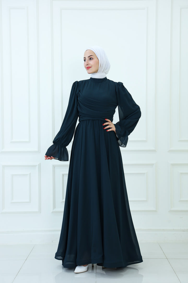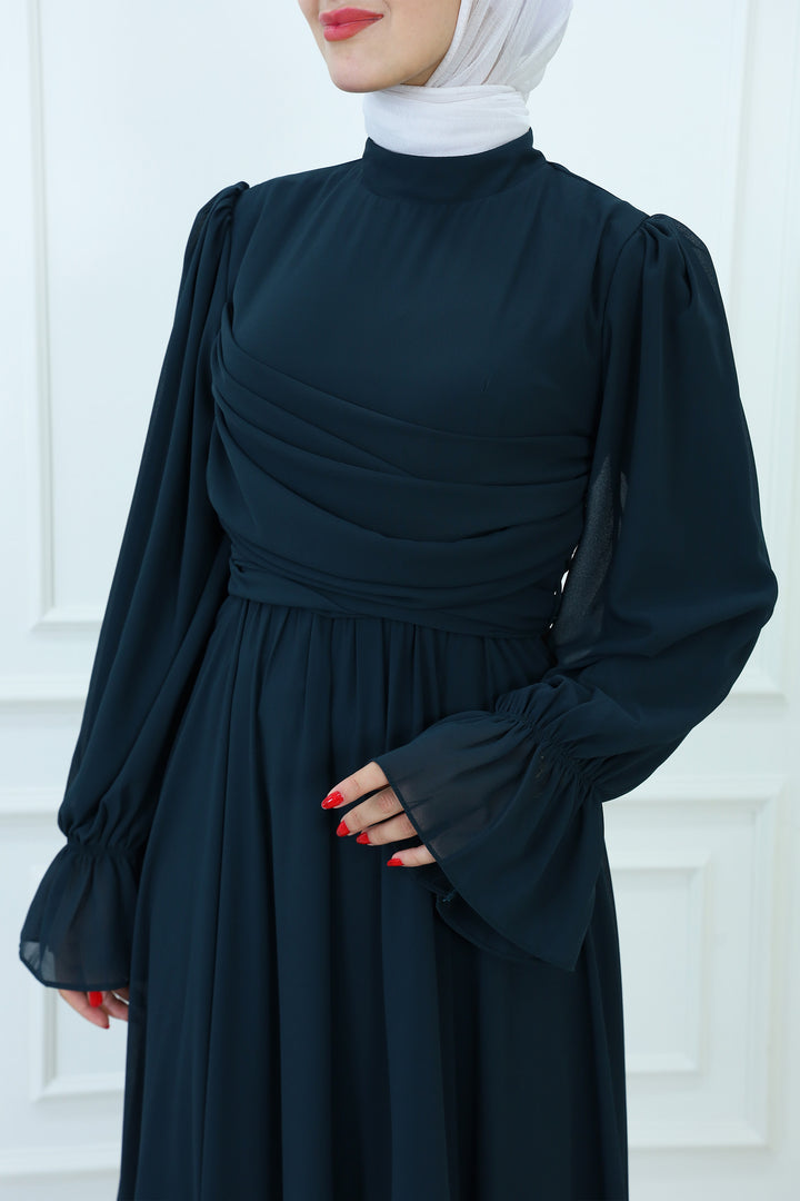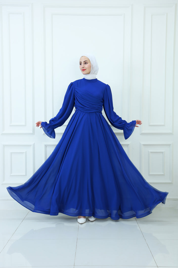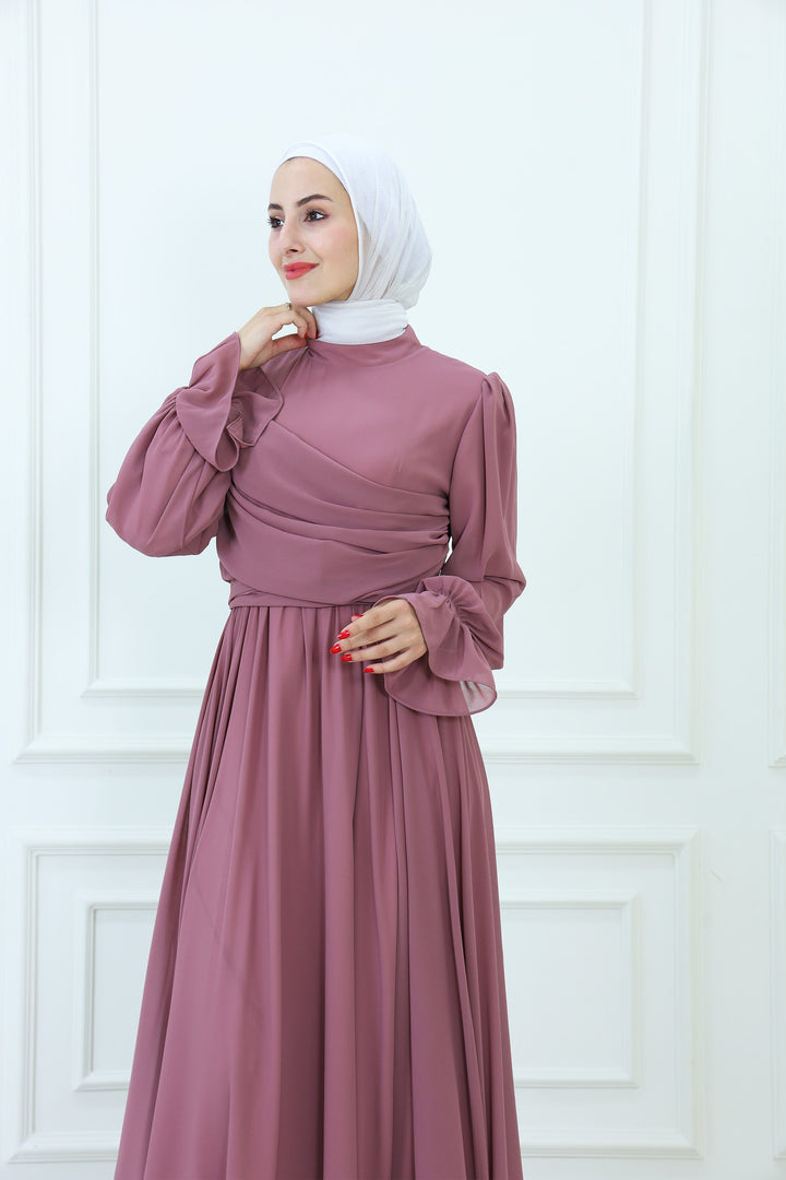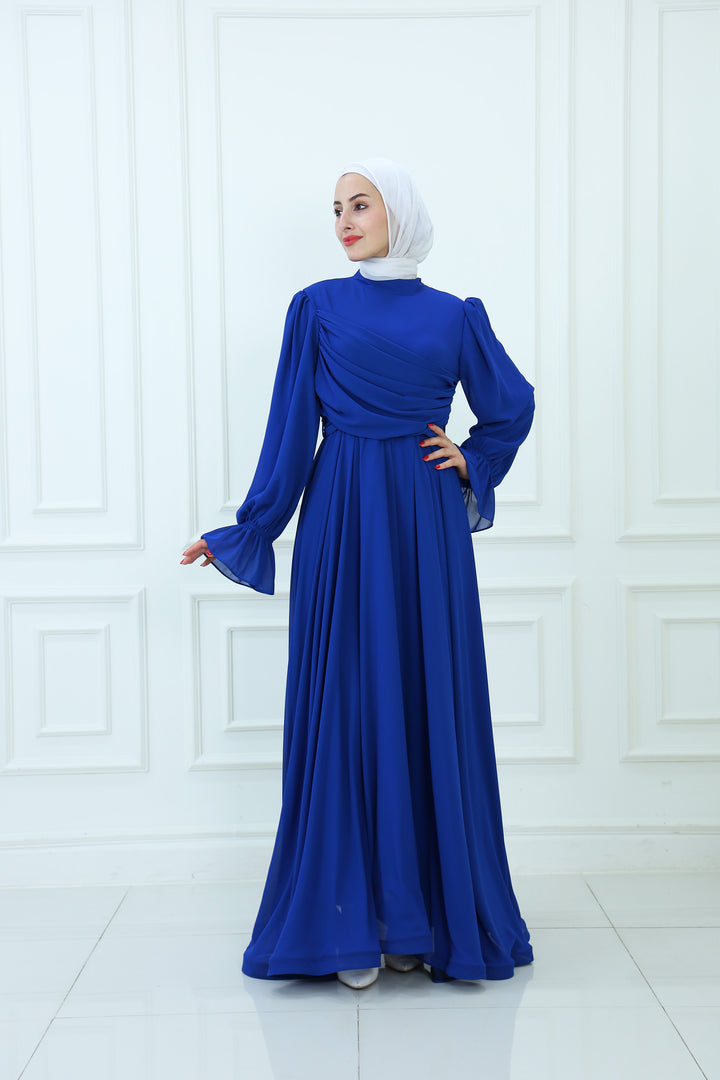 فستان ماكسي شيفون بقبعة مع تفاصيل مطوية