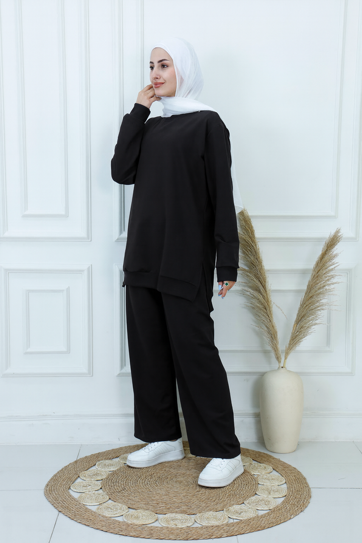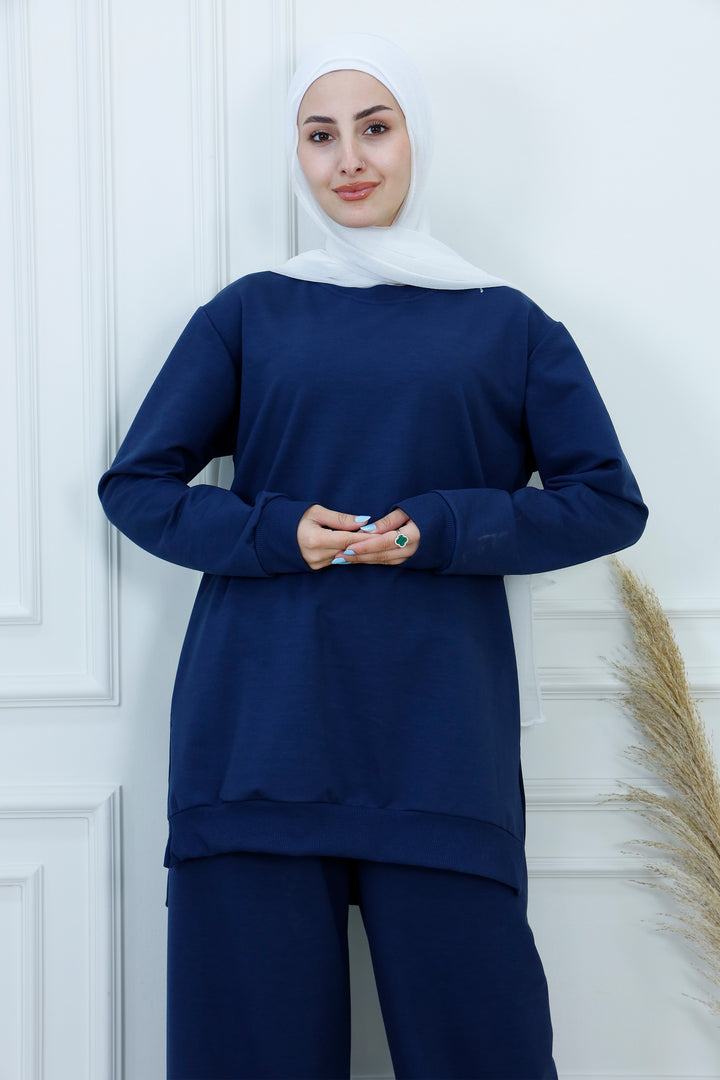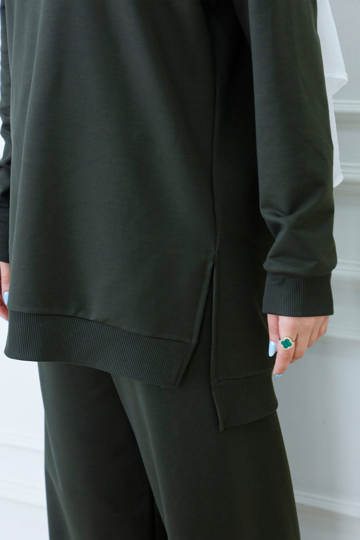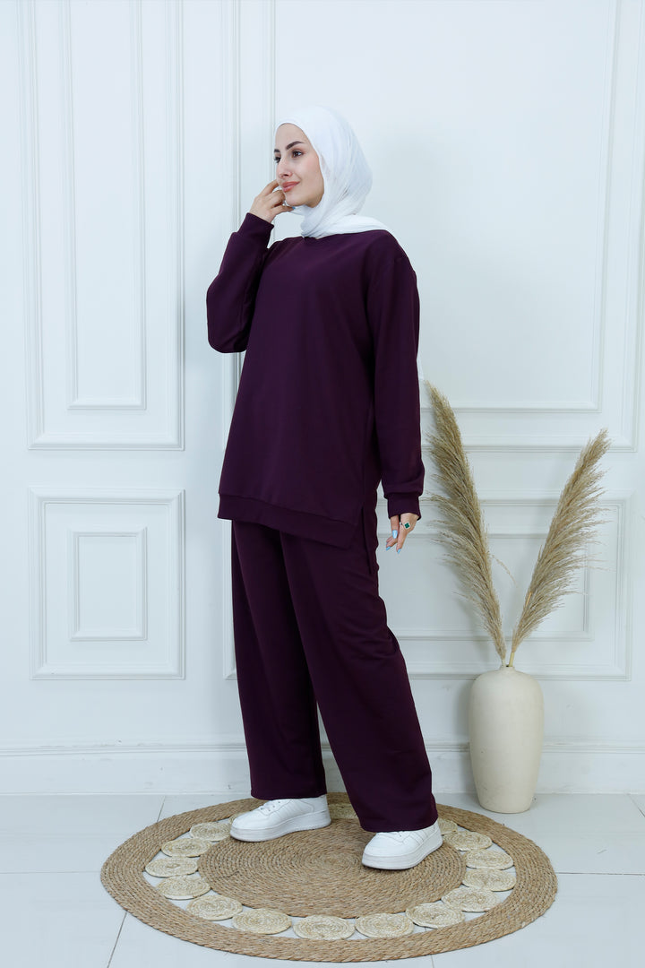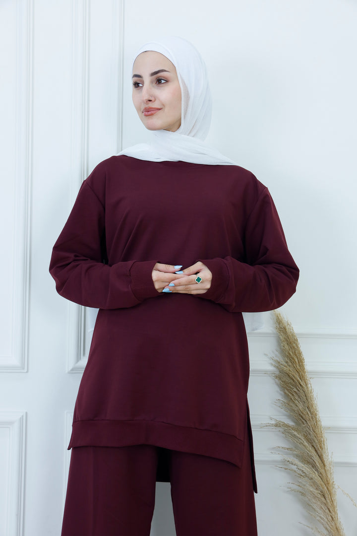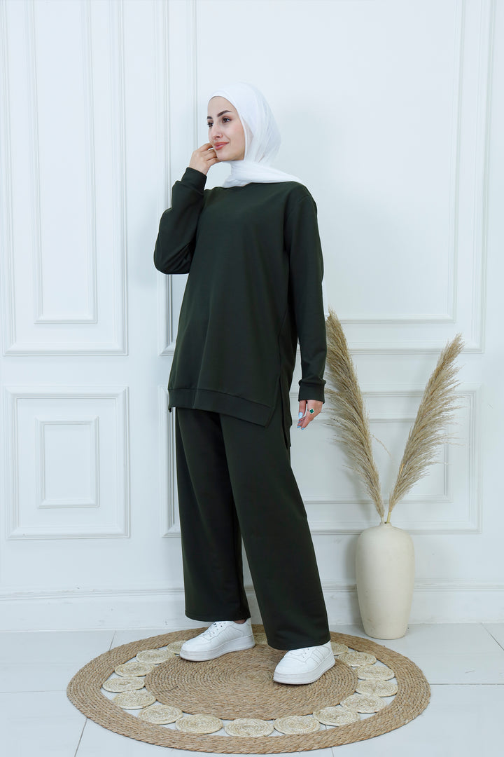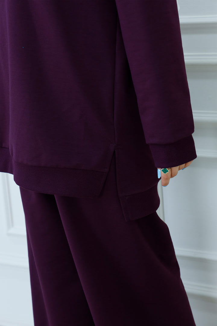 تتضمن المجموعة تونيك طويل وحجم كبير مع سروال واسع الساقين متطابق. يتميز التونيك بياقة كلاسيكية مستديرة، وأكمام كاملة الطول مع حواف مضلعة، وشقوق جانبية أنيقة عند الحافة لسهولة الحركة ولمسة عصرية. تم تصميم السروال بخصر مرن مريح وقصة واسعة الساقين مريحة تتدلى بشكل جميل إلى طول معتدل.