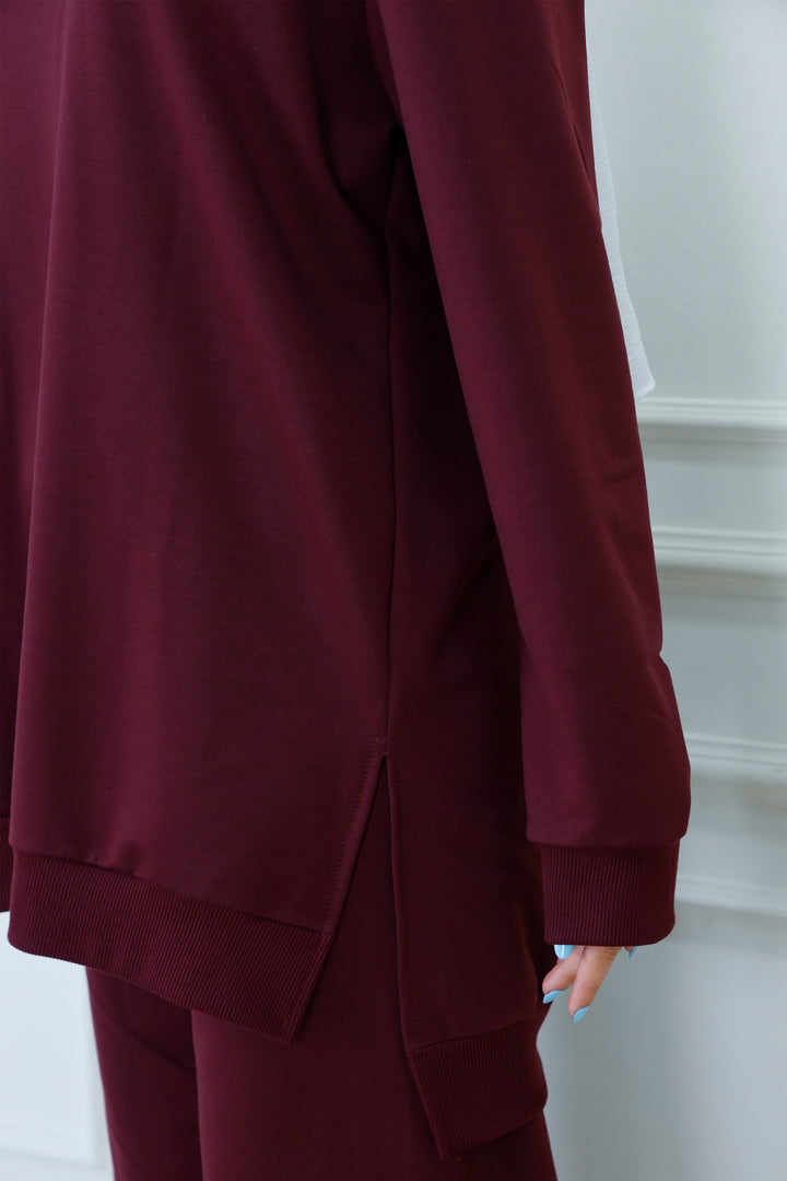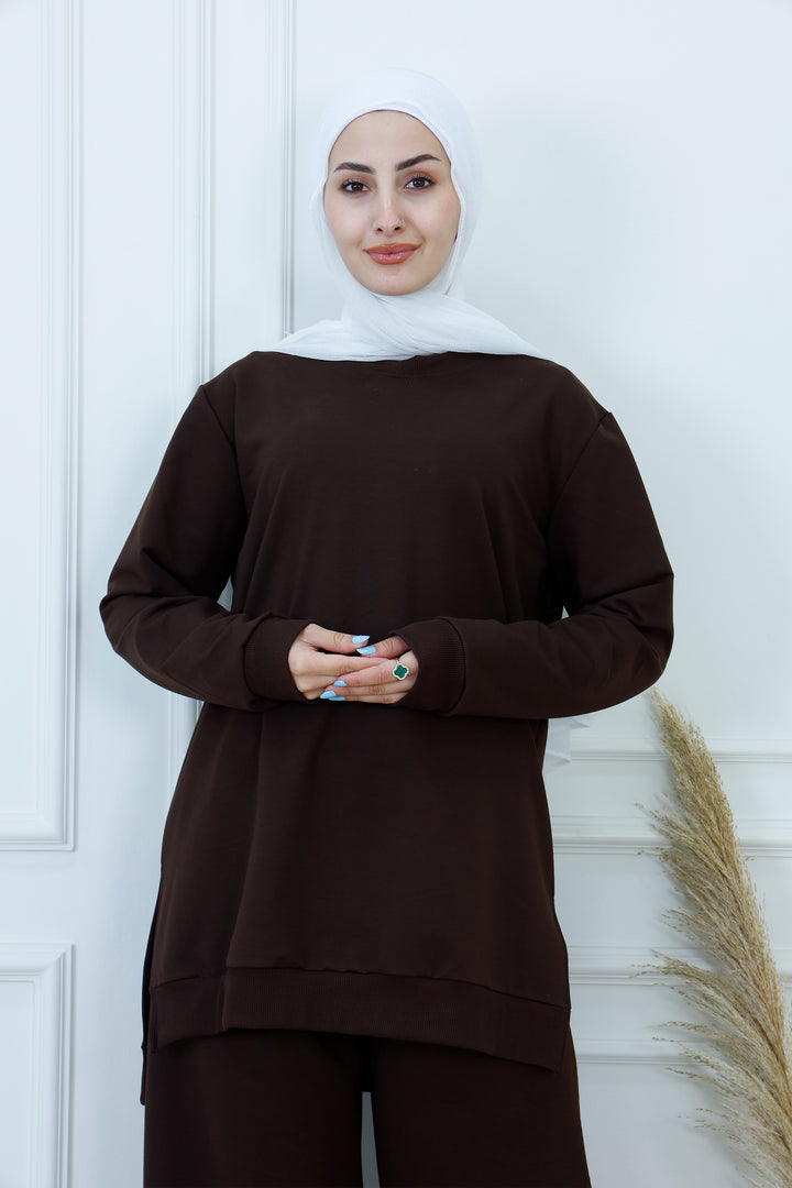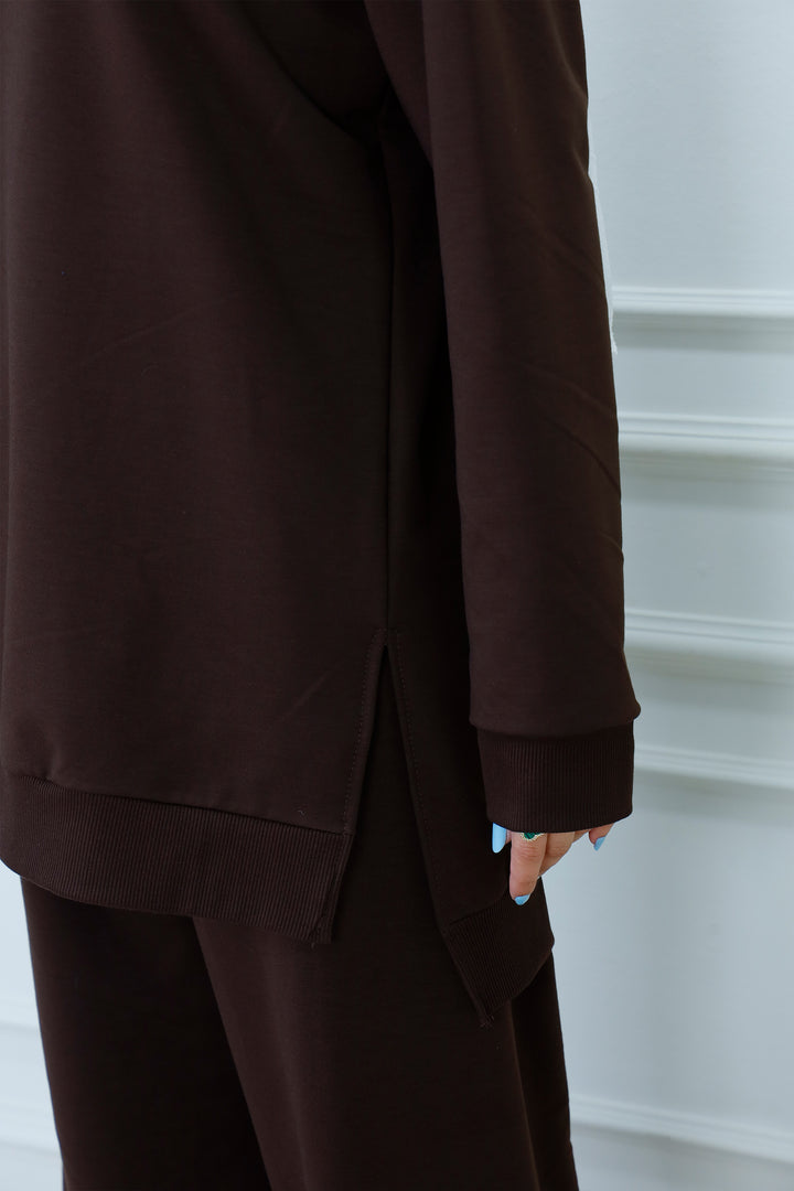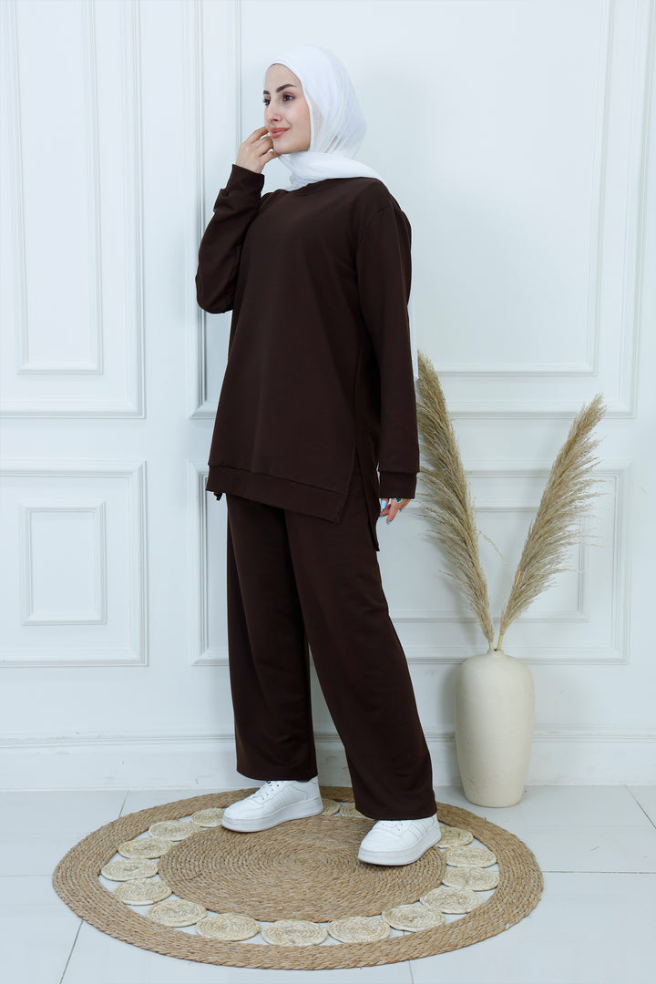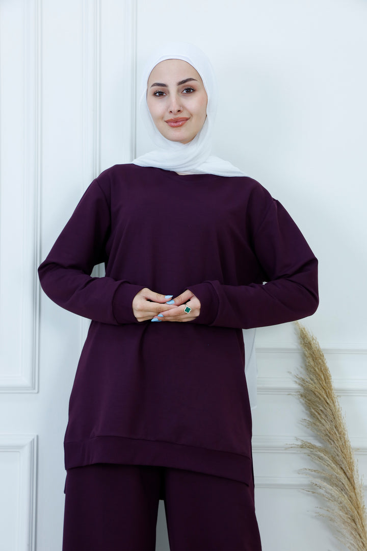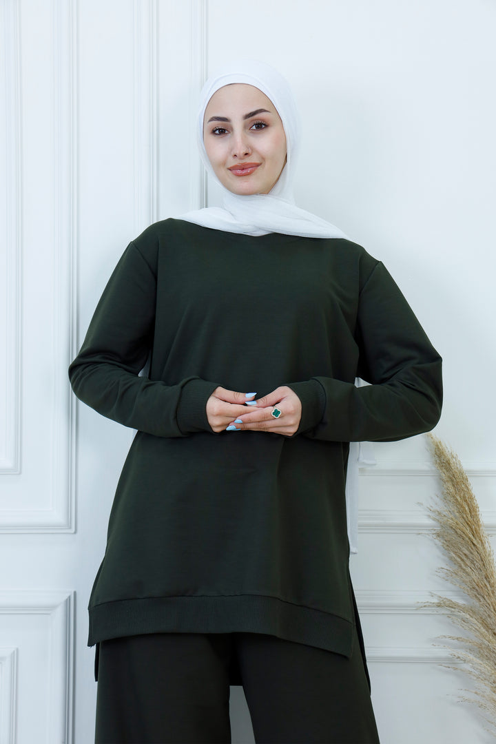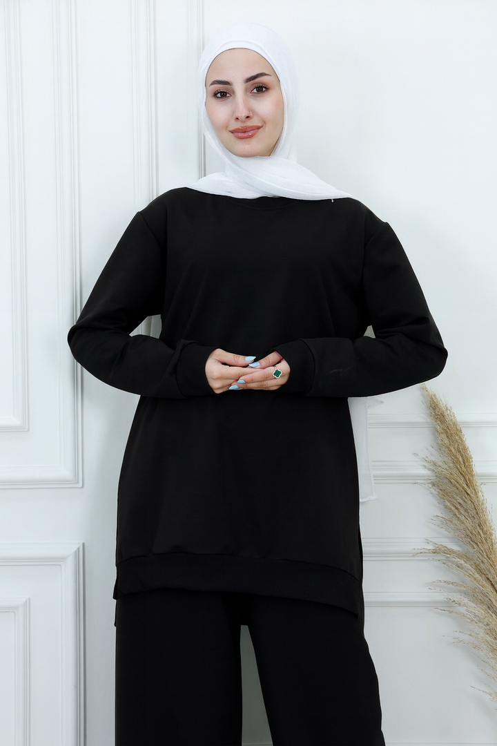 تتضمن المجموعة تونيك طويل وحجم كبير مع سروال واسع الساقين متطابق. يتميز التونيك بياقة كلاسيكية مستديرة، وأكمام كاملة الطول مع حواف مضلعة، وشقوق جانبية أنيقة عند الحافة لسهولة الحركة ولمسة عصرية. تم تصميم السروال بخصر مرن مريح وقصة واسعة الساقين مريحة تتدلى بشكل جميل إلى طول معتدل.