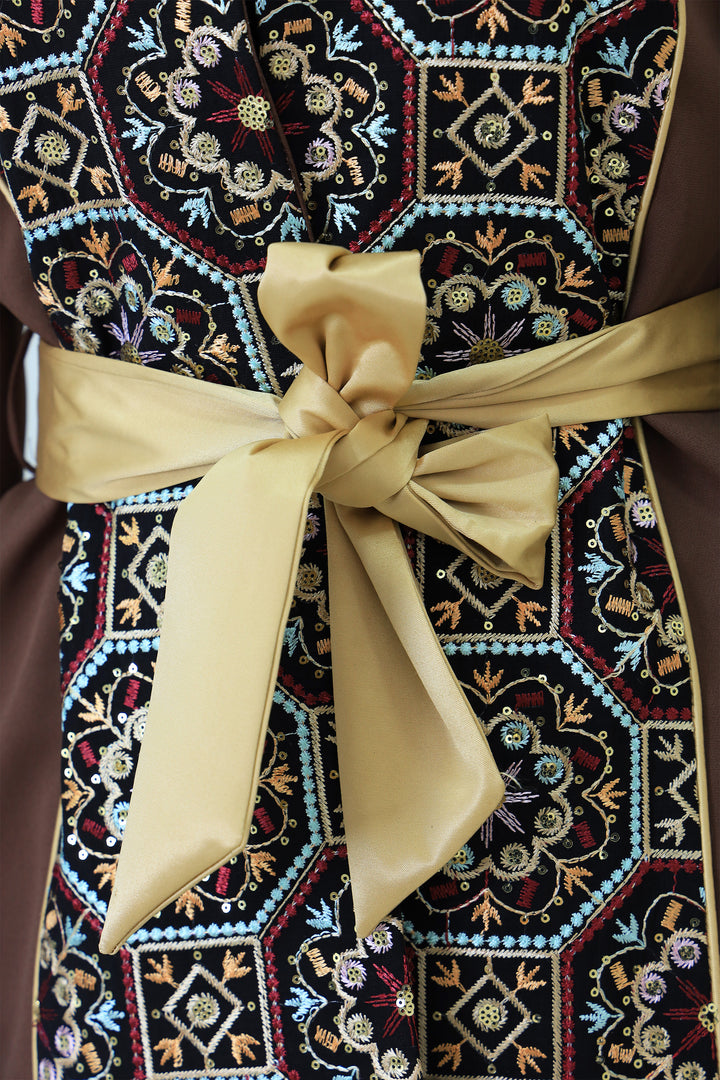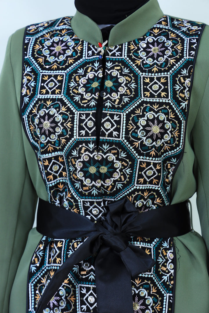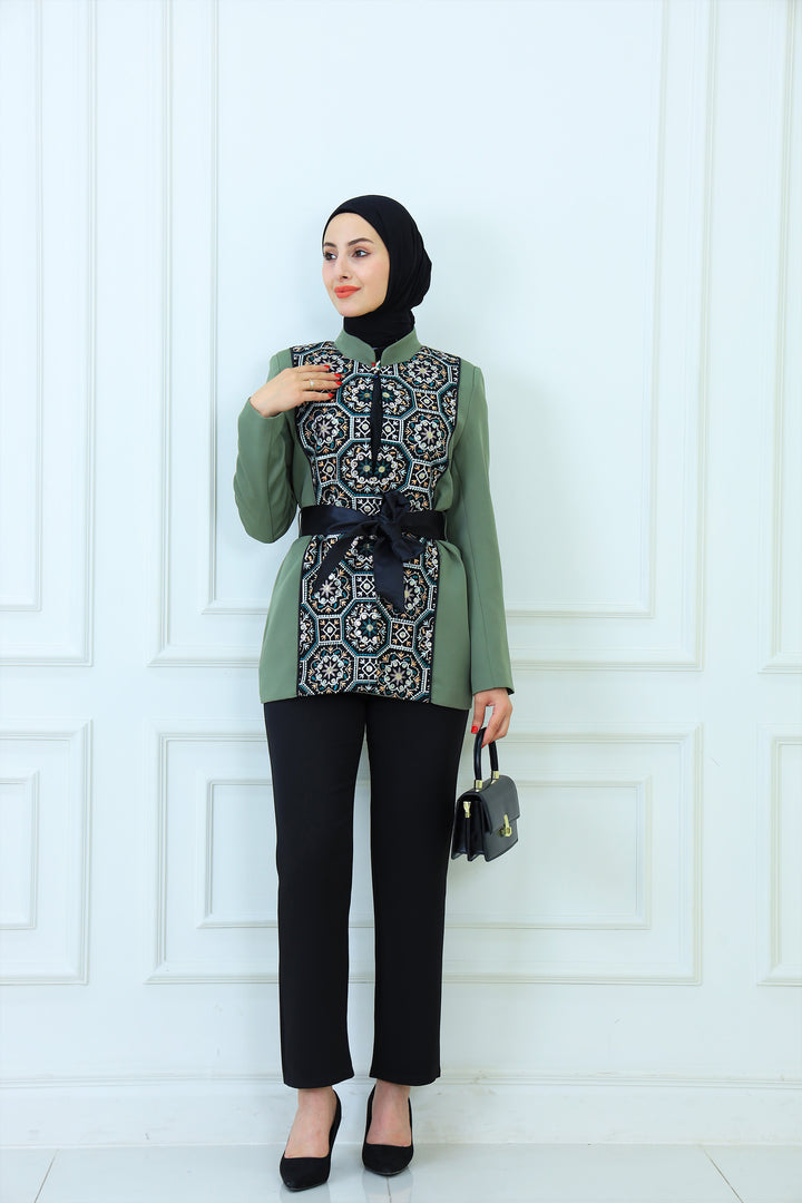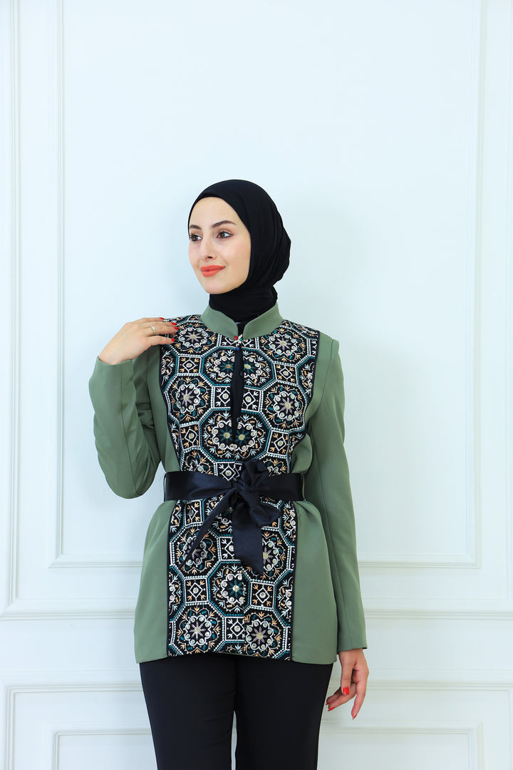 سترة أمامية كاملة مطرزة أنيقة بحزام عند الخصر