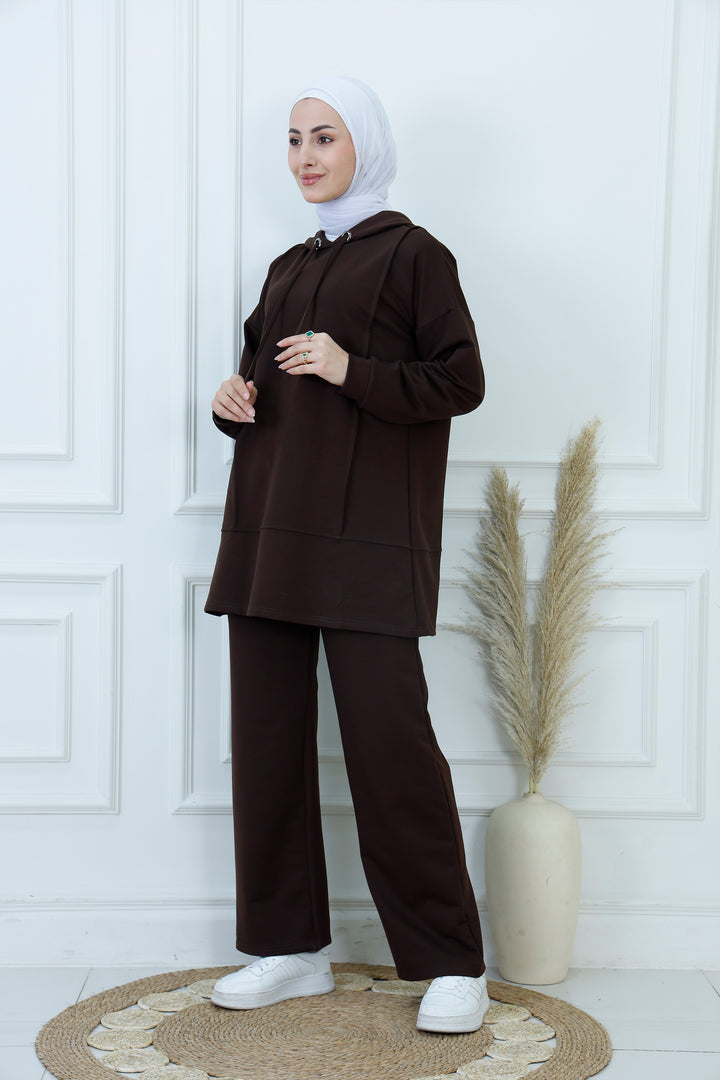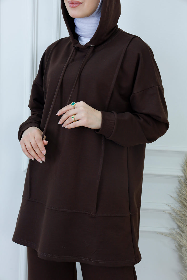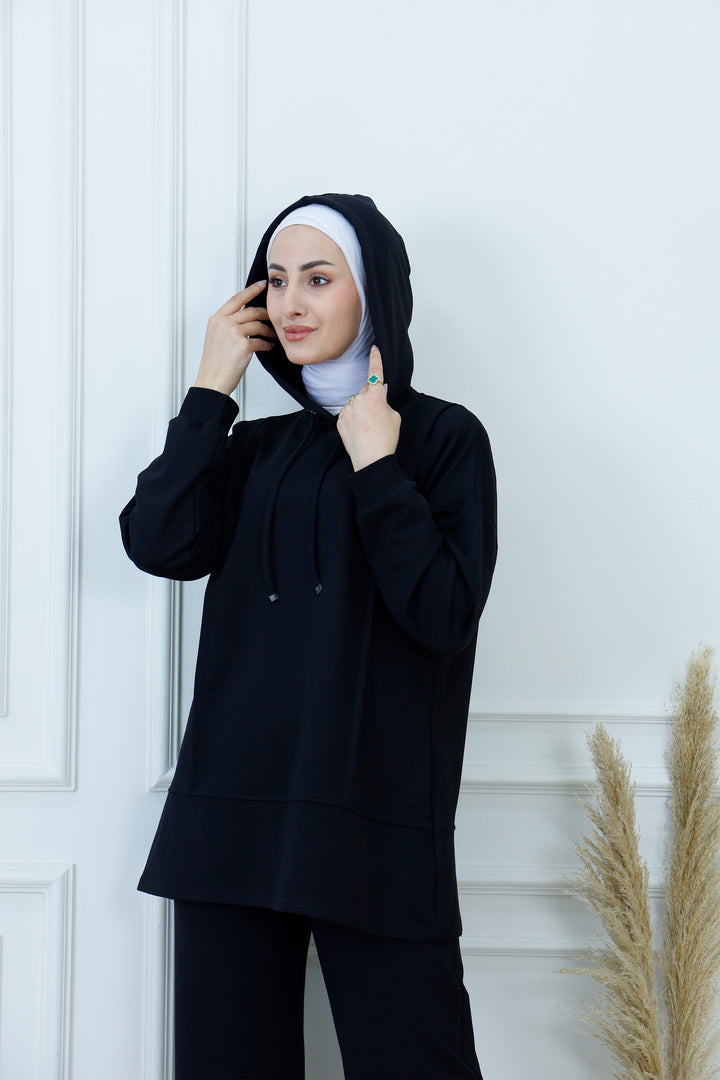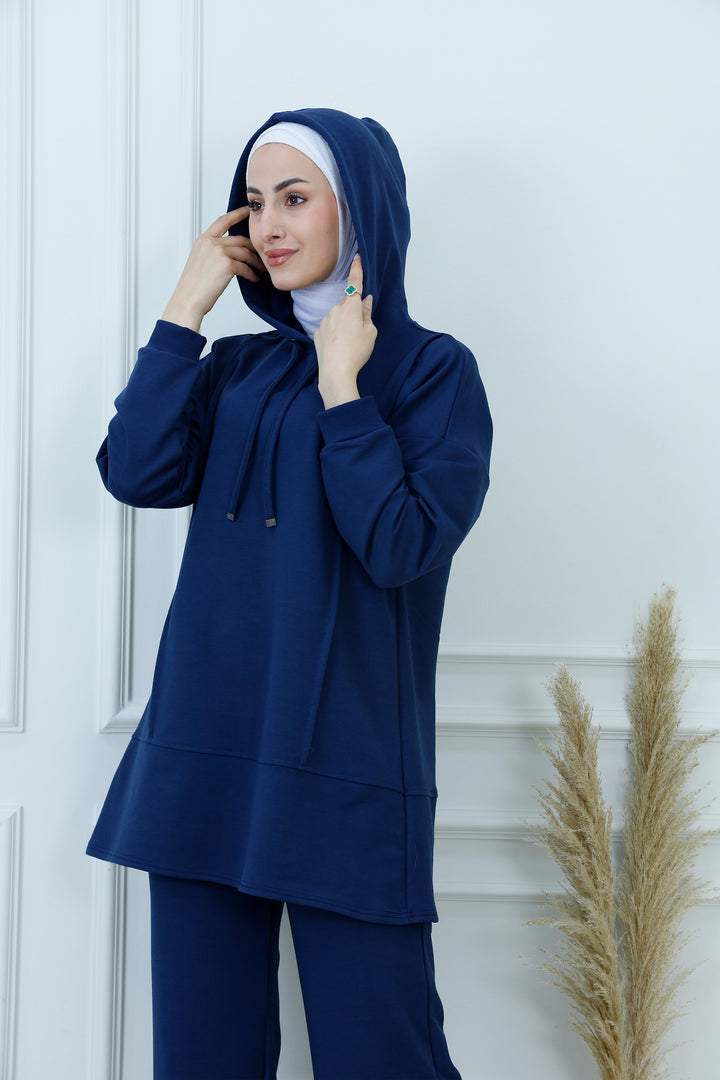 أحسن أسلوبك غير الرسمي مع مجموعة بدلة رياضية المريحة والمنسقة. تم تصميم الجزء العلوي كـ هودي بطول tunic، مما يوفر تغطية أساسية وقصة مريحة وغير ملتصقة. يتميز ب غطاء رأس بسلك سحب وجيب أمامي كبير. تكتمل المجموعة ب سروال مستقيم متطابق يضمن أقصى درجات الراحة وشكل محتشم. مصنوعة من قماش ناعم ودائم، هذه المجموعة المكونة من قطعتين مثالية للأيام النشطة، والسفر، أو الاسترخاء في المنزل بسهولة.