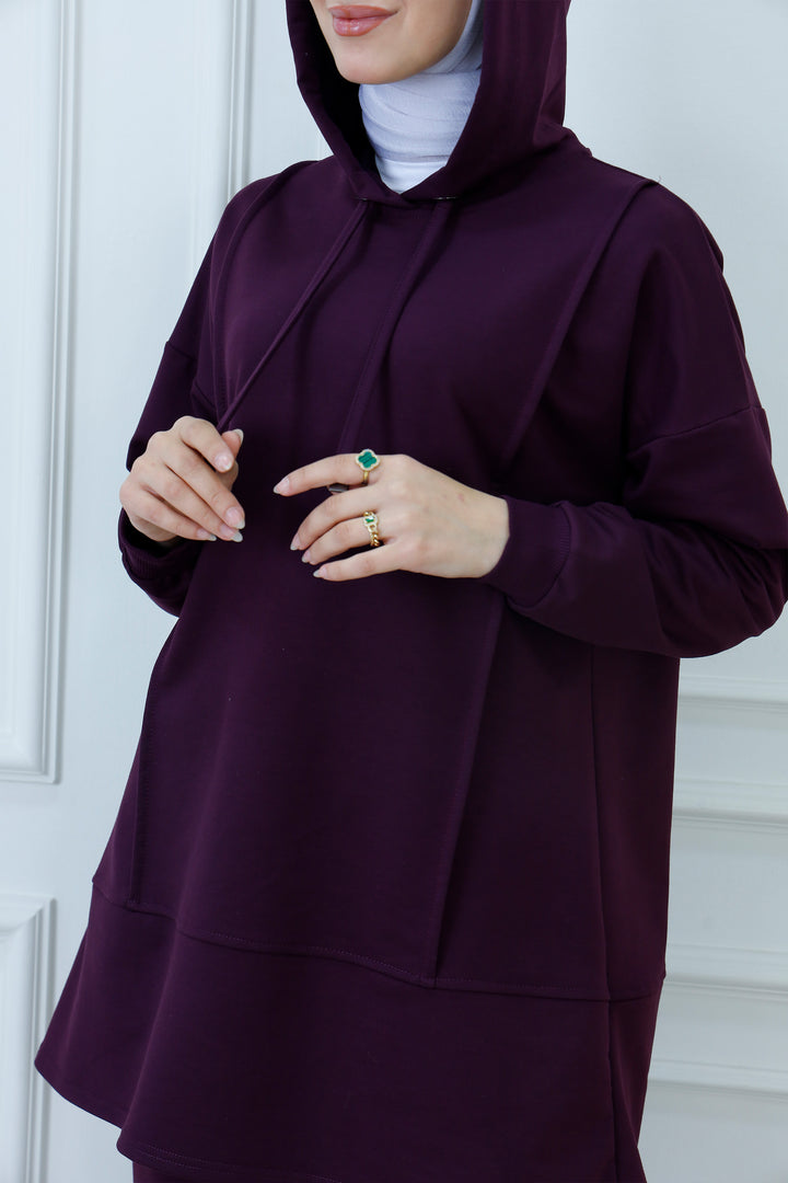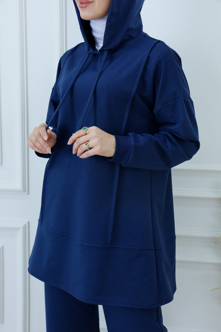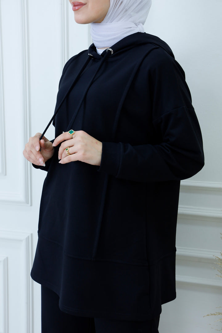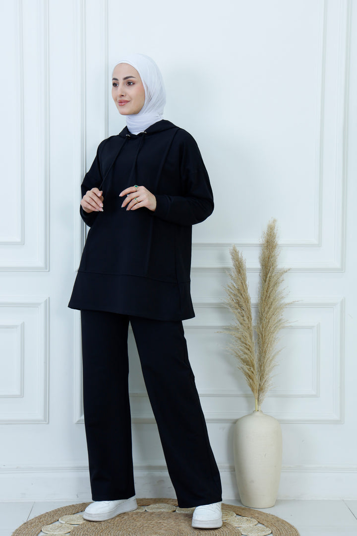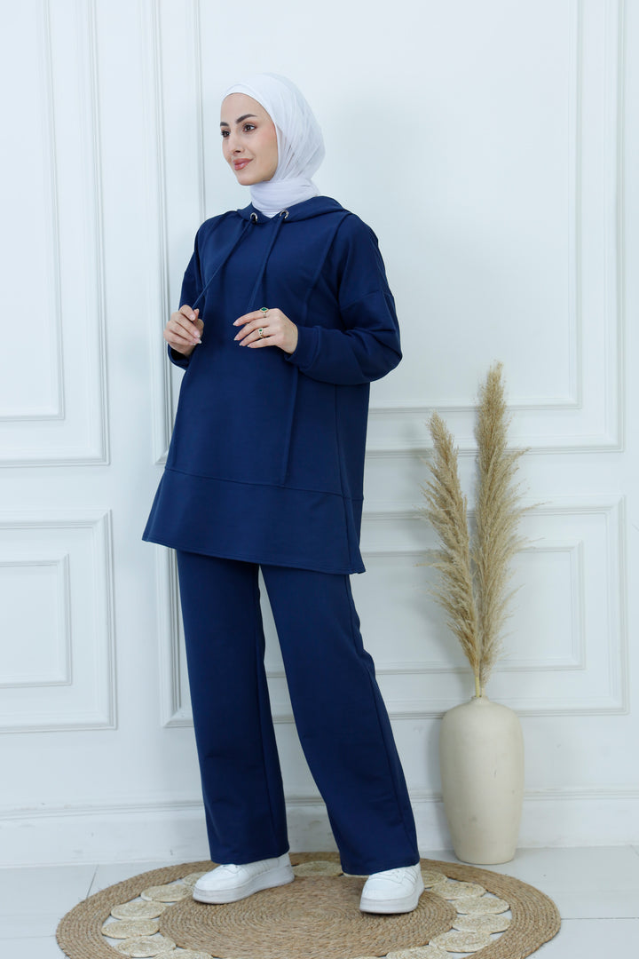 أحسن أسلوبك غير الرسمي مع مجموعة بدلة رياضية المريحة والمنسقة. تم تصميم الجزء العلوي كـ هودي بطول tunic، مما يوفر تغطية أساسية وقصة مريحة وغير ملتصقة. يتميز ب غطاء رأس بسلك سحب وجيب أمامي كبير. تكتمل المجموعة ب سروال مستقيم متطابق يضمن أقصى درجات الراحة وشكل محتشم. مصنوعة من قماش ناعم ودائم، هذه المجموعة المكونة من قطعتين مثالية للأيام النشطة، والسفر، أو الاسترخاء في المنزل بسهولة.
