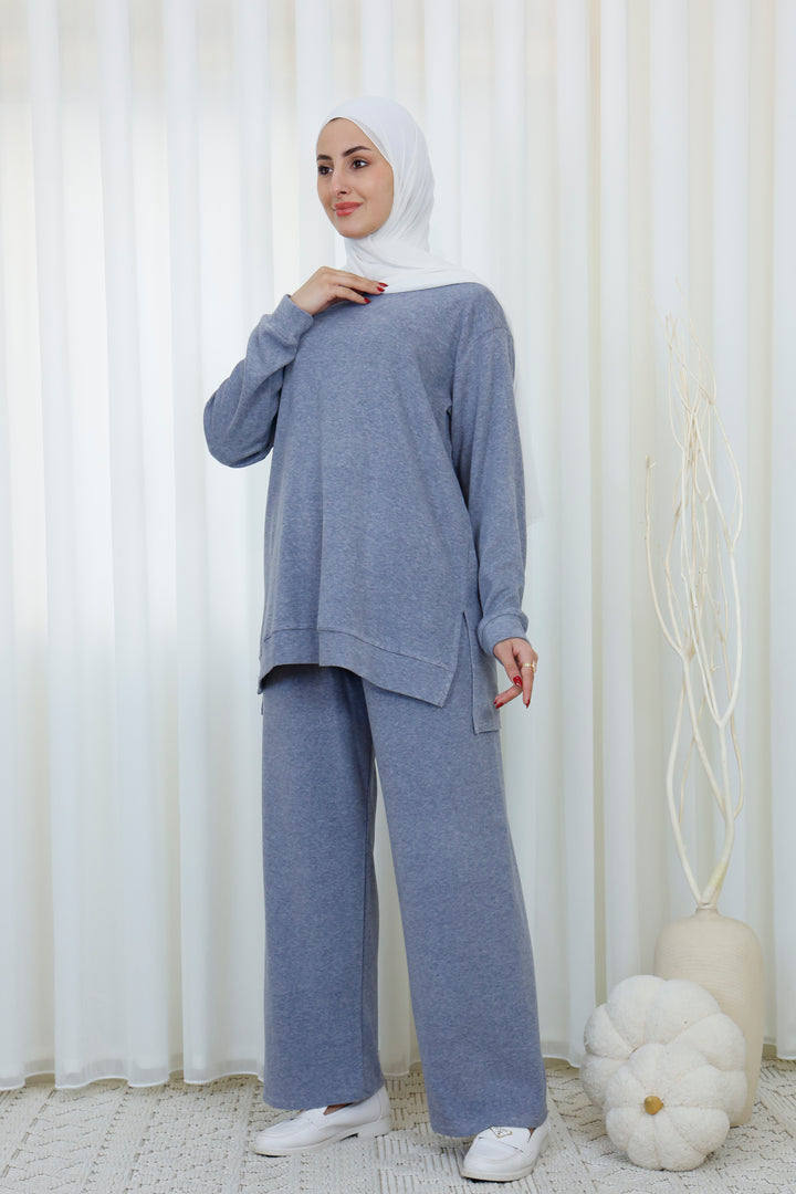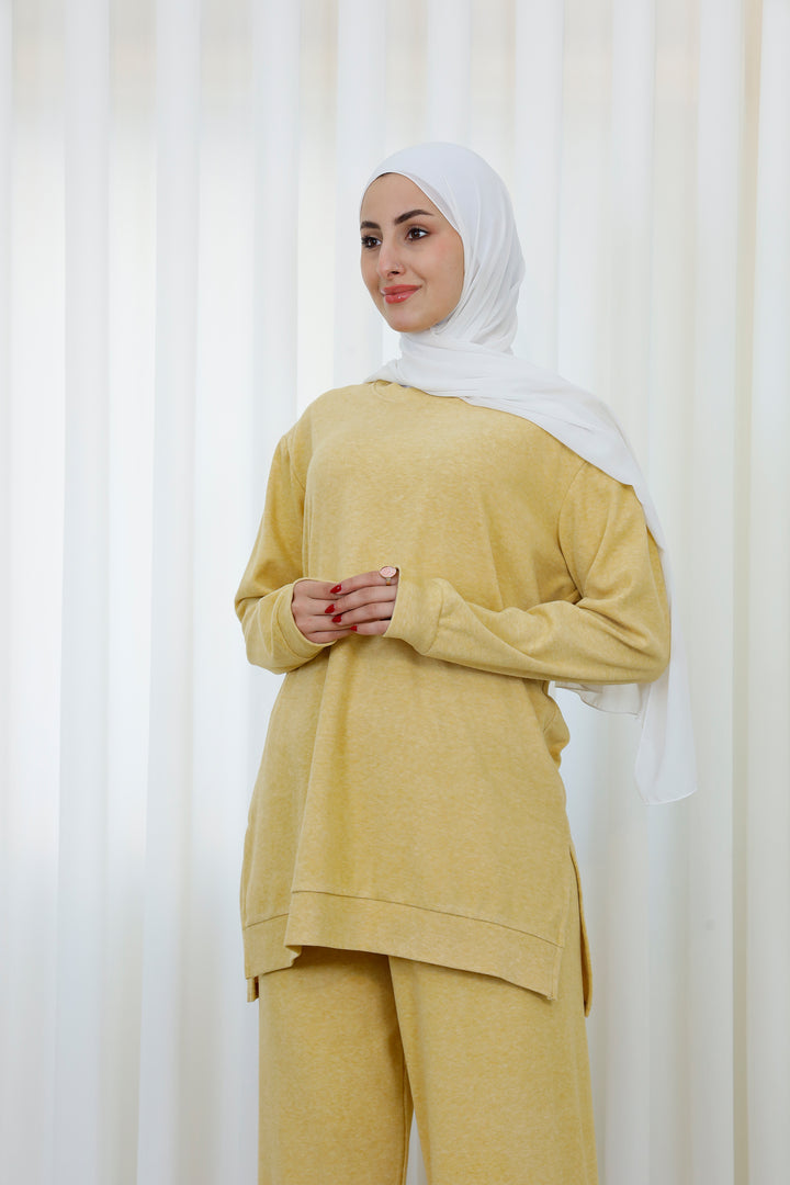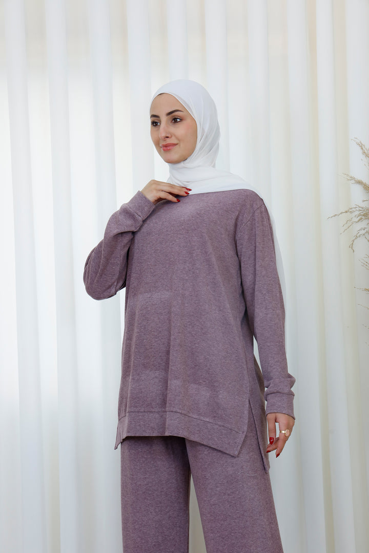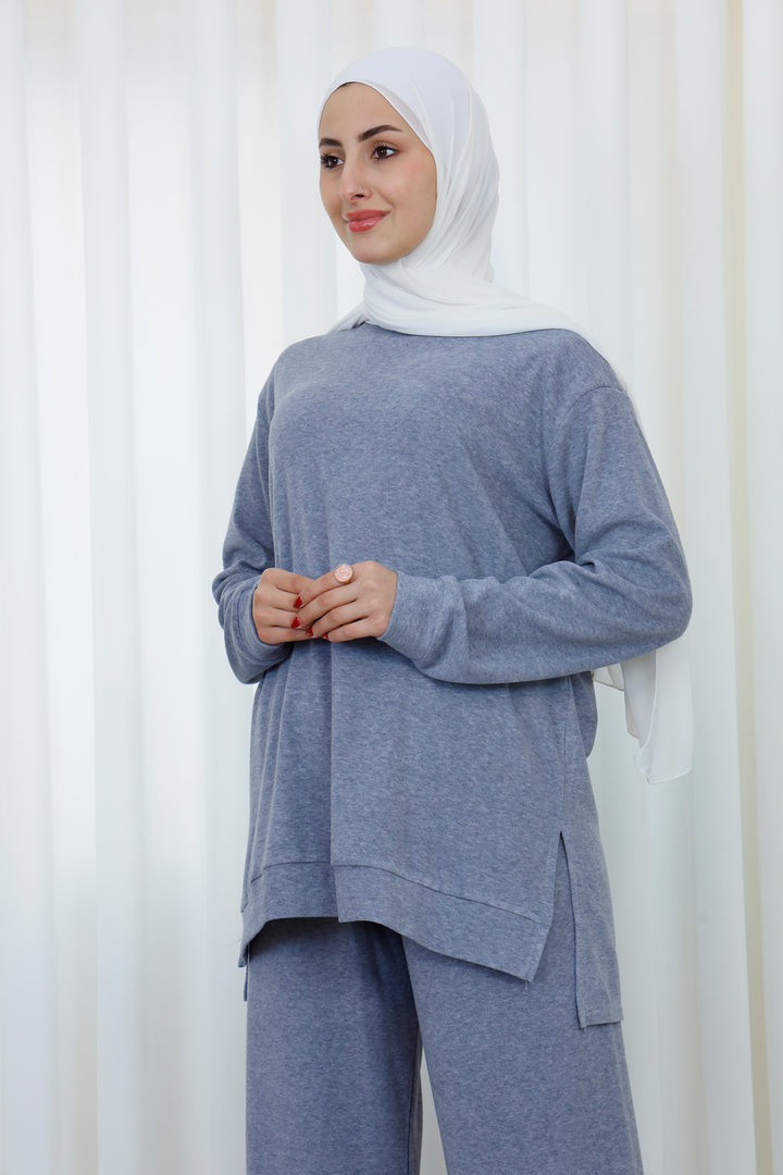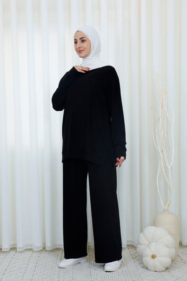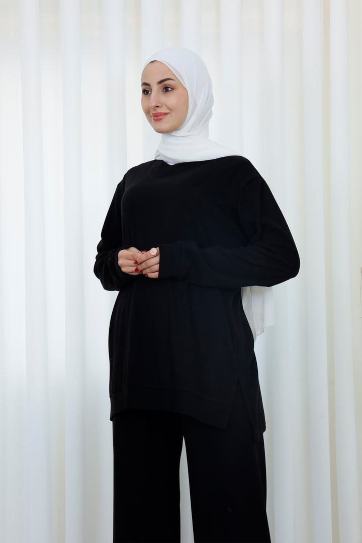 Enjoy sporty comfort and modest style with this two-piece tracksuit designed for relaxed movement and everyday wear. The top comes in a loose, longline cut with side slits, giving you full coverage while allowing easy mobility. The matching wide-leg pants offer a comfortable fit that feels light and effortless throughout the day.