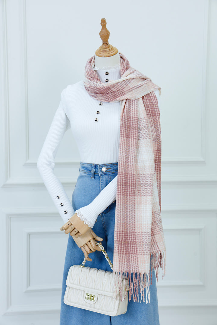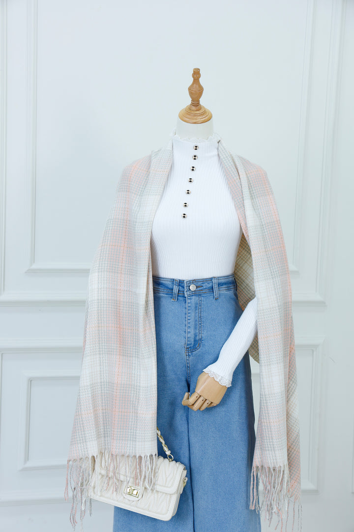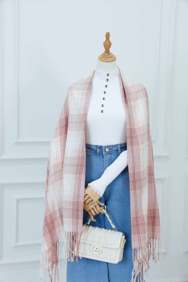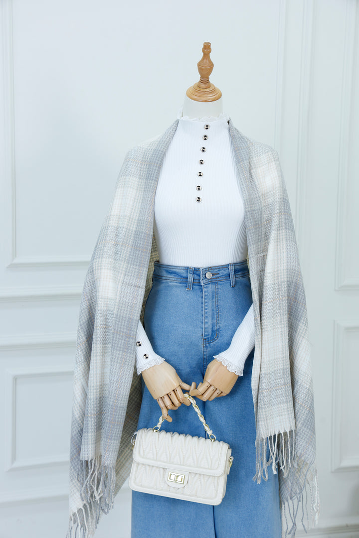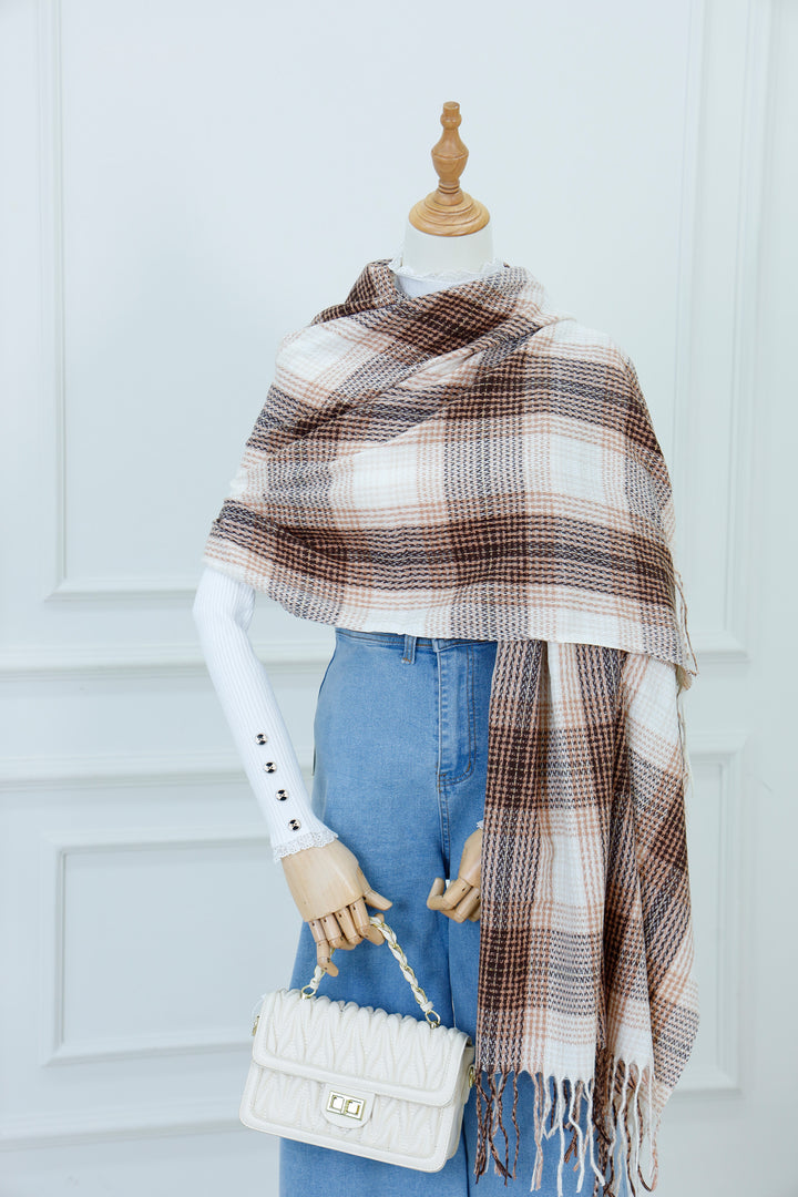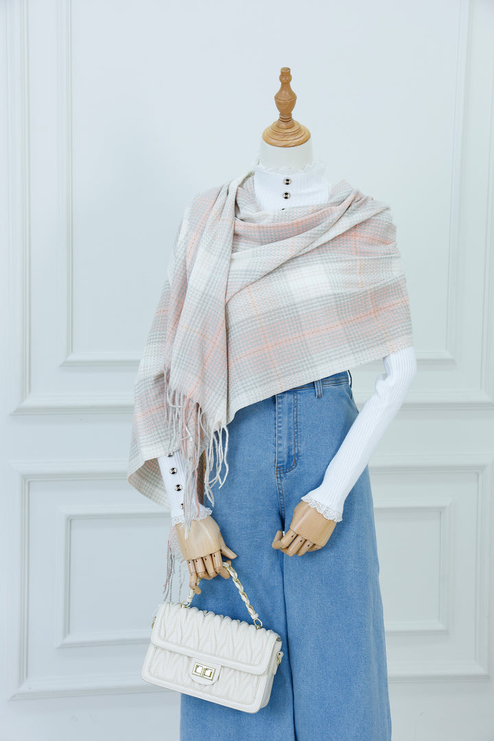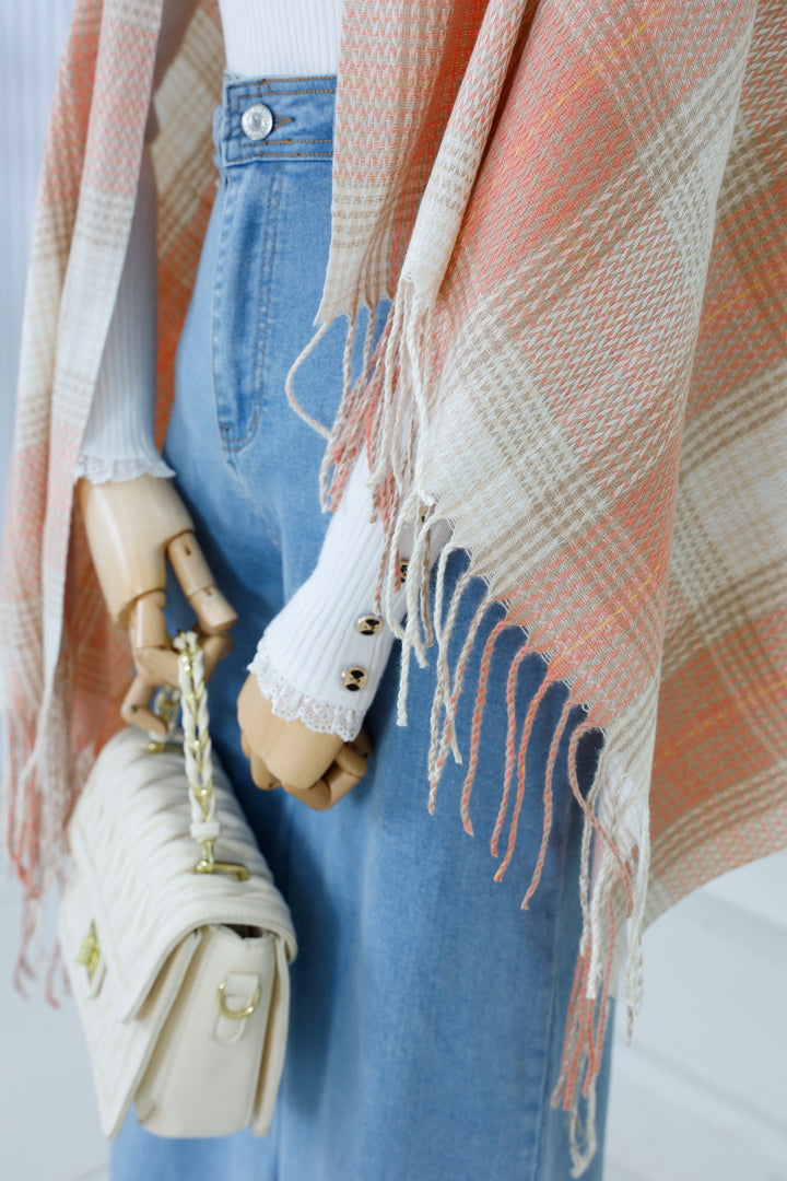 تتميز بنمط مربعات شامل خالدة على قاعدة ناعمة ومُنسوجة. الحجم الكبير والتصميم المفتوح يسمحان لها بالتدلي بشكل مريح على الأكتاف، مما يوفر بديلاً أنيقًا لجاكيت خفيف أو سترة. يتم إنهاء اللف بحافة مُزينة بالتطريز التقليدي على طول الحافة وحدود متباينة صلبة لمظهر نظيف ومنظم.