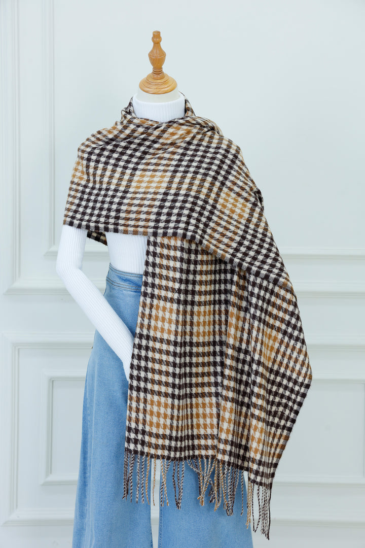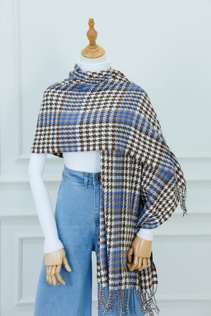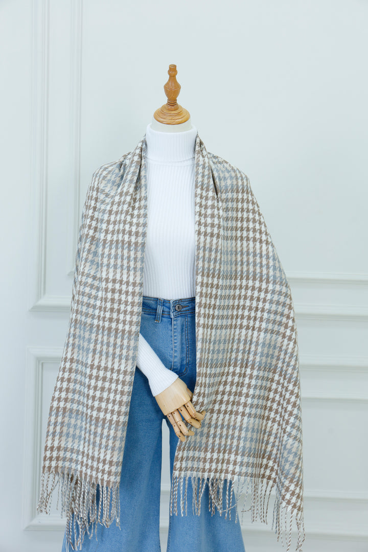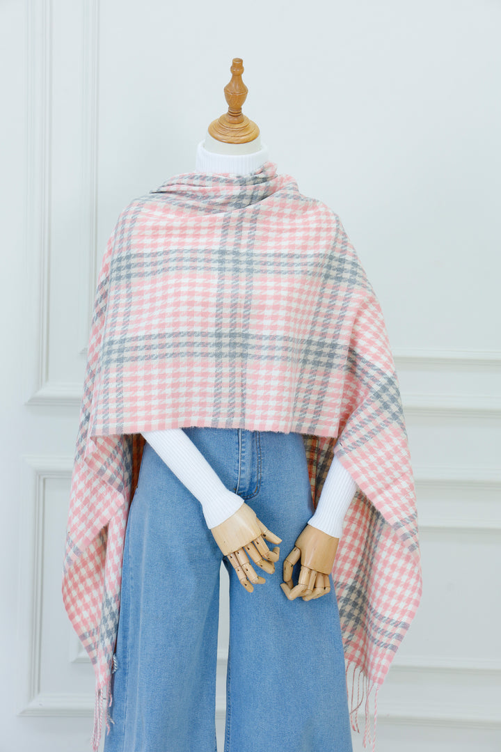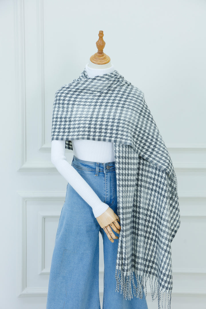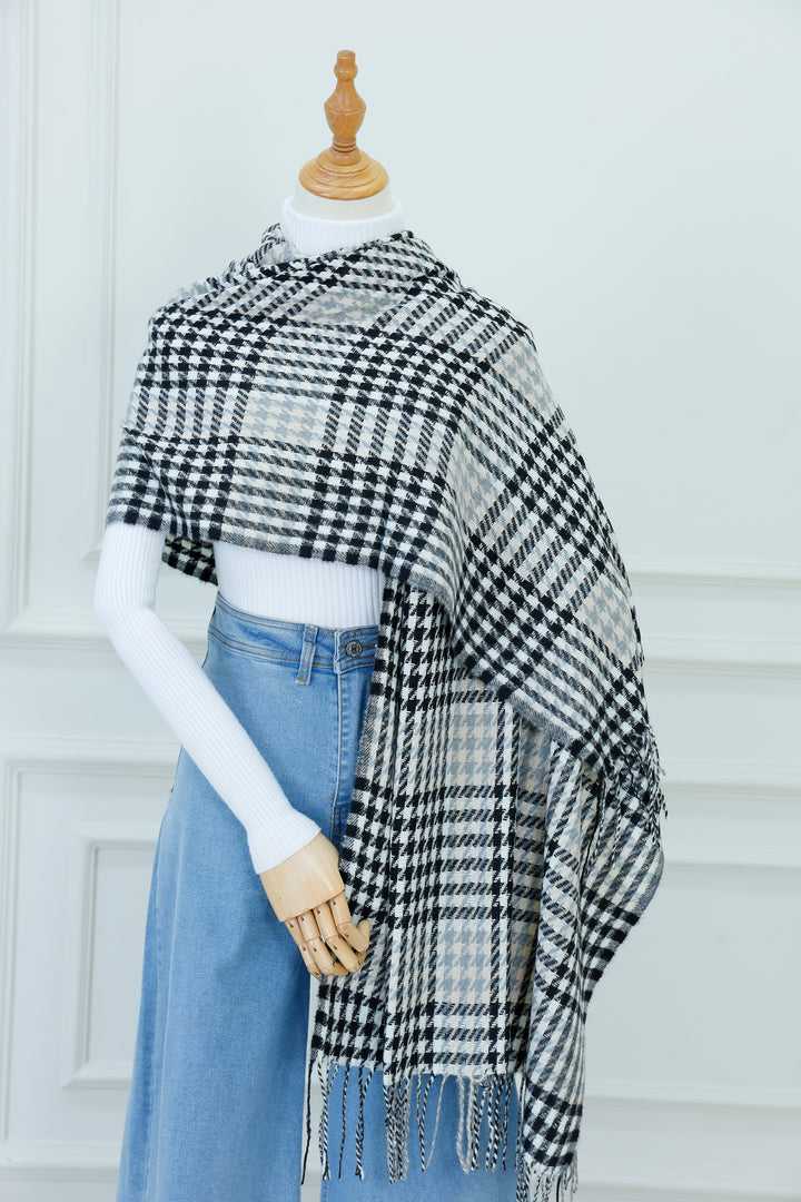 تتميز بنمط مربعات شامل خالد على قاعدة ناعمة ومُنسوجة. الحجم السخي والتصميم المفتوح يسمح لها بالتدلي بشكل مريح على الأكتاف، مما يوفر بديلاً أنيقًا لجاكيت خفيف أو سترة. اللفّة مُنتهية بحافة مُزينة بالتطريز التقليدي على طول الحافة وحدود متباينة صلبة لمظهر نظيف ومنظم.