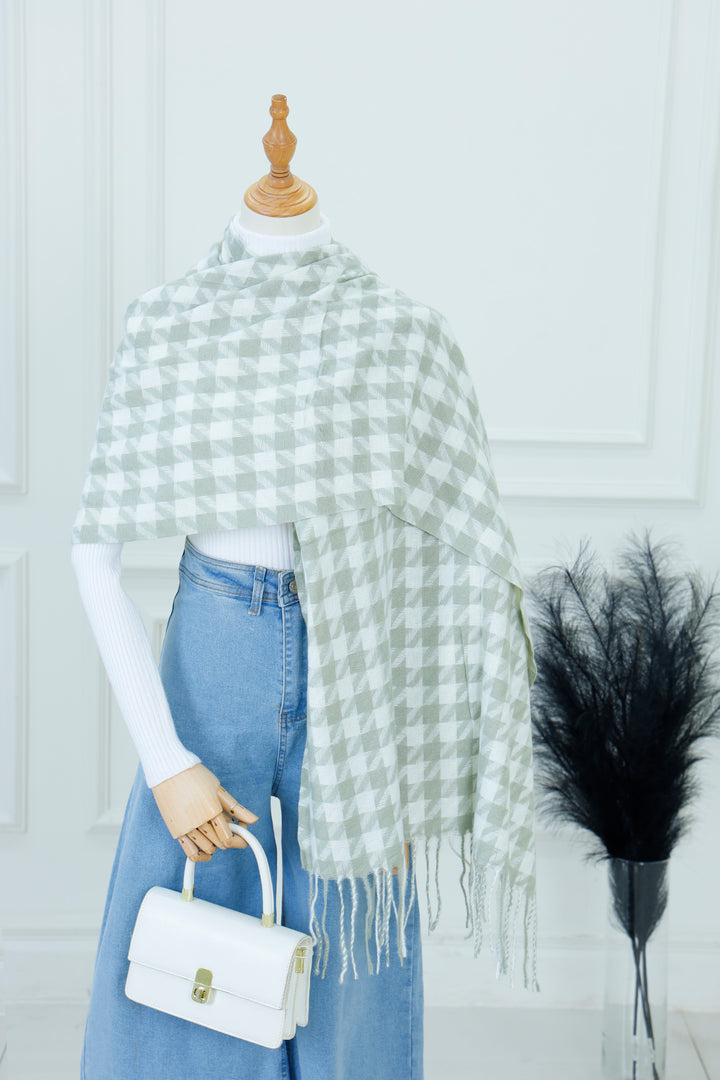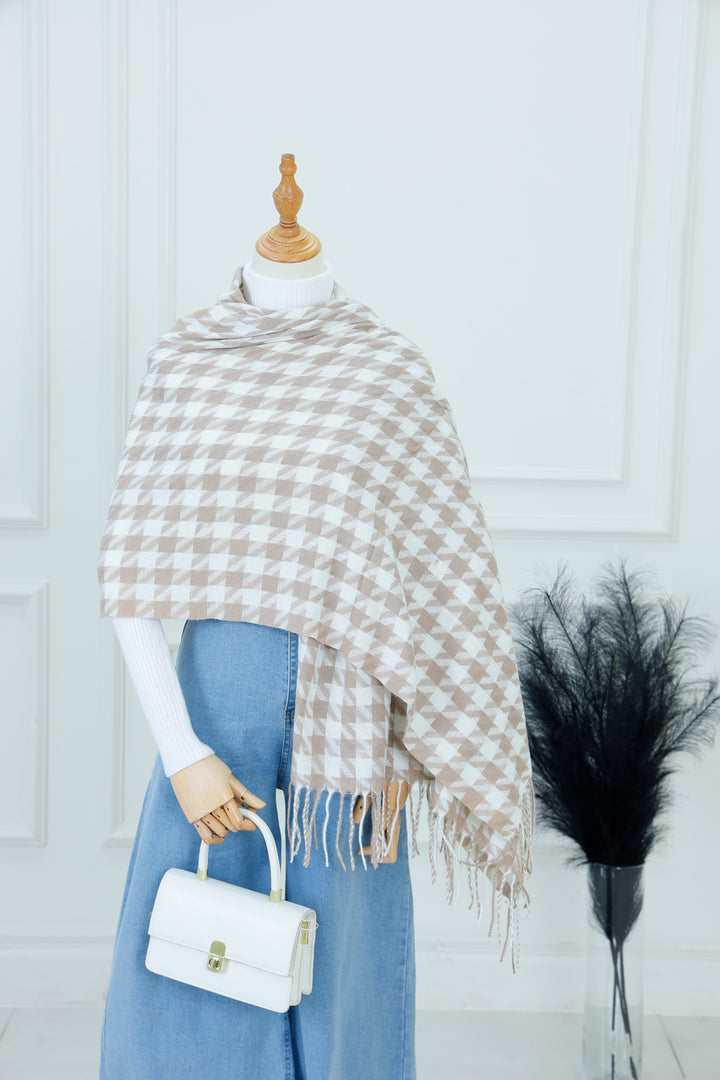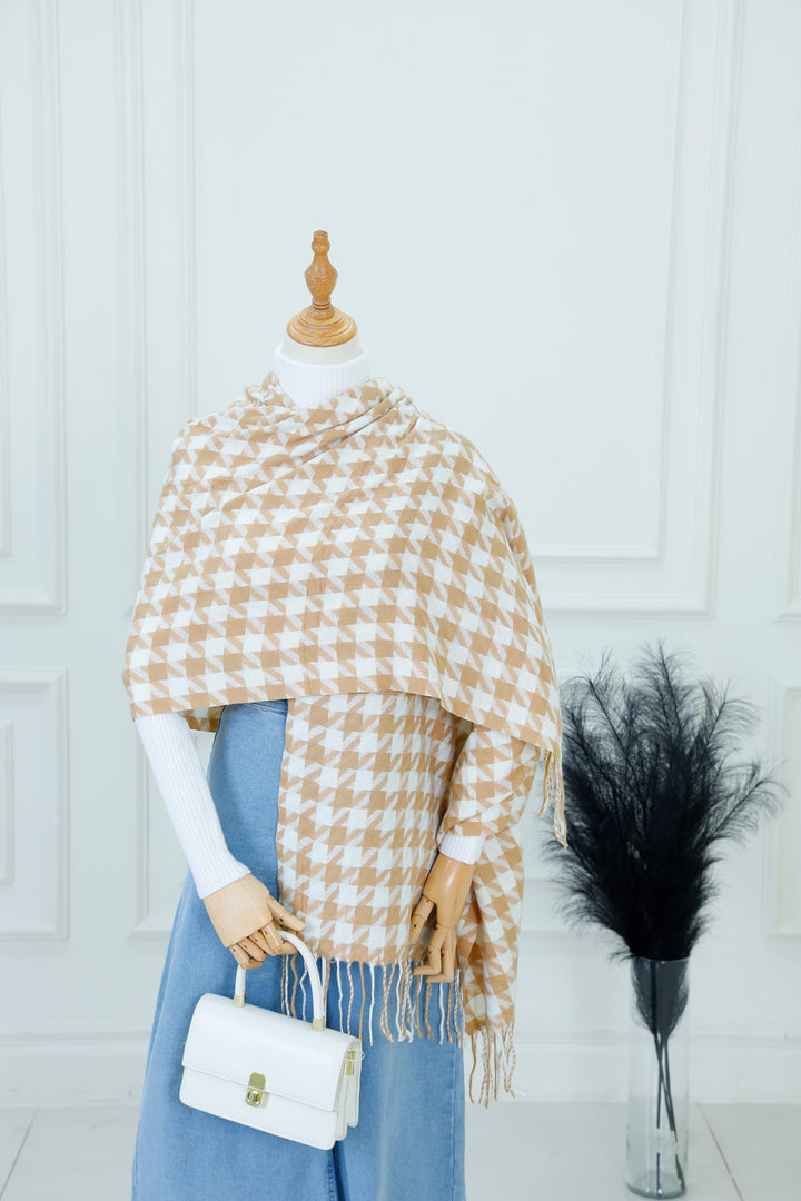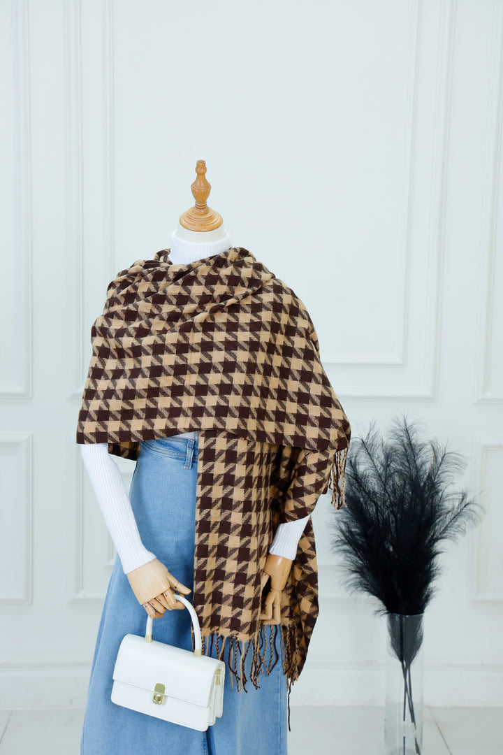 تتميز بنمط مربعات شامل خالدة على قاعدة ناعمة ومُنسوجة. الحجم السخي والتصميم المفتوح يسمحان لها بالتدلي بشكل مريح على الأكتاف، مما يوفر بديلاً أنيقًا لجاكيت خفيف أو سترة. يتم إنهاء اللف بحافة مُزينة بالتطريز التقليدي على طول الحافة وحدود متباينة صلبة لمظهر نظيف ومنظم.