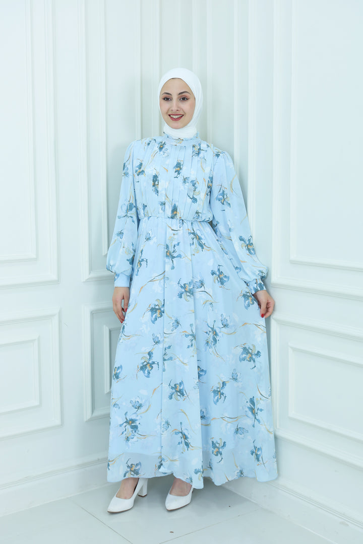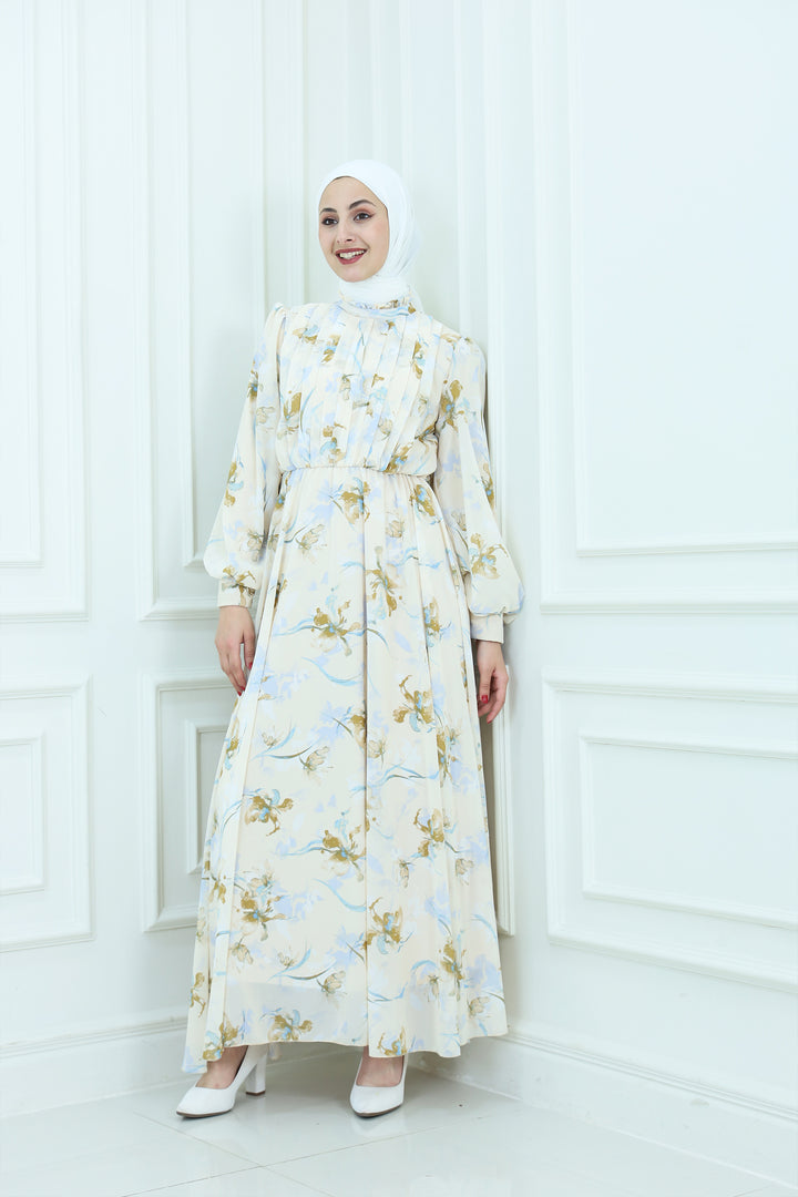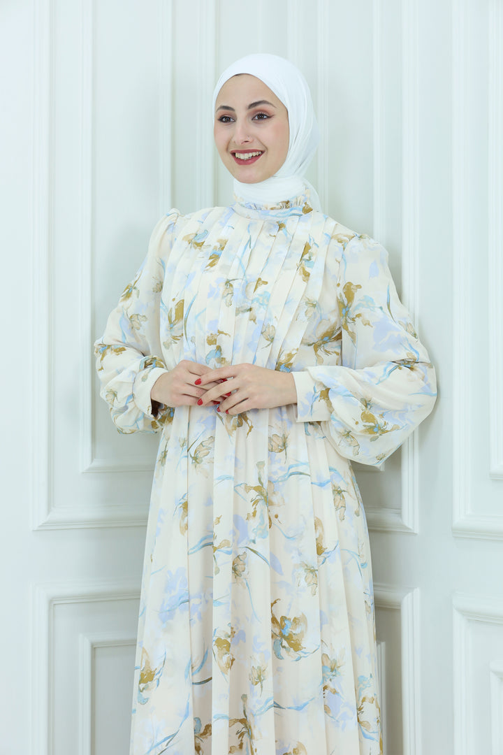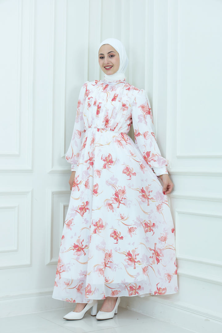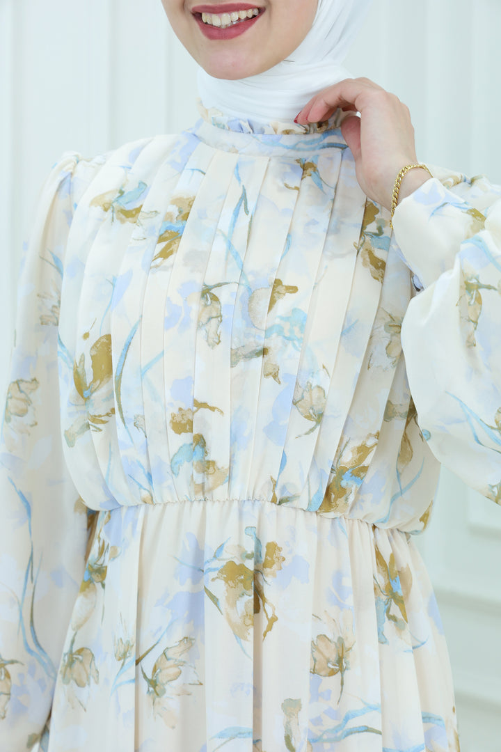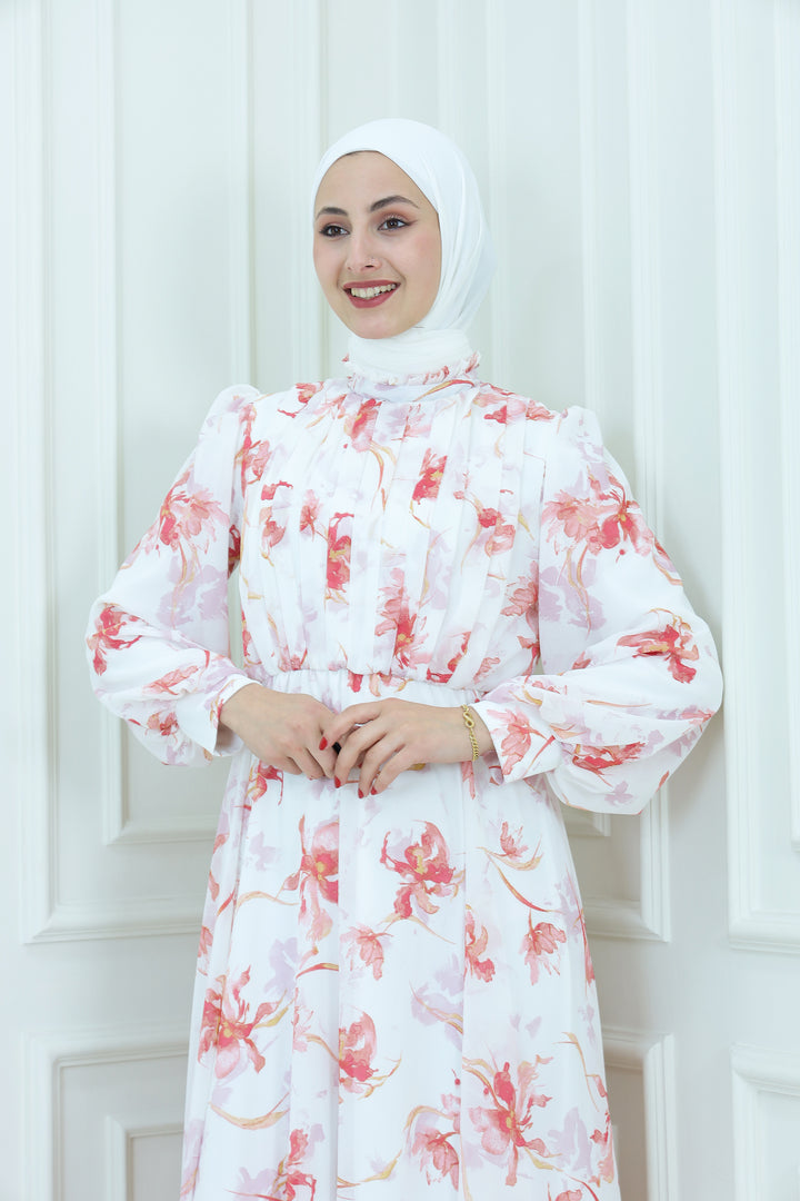 التفاصيل: فستان شيفون فلوري مزخرف بالثنيات