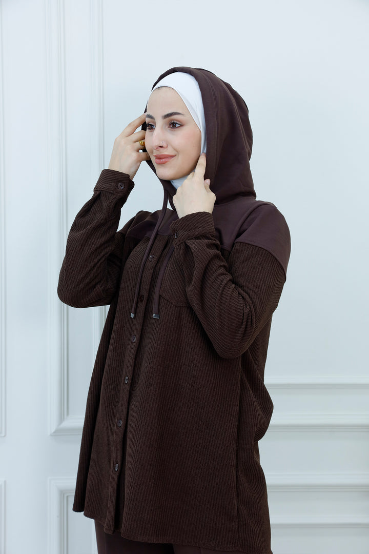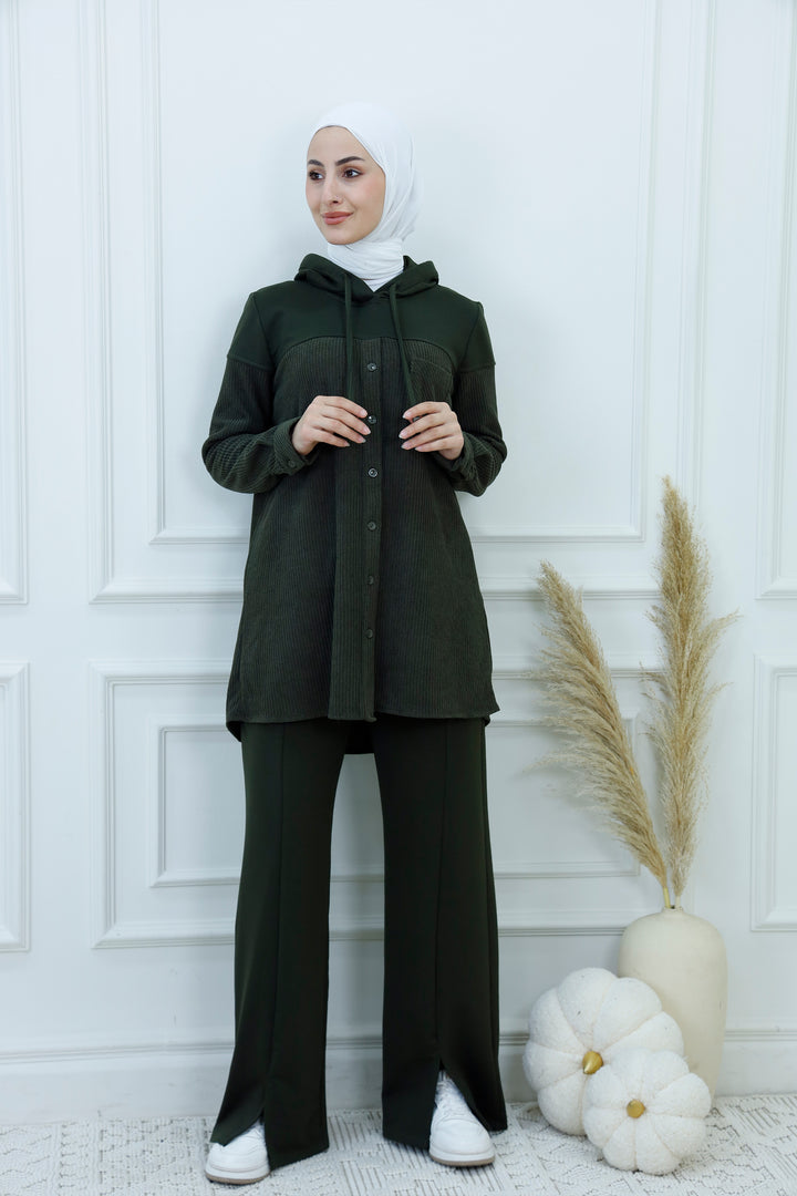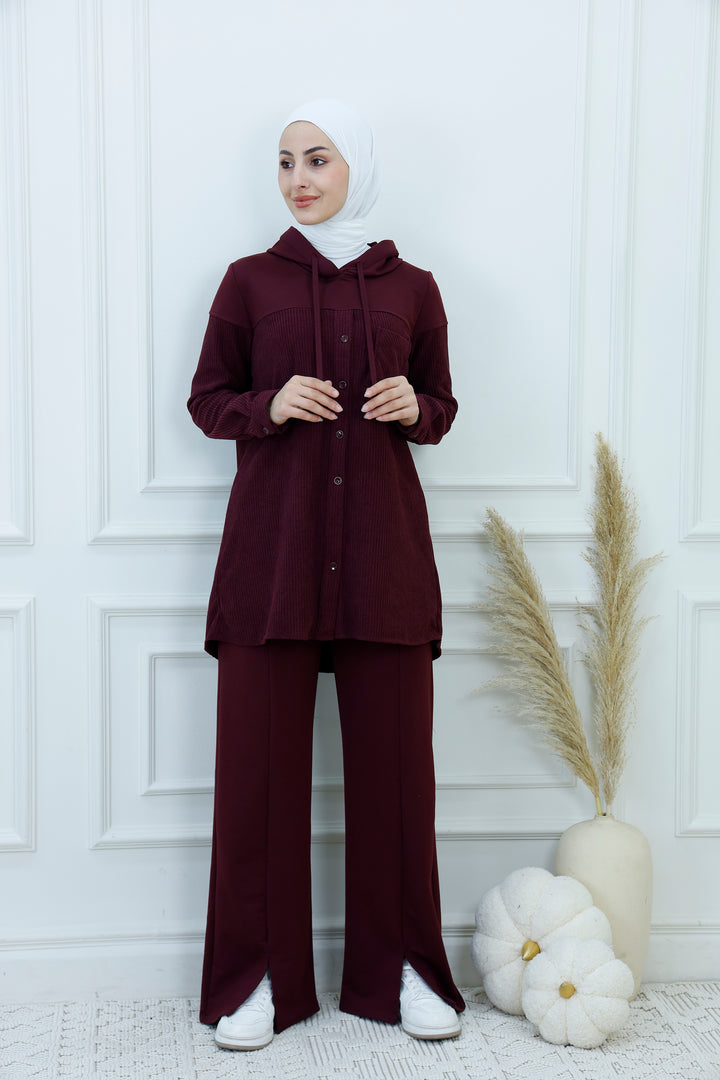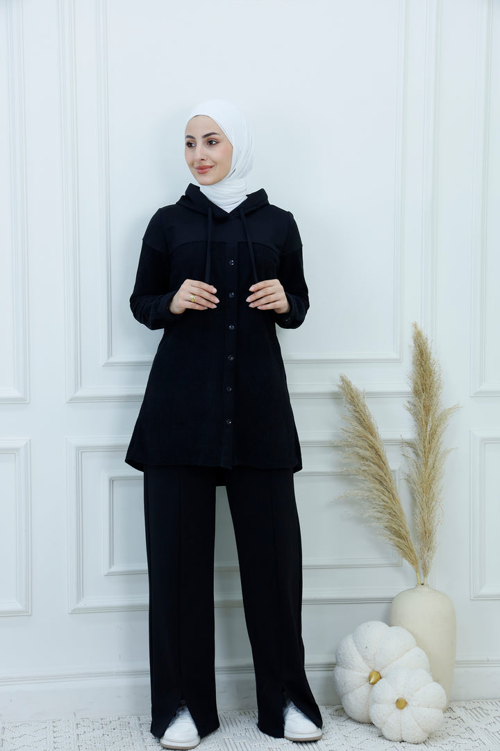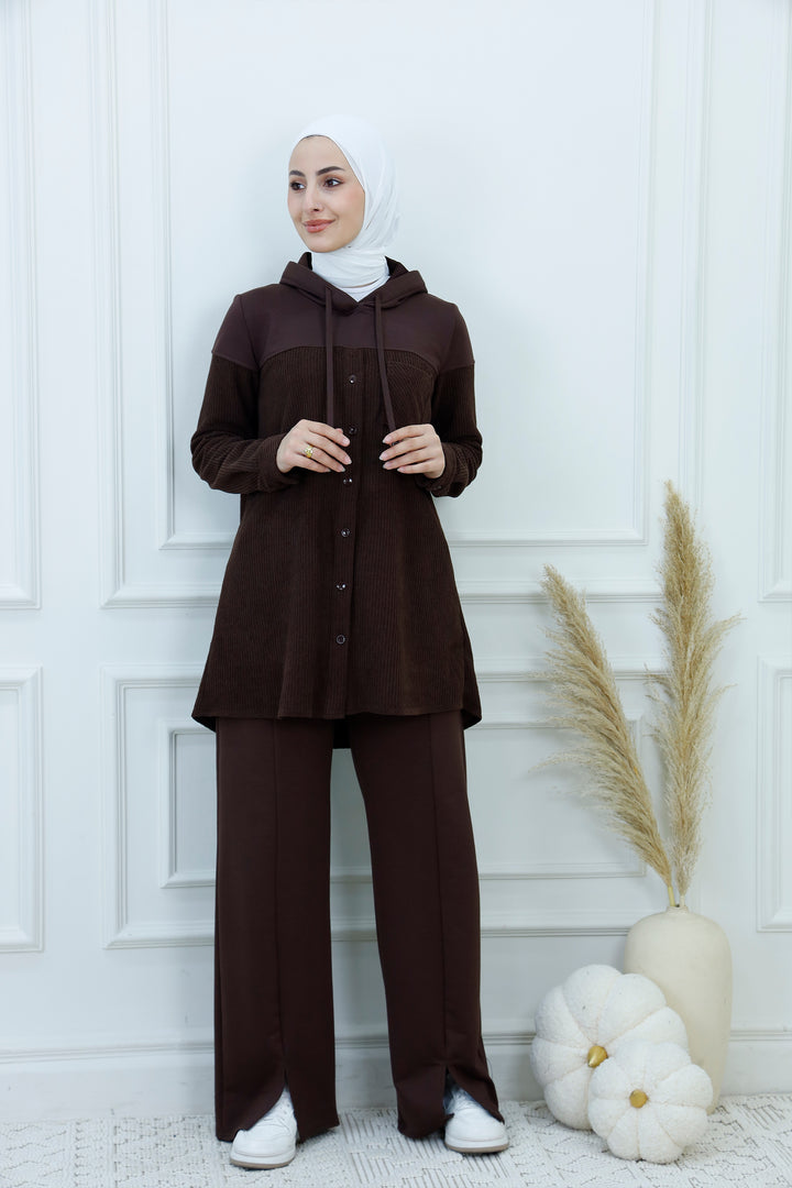 حقق مظهرًا رياضيًا أنيقًا مع مجموعة البدلة الرياضية المنسقة بشكل مثالي. الجزء العلوي هو هودي طويل الخط، بسحاب كامل يتميز بتصميم فريد: لوحة محبوكة ذات نسيج، مضلعة عبر الصدر والكتفين مقترنة بقماش ناعم في النصف السفلي والأكمام. يضيف هذا التباين اللافت عمقًا وأناقة فاخرة. يضمن طول التونيك السخي تغطية مريحة فوق الوركين، وتكتمل الإطلالة بـ سروال واسع متناسق للحصول على شكل متوازن ومريح. مجموعة أساسية لأناقة بلا جهد وراحة طوال اليوم.