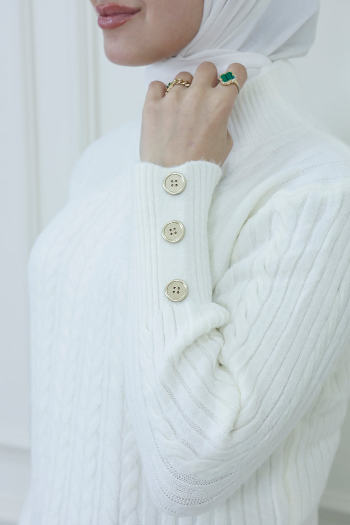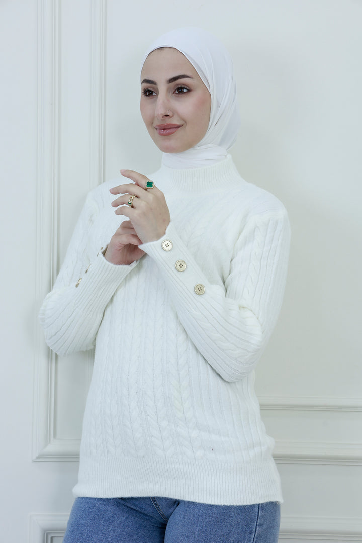 ابق دافئًا بأناقة مع هذا السويتر الأنيق المحبوك بكابل، المصمم للراحة والرقي. يتميز بياقة عالية، ونسيج مضلع، وأزرار زخرفية على أساور الأكمام، هذا القطعة تمزج بين السحر الكلاسيكي والتفاصيل الحديثة. يوفر النسيج الأبيض الناعم مظهرًا نظيفًا ومتعدد الاستخدامات مثاليًا للموضة المحتشمة، وتنسيق الشتاء، أو الاستخدام اليومي.