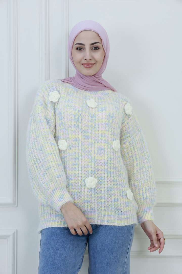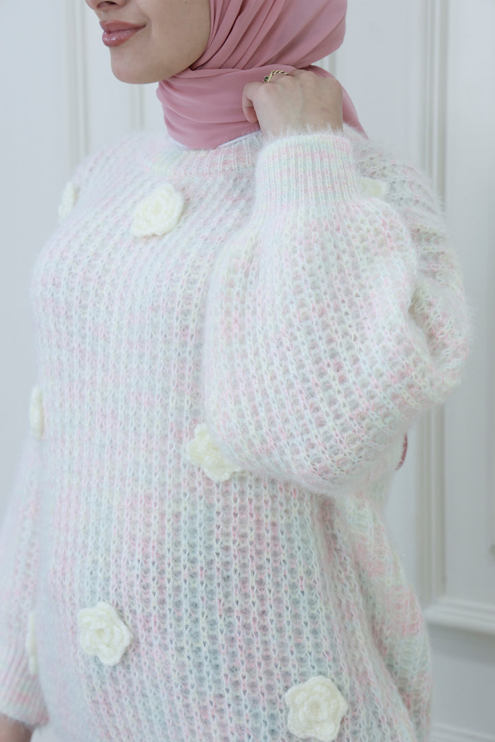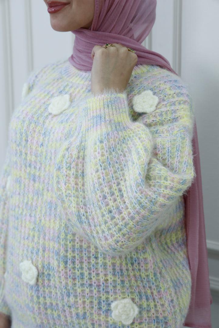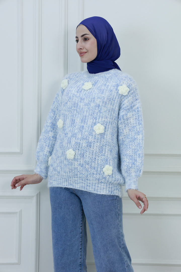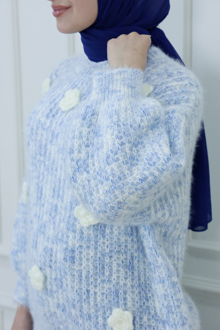 اصنع بيانًا مريحًا مع هذا السويتر المحبوك بتطريز زهور، المصمم للنعومة والسحر. يتميز بقماش محبوك بلون أزرق فاتح وأبيض، وتفاصيل زهور بيضاء دقيقة، وتفاصيل بوم بوم متناثرة، يجلب هذا السويتر أناقة مرحة للأزياء المحتشمة. يوفر التصميم المريح والياقة العالية الراحة والتغطية، مما يجعله مثاليًا للتنسيق في المواسم الأكثر برودة.