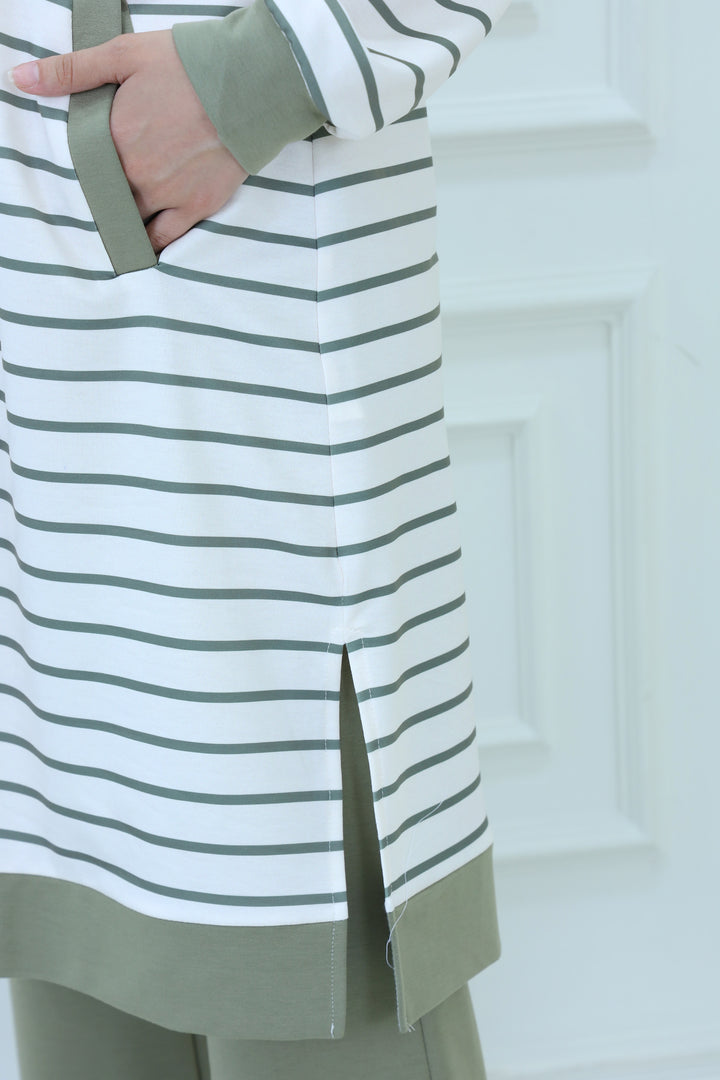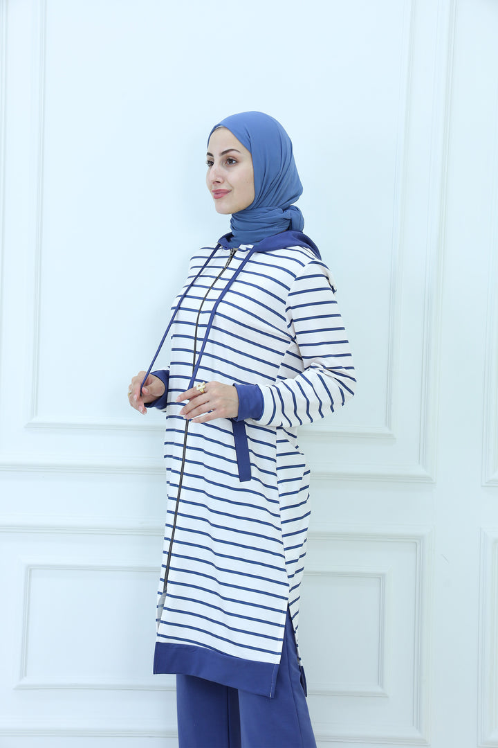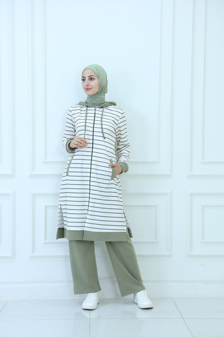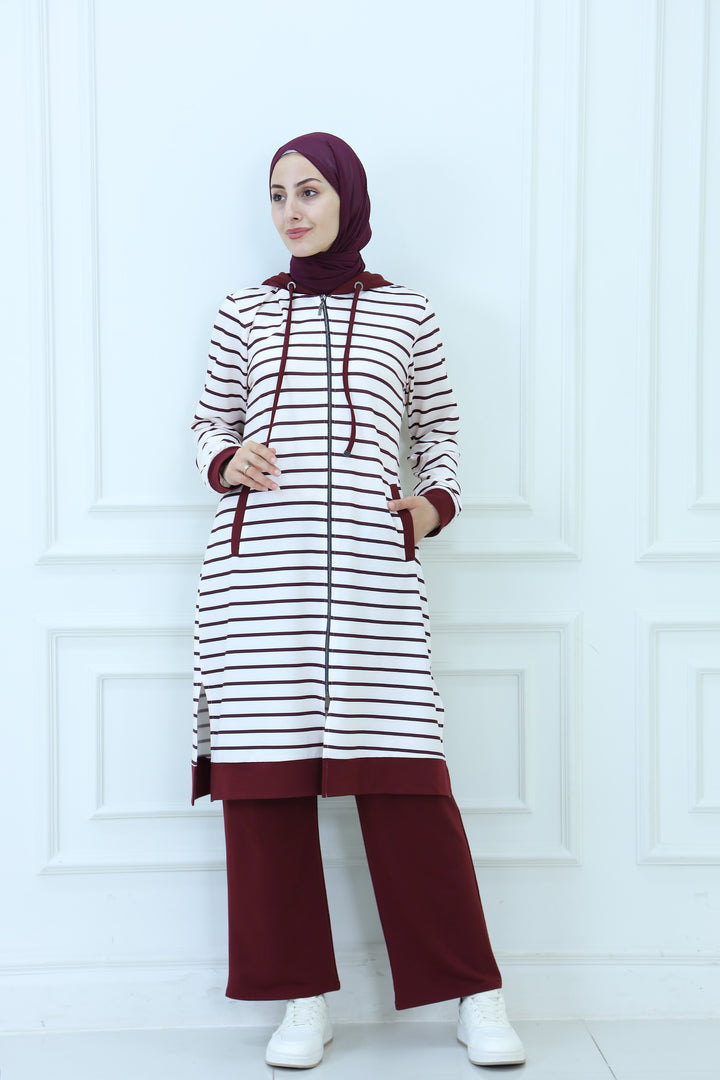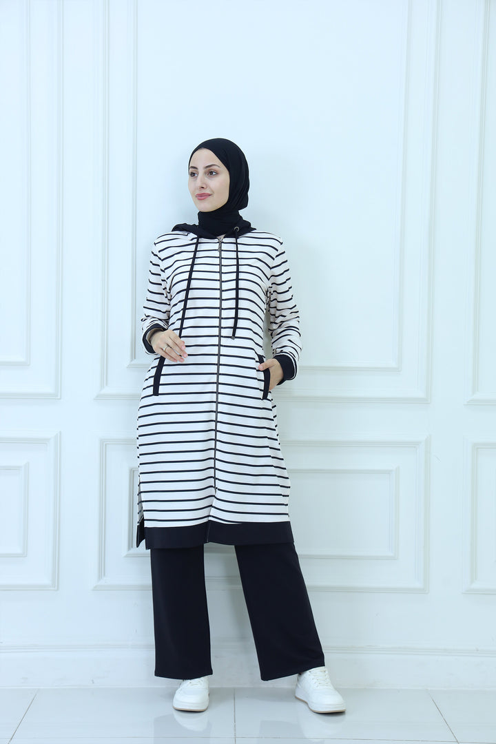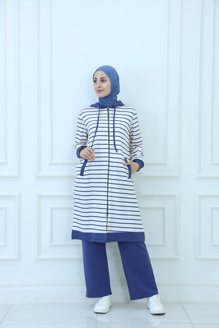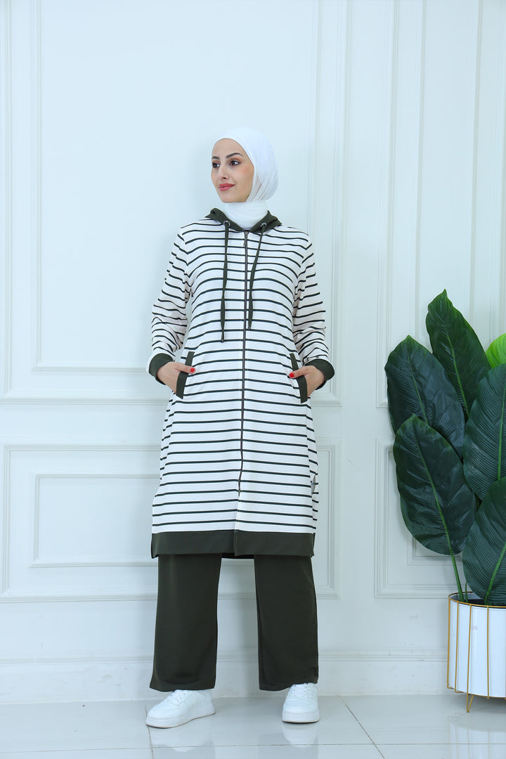 مجموعة أنيقة ومريحة تتكون من سترة هودي مخططة طويلة بسحاب أمامي وسروال واسع متناسق. مصممة للاستخدام اليومي، توفر ملاءمة مريحة، تغطية كاملة، ومظهر رياضي أنيق مثالي للخروجات غير الرسمية أو السفر.