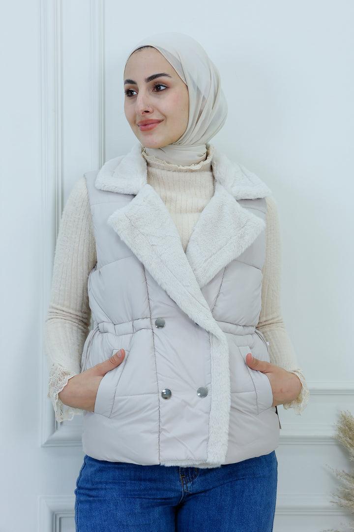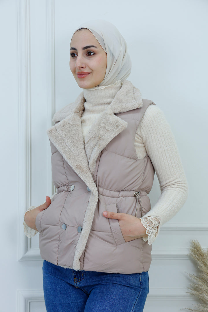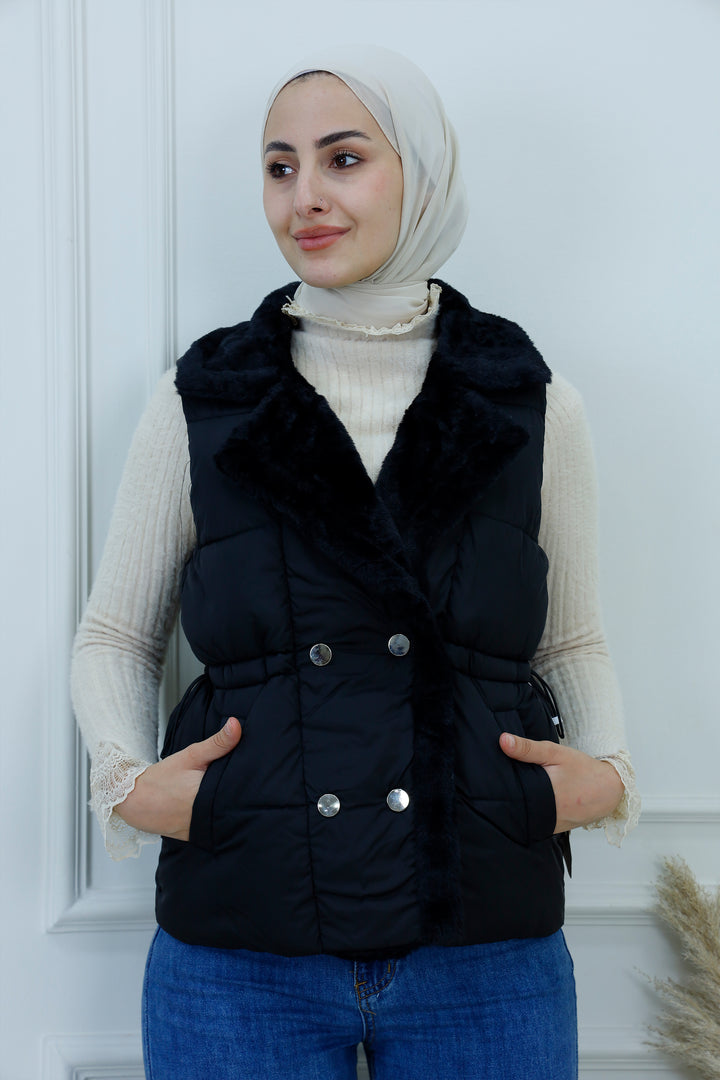 تعتبر هذه السترة النسائية المبطنة بحواف من الفرو قطعة مريحة للتنسيق في الأيام الباردة. مصممة بشكل بلا أكمام، مع إغلاق مزدوج الأزرار، وخصر قابل للتعديل بحبل، تجمع بين الدفء والملاءمة الجذابة. تضيف بطانة الفرو الصناعي الناعمة على الياقة لمسة من الأناقة، بينما تجعلها القوام المبطّن والجيوب الجانبية أنيقة وعملية. مثالية للتنسيق مع القمصان ذات الياقة العالية، الجينز، أو الأحذية.