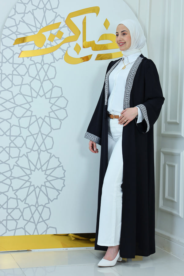 Details: Elegant open front jacket with delicate embroidery on the cuffs and hem. A stylish and modest layering piece for both casual and formal outfits Care Instructions: Handwash or on...