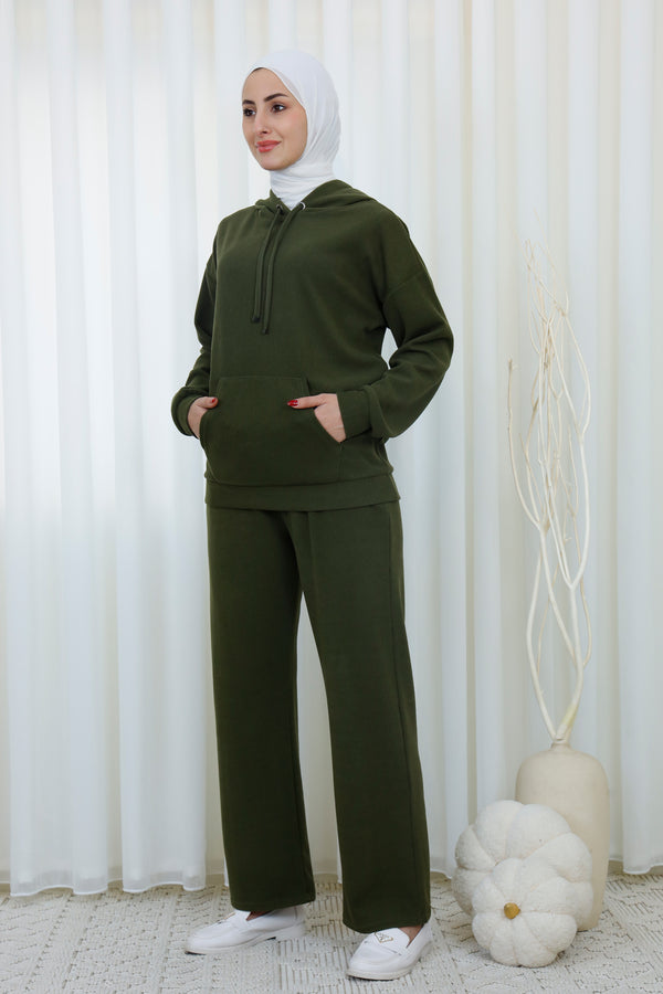 Product Description Enjoy cozy comfort and sporty modest style with this ribbed two-piece tracksuit. The top features a relaxed hoodie design with adjustable drawstrings and a kangaroo pocket for a...