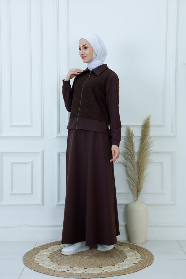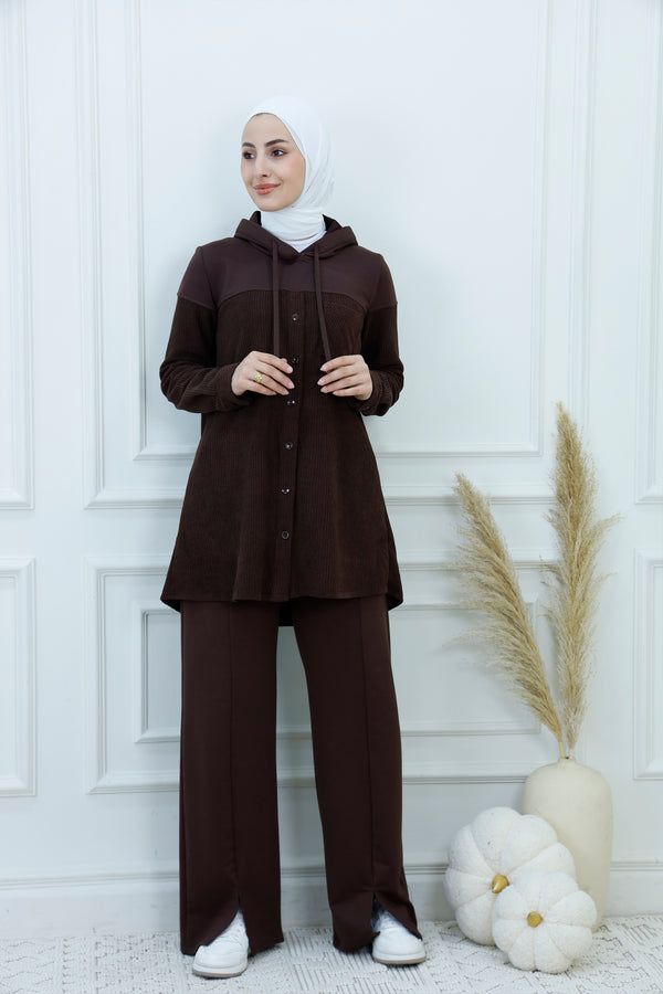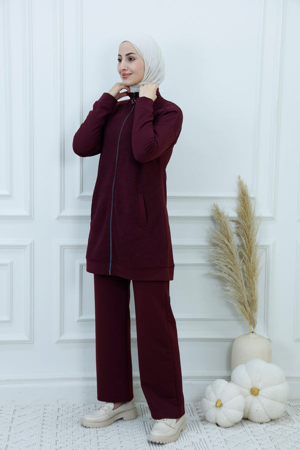 Product Description: Stay warm and stylish with this ribbed tracksuit, featuring a long zip-up hoodie with a drawstring hood and matching wide-leg pants. Designed for modest comfort, the hoodie includes...