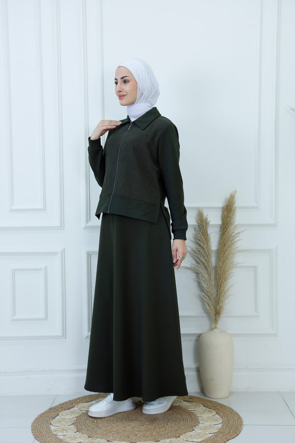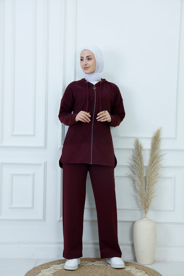 Product Description: Stay warm and stylish with this ribbed tracksuit, featuring a long zip-up hoodie with a drawstring hood and matching wide-leg pants. Designed for modest comfort, the hoodie includes...