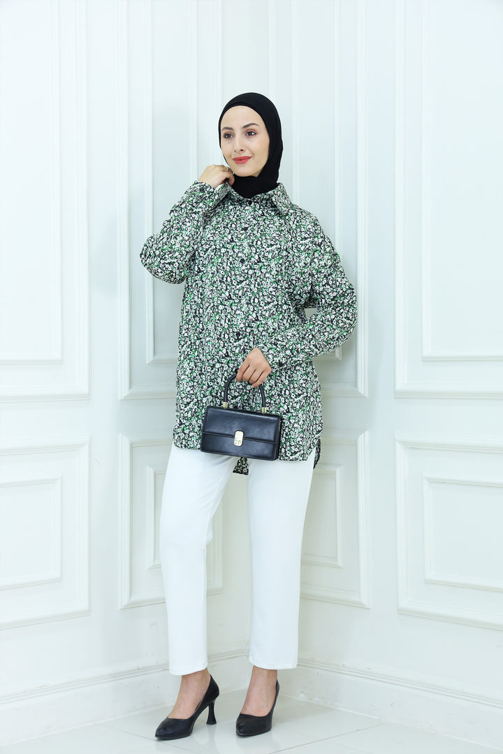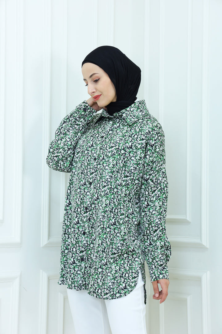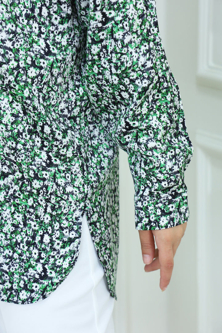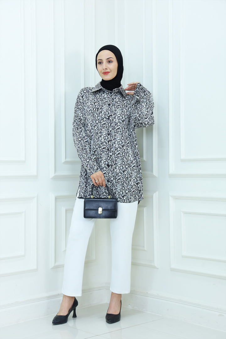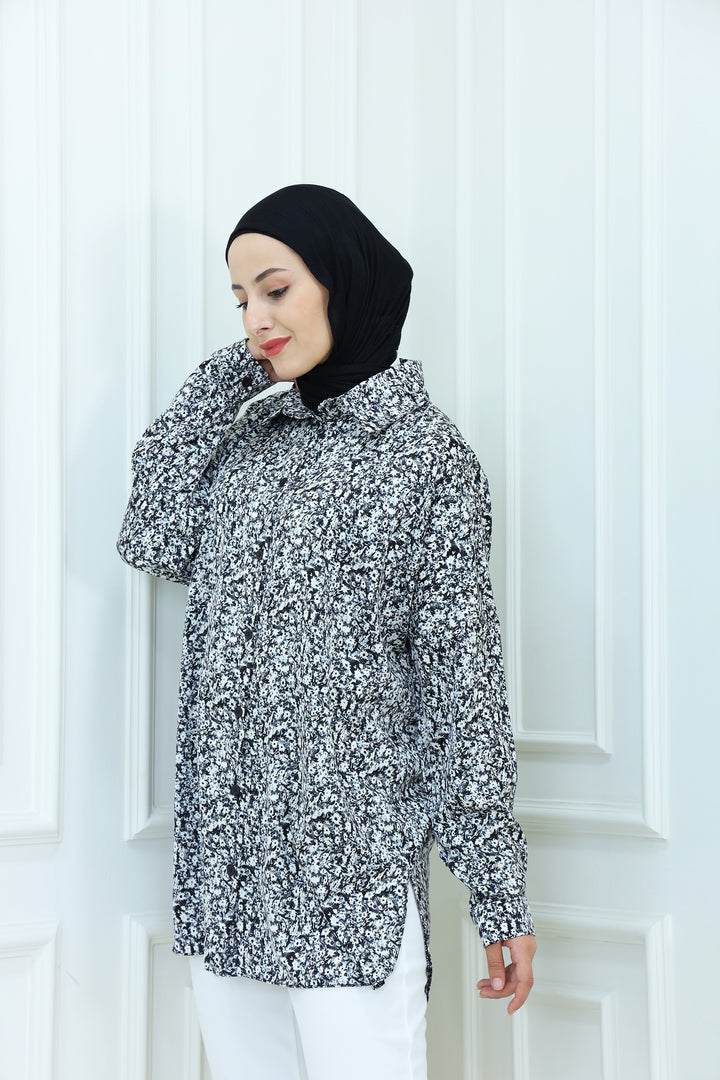 Boyfriend-Fit shirt with an all-over abstract floral-style print. Designed with a relaxed fit, shirt collar, and button-down front—perfect for modest styling or layering. A statement piece that blends comfort with vibrant artistic detail