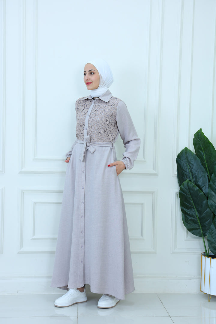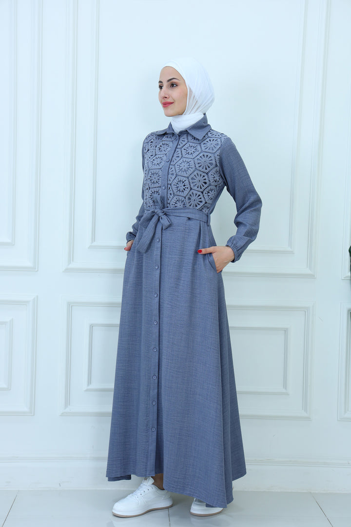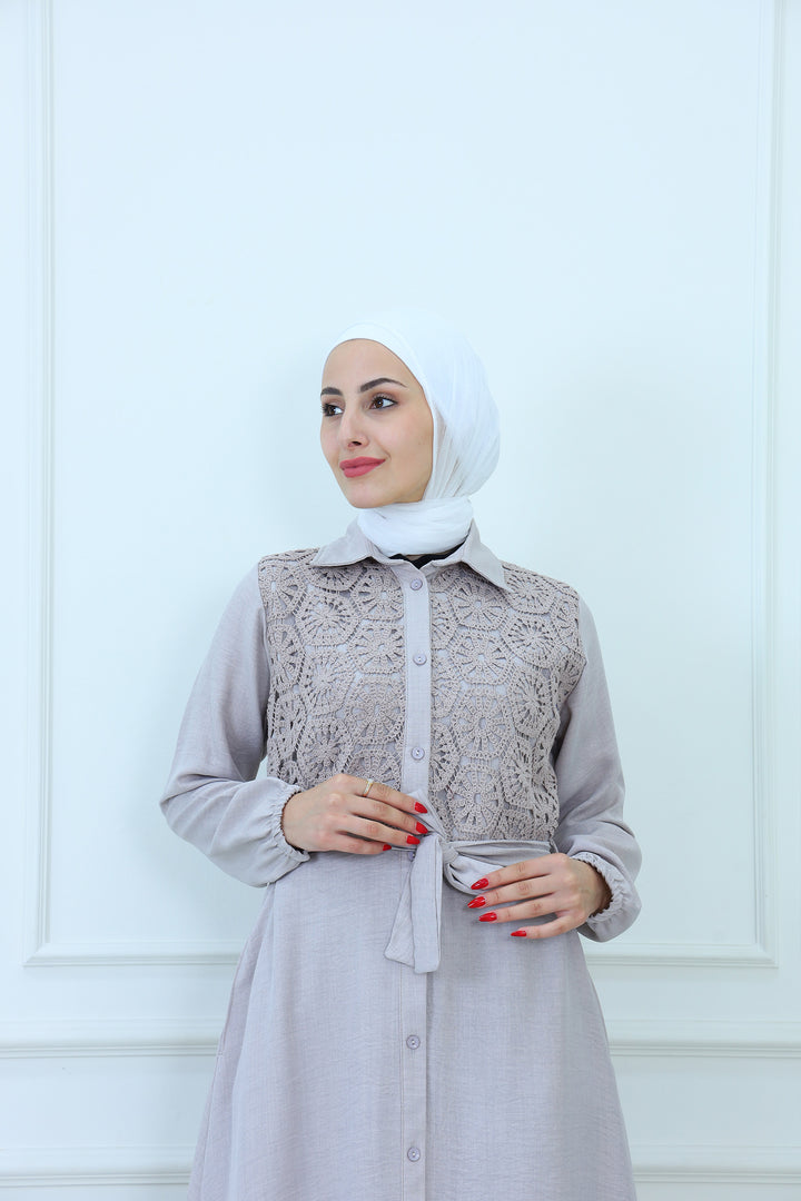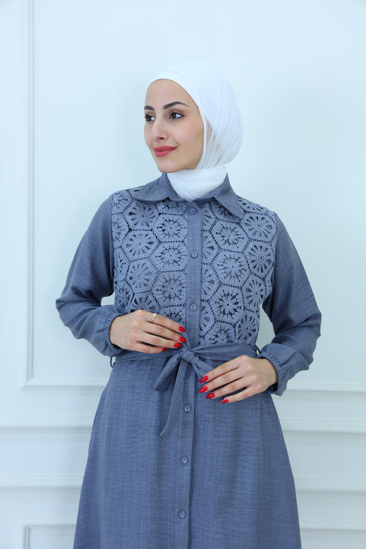 Details: Chic meets comfort in this button-down maxi dress, featuring an intricate crochet bodice, flattering tie-waist, and soft fabric for a modest yet stylish look