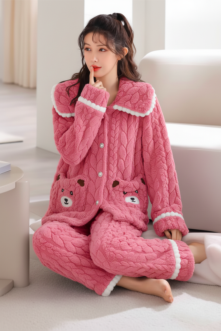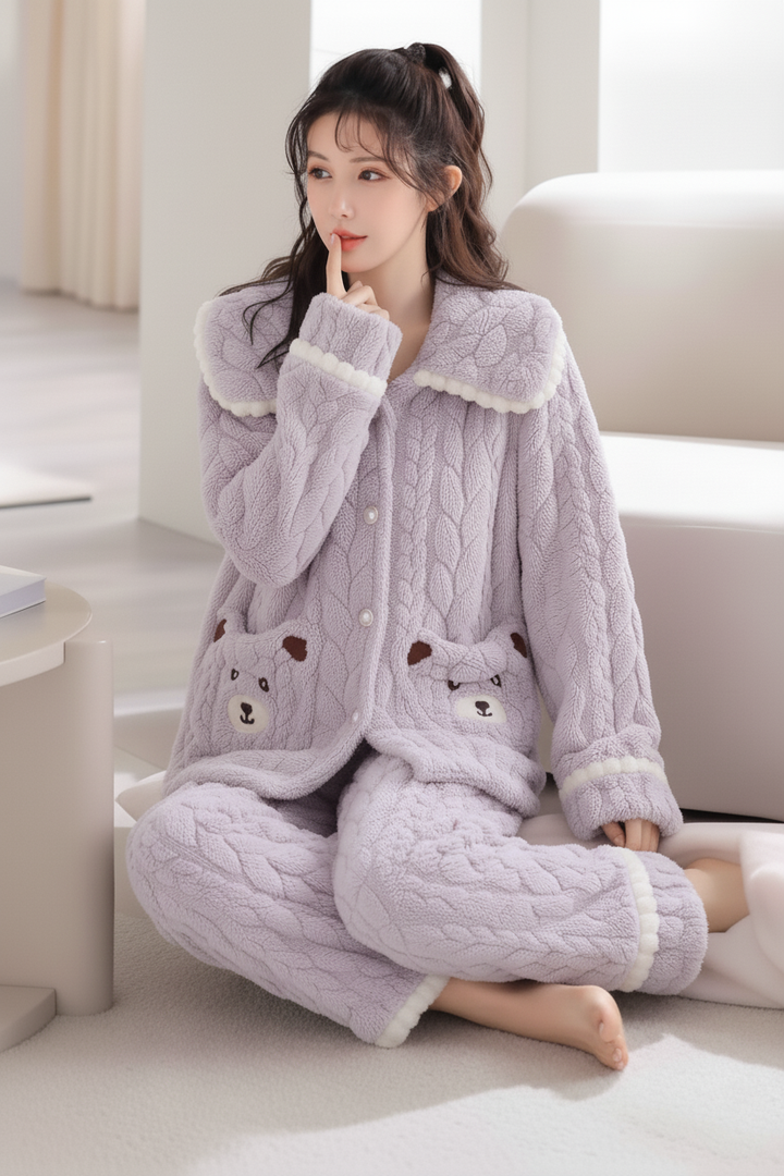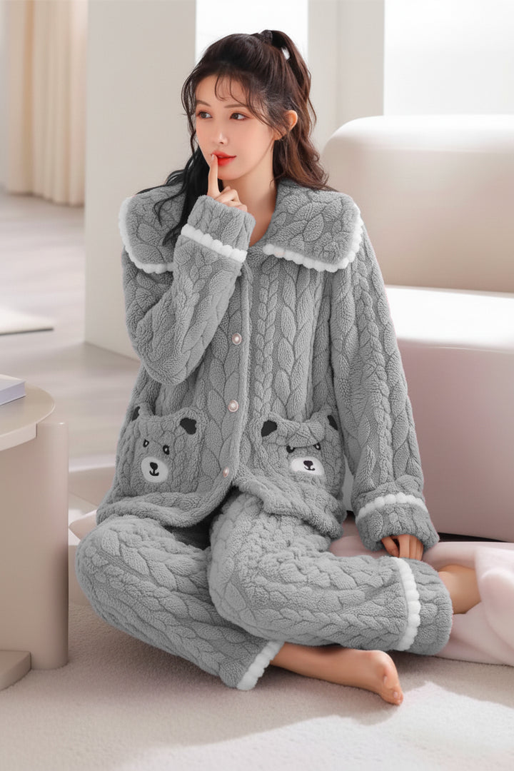 Elevate your cozy experience with this luxuriously soft two-piece home set. Designed for ultimate warmth, this suit stands out with its unique wide lapel collar and charming button-up front. The entire look is finished with a delightful ribbed texture and features two sweet, embroidered teddy bear pockets for a touch of playful style. Perfect for lounging, relaxing, or enjoying a slow weekend morning, this set promises an unmatched level of comfort and a chic, feminine at-home look. It's the perfect treat for yourself or a loved one this winter.