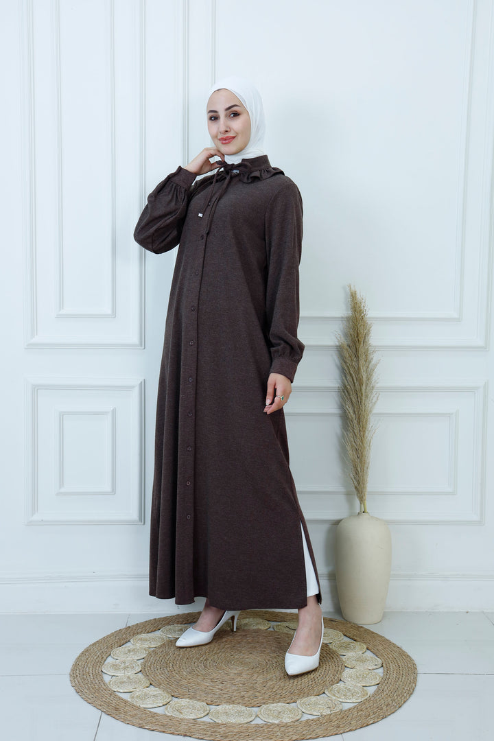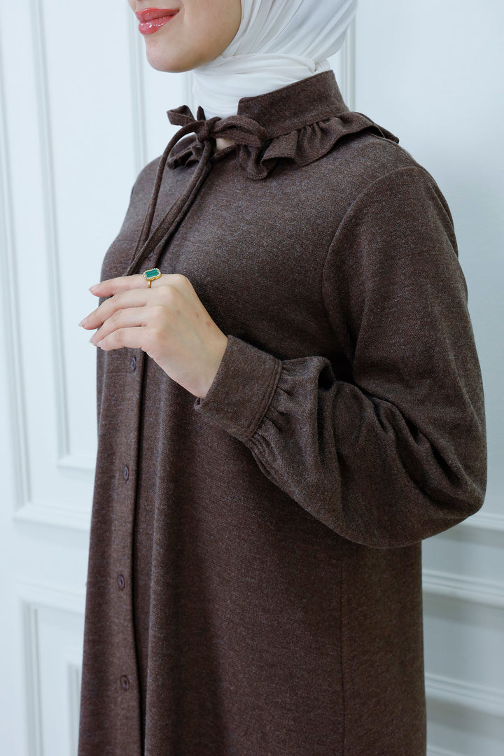 The dress falls to a modest maxi length with a subtle A-line flow. It features a full button-front closure, allowing it to be worn as a dress or layered open as a duster/abaya. The standout detail is the high collar, framed with delicate ruffles and finished with an adjustable tie detail for a customized look at the neckline. The sleeves are gently gathered at the shoulder and finished with neat cuffs, adding a subtle puff for extra character.
