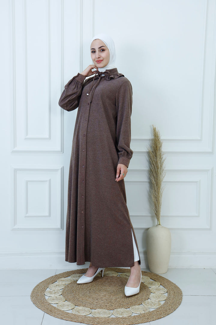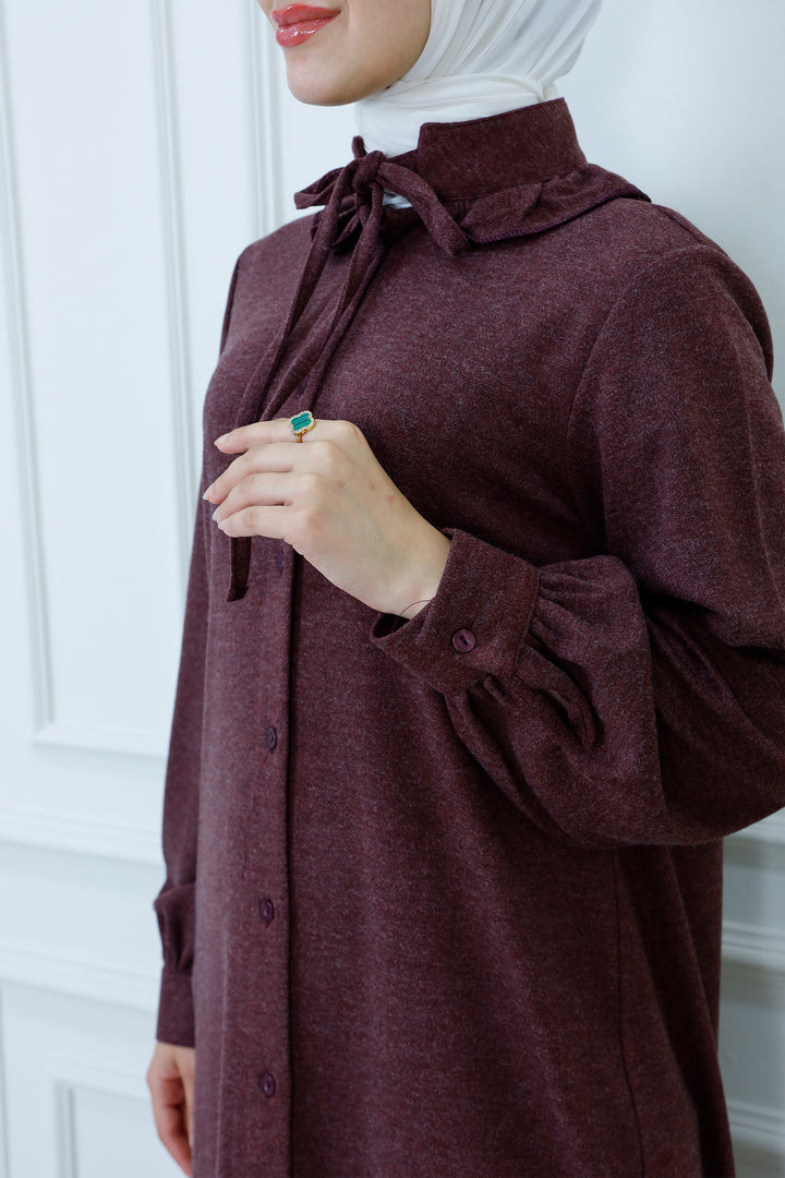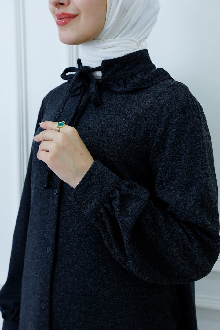 Embrace feminine elegance with our essential Ruffled-Neck Modest Shirt. This versatile piece combines the structured ease of a classic shirt dress with soft, charming details, making it perfect for office wear, casual outings, or modest everyday style.