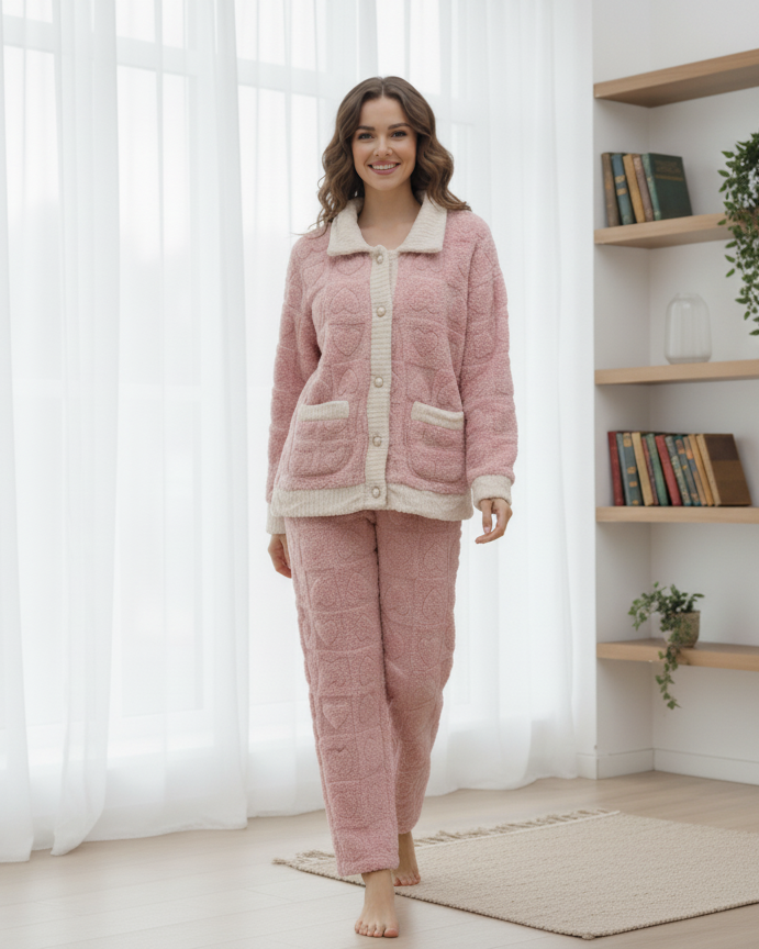 Elevate your downtime to a whole new level of chic. This two-piece set is designed for ultimate winter comfort while offering a truly elegant at-home look. It features a subtle heart pattern texture throughout and is accented by a sophisticated collar and contrasting trim. The statement buttons add a touch of luxury, making this a set you'll feel beautiful wearing all season long. Ideal for cozy evenings, stylish relaxation, or as a high-end gift.