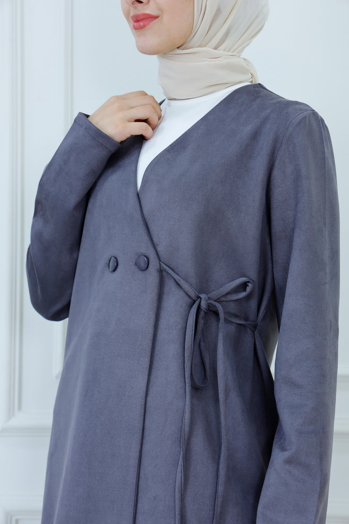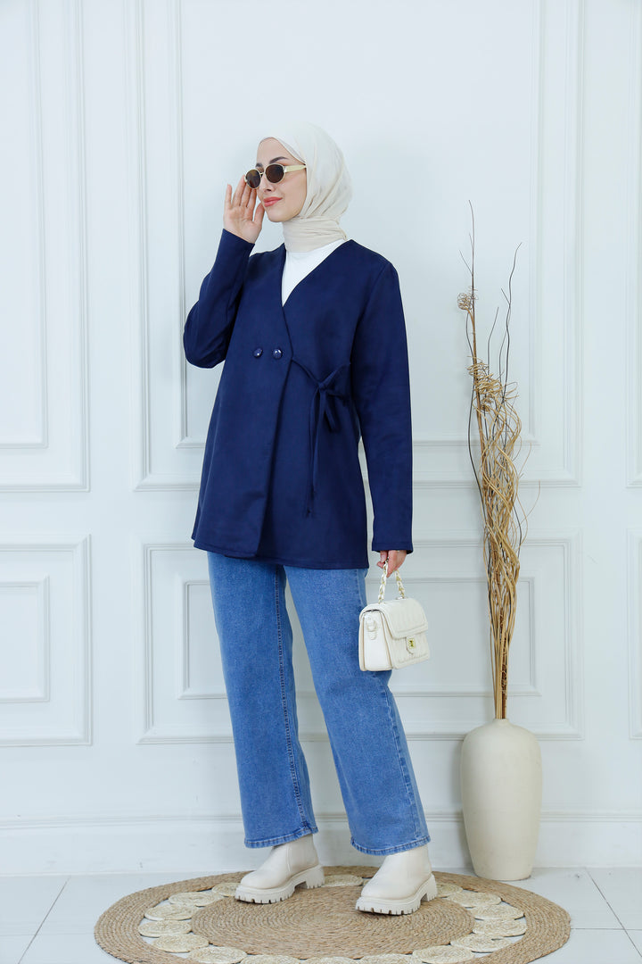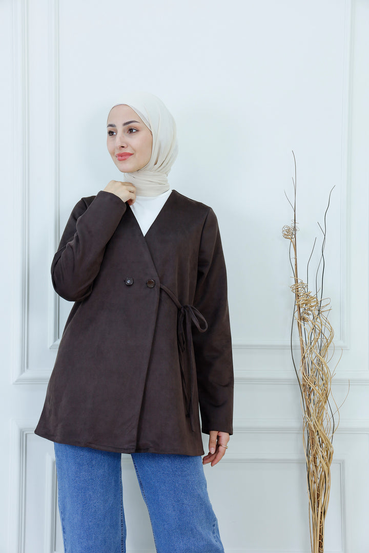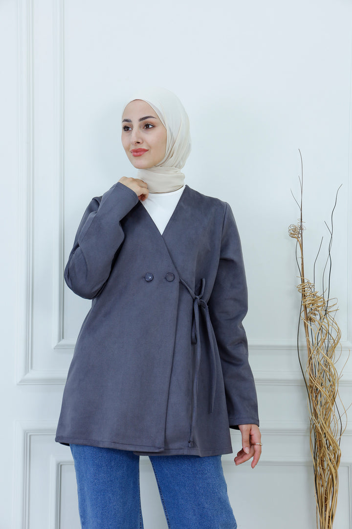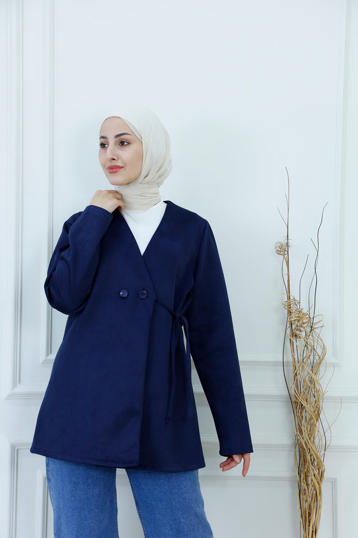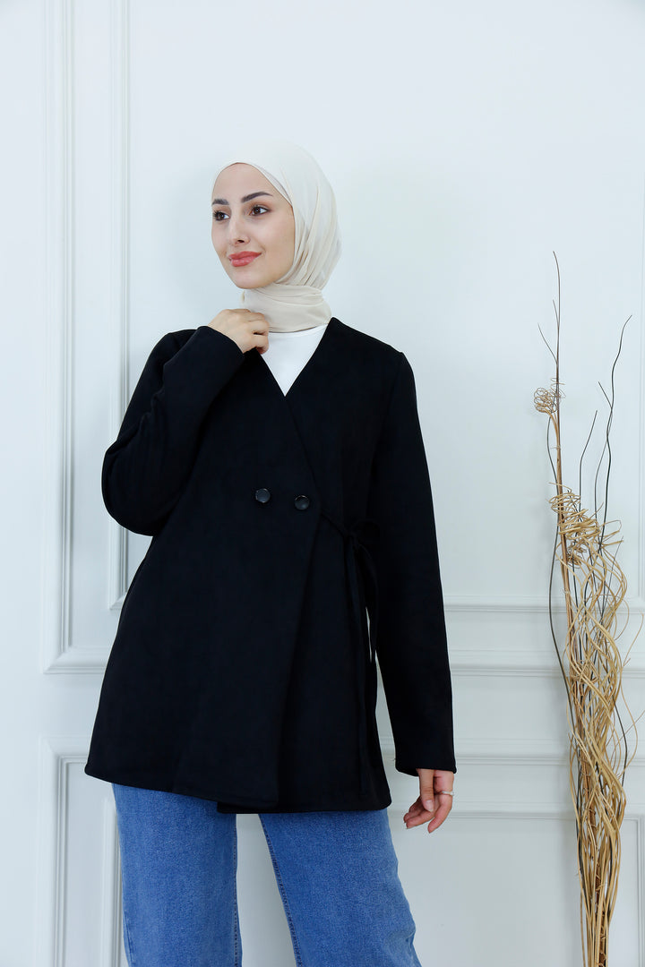 The design features a flattering wrap-front style with a prominent tailored collar and decorative double-button detailing on the front panel. A functional side tie cinches the waist, creating a beautiful, customized silhouette that defines your figure elegantly. Its hip-length cut provides essential coverage and is ideal for pairing with trousers or modest skirts