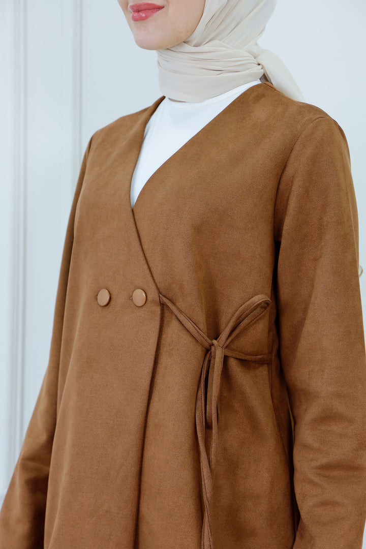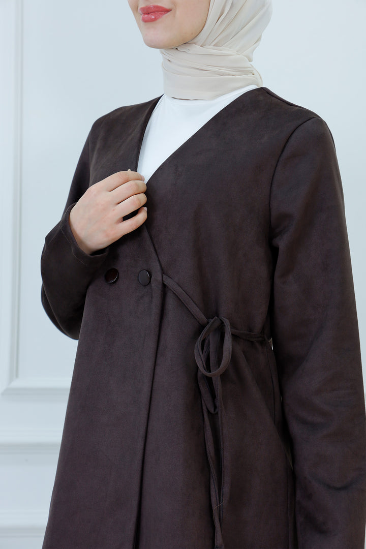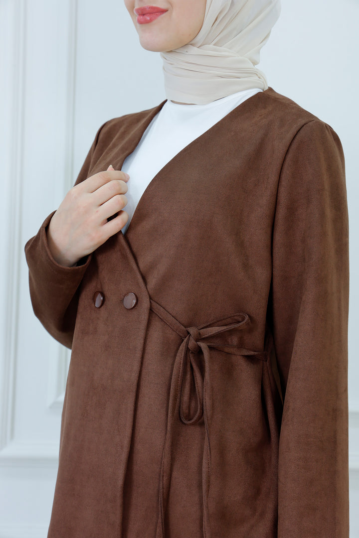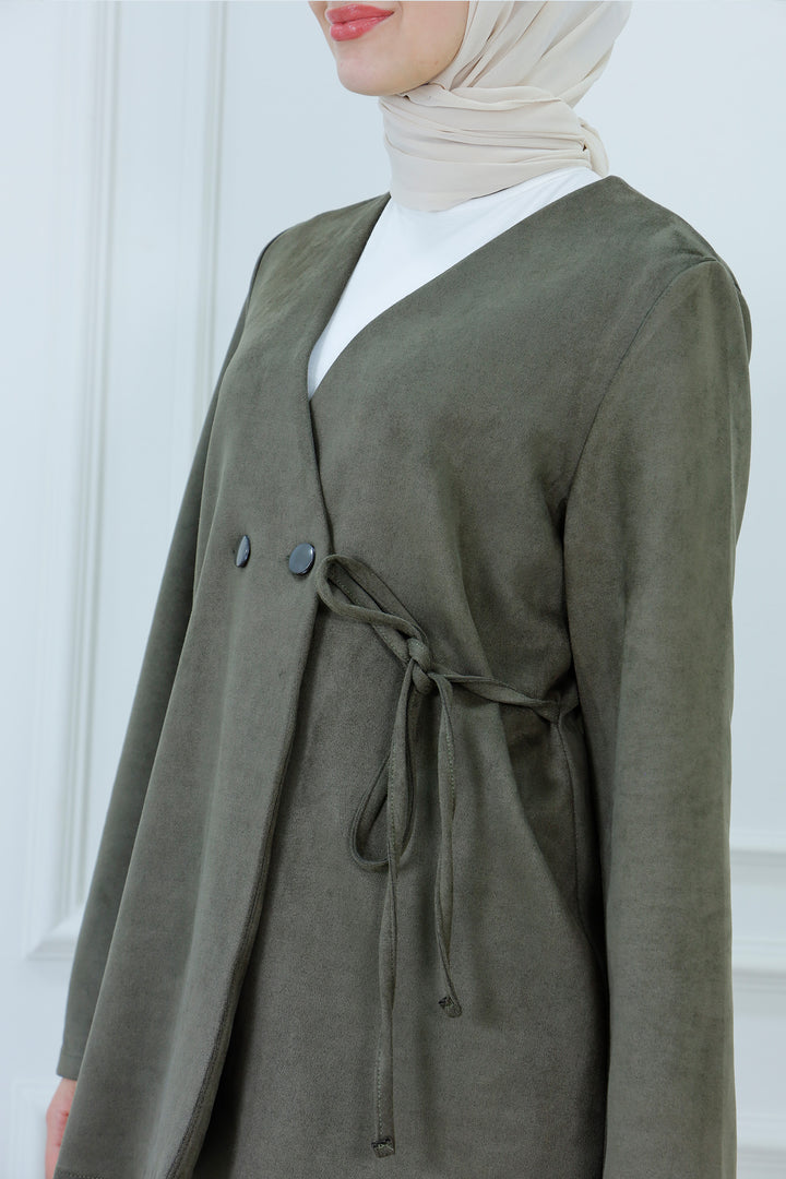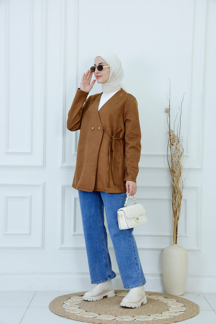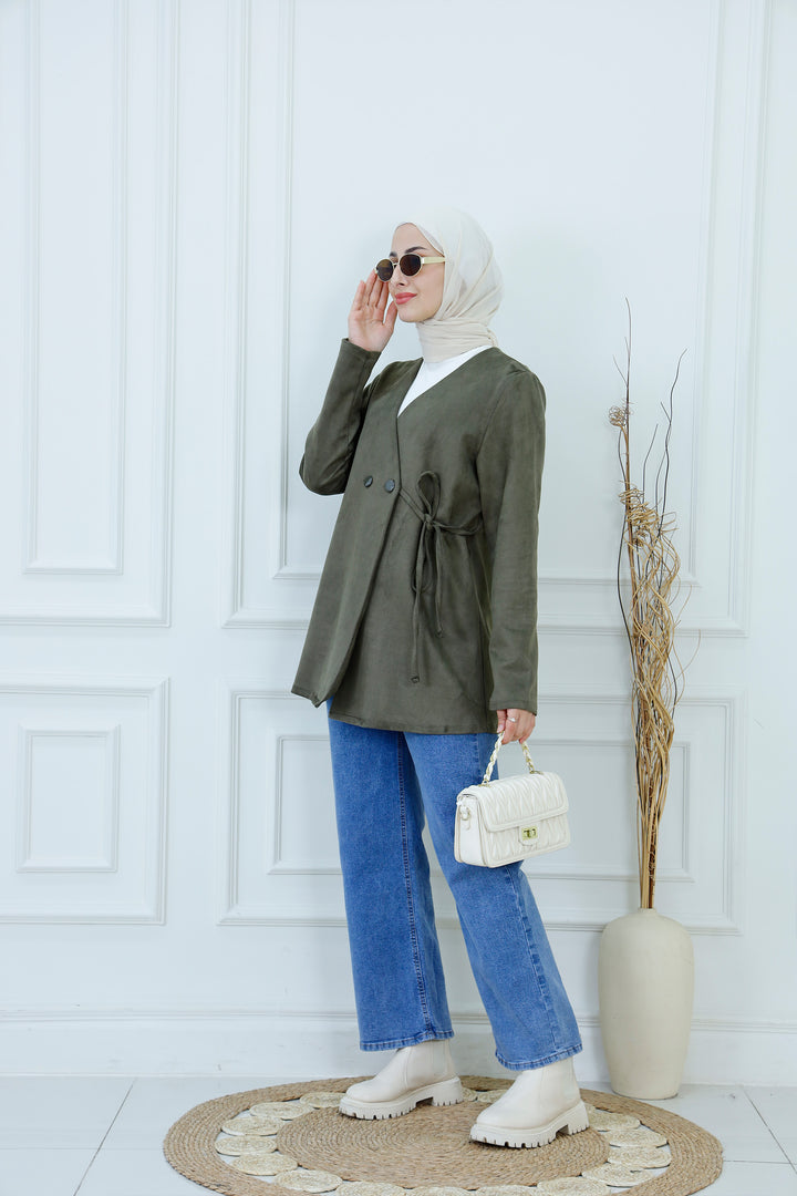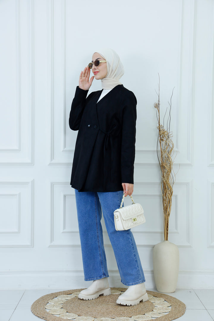 The design features a flattering wrap-front style with a prominent tailored collar and decorative double-button detailing on the front panel. A functional side tie cinches the waist, creating a beautiful, customized silhouette that defines your figure elegantly. Its hip-length cut provides essential coverage and is ideal for pairing with trousers or modest skirts