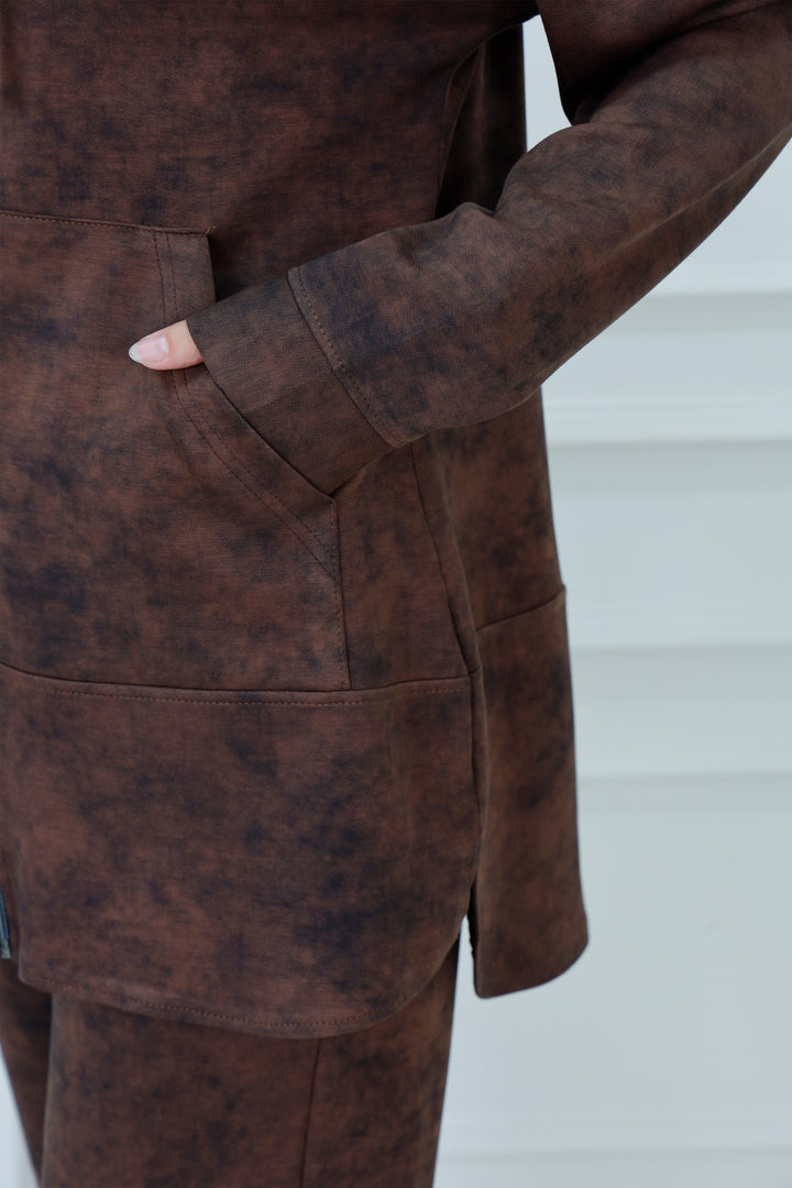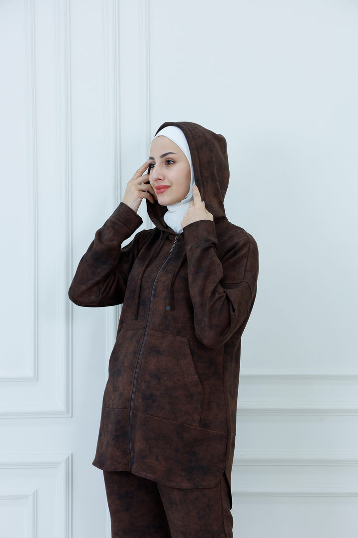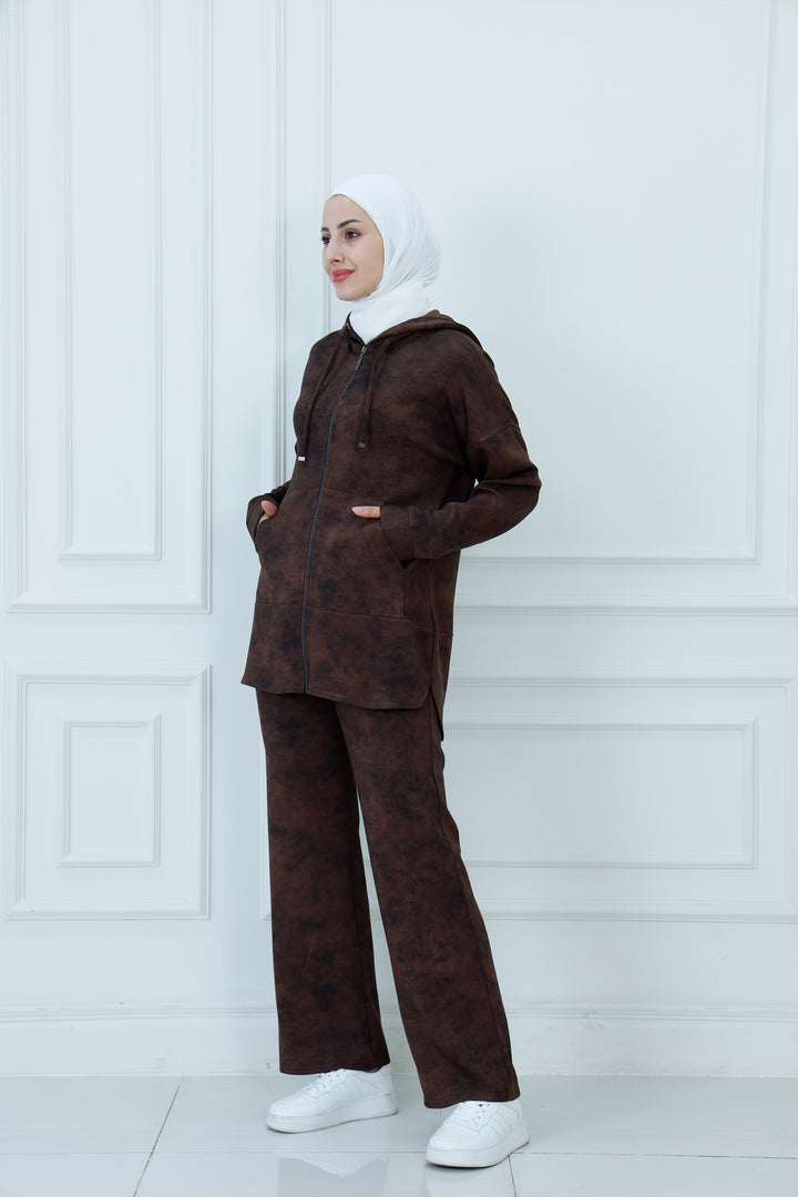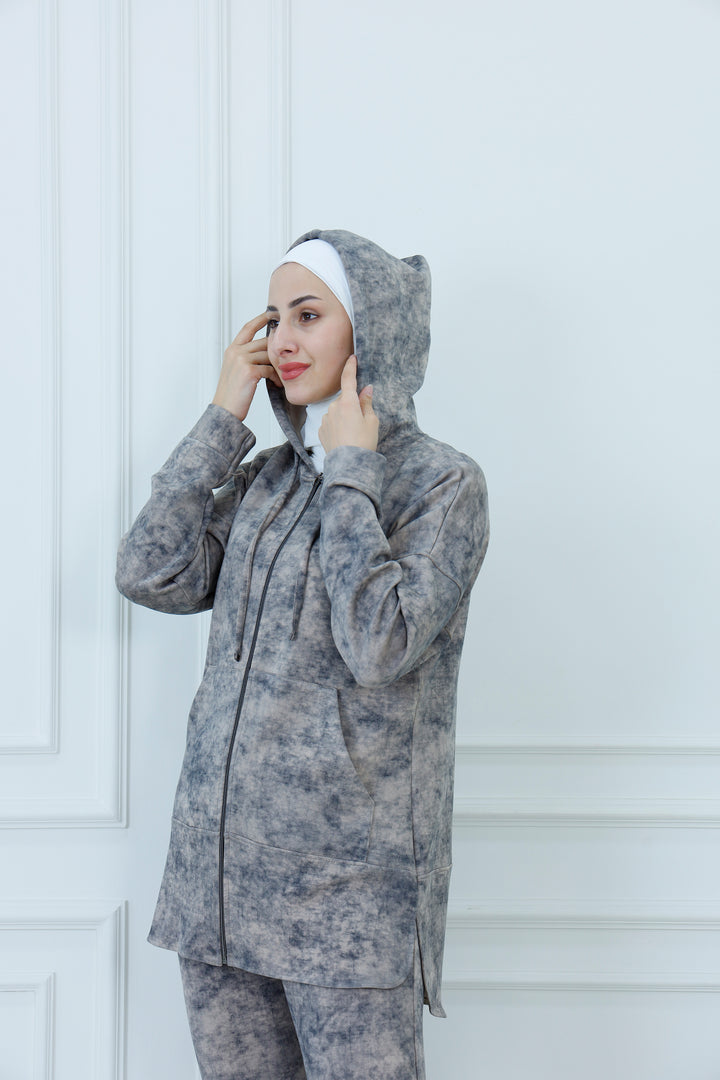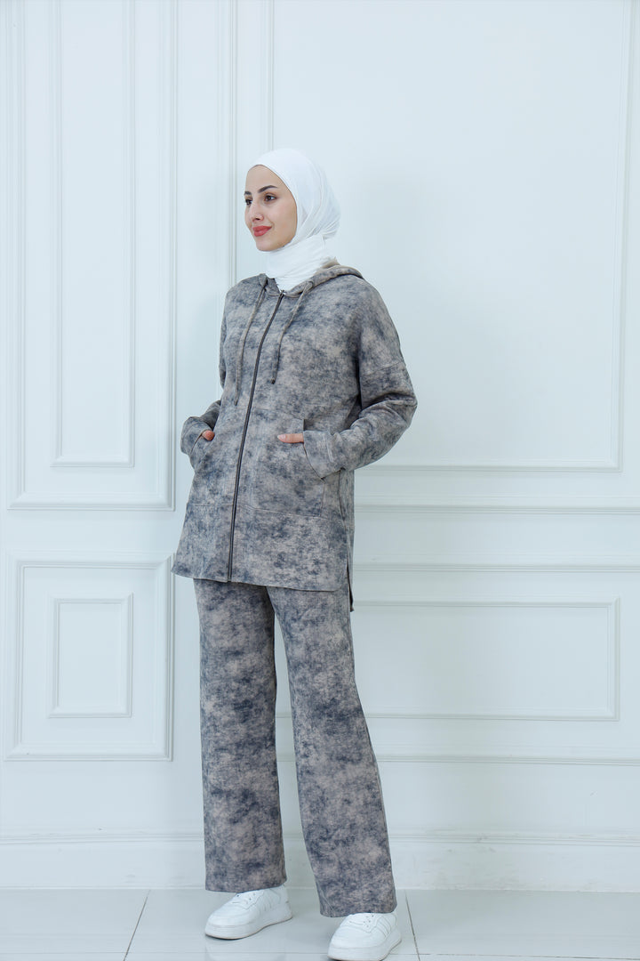 Make a statement with this effortlessly cool Two-Piece Modest Set. This coordinated ensemble features an oversized top and matching wide-leg bottoms, all sporting a unique, all-over distressed or camouflage-style print. The high-quality material ensures a comfortable, relaxed fit and a soft drape, perfect for stylish everyday wear.