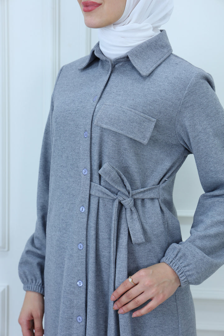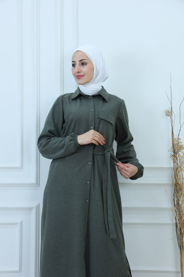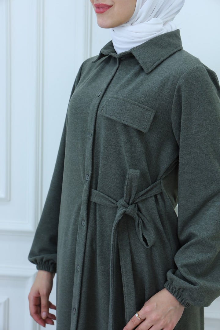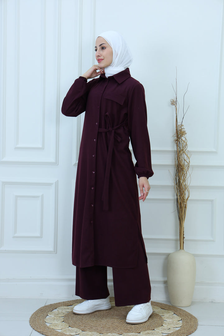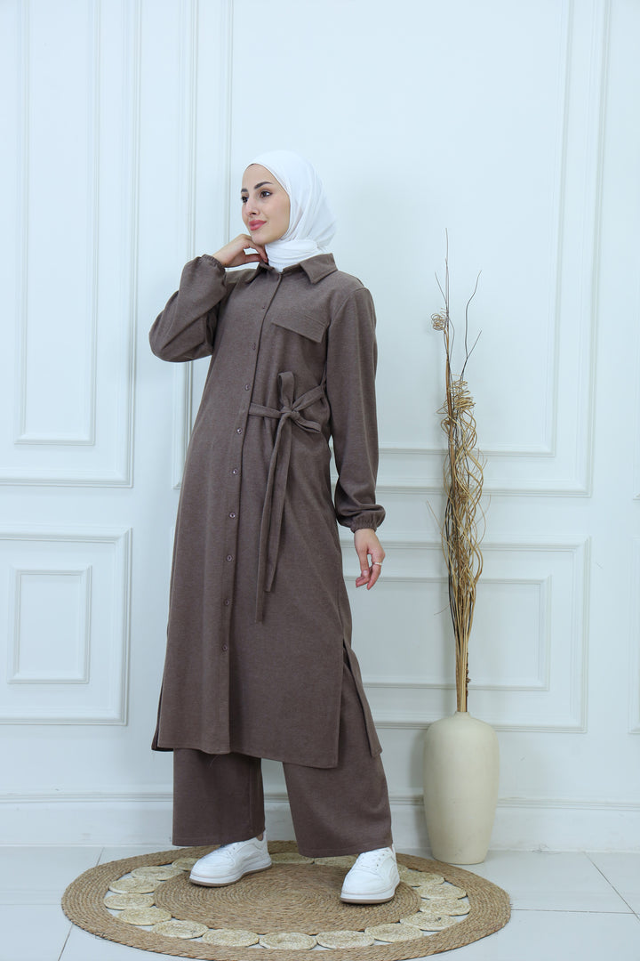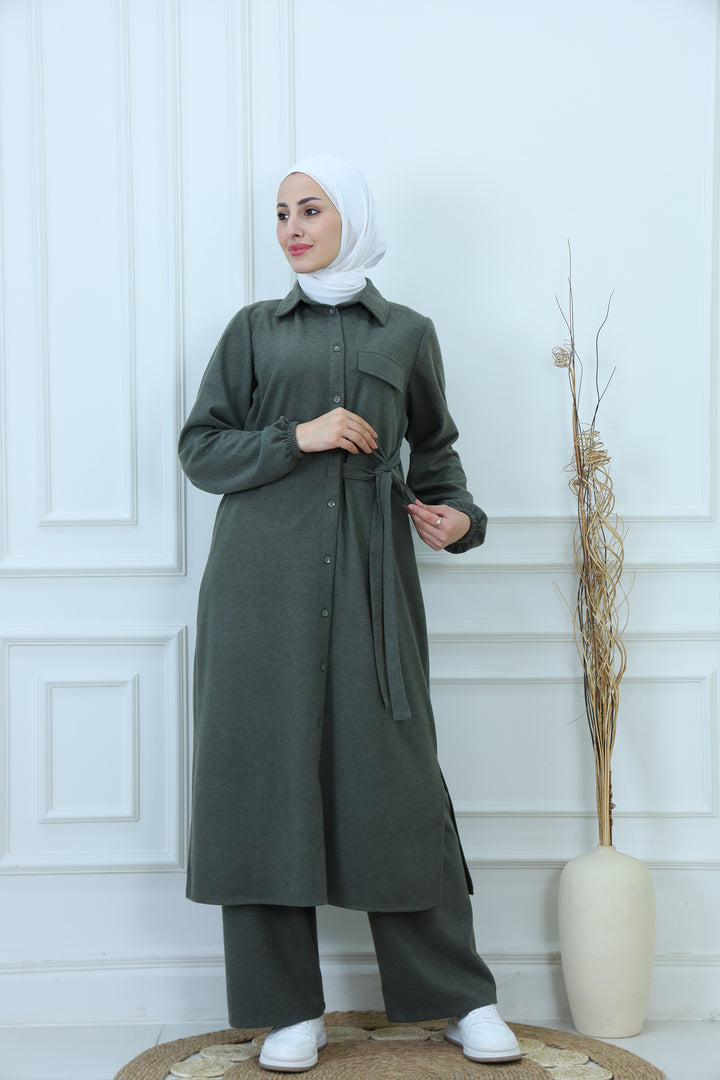 The long Shirt-Tunic is styled like an elongated shirt dress, featuring a crisp collar, a button-up front, and a practical chest pocket. It is cinched with a thin, matching tie belt to create a flattering waistline. The wide-leg bottoms (Palazzo style) offer a comfortable fit and an elegant, flowing silhouette that ensures complete modesty.