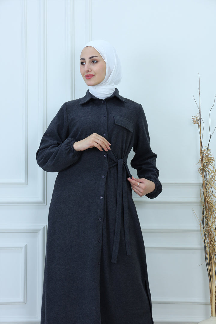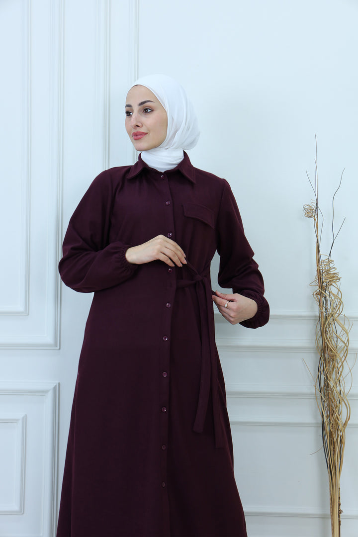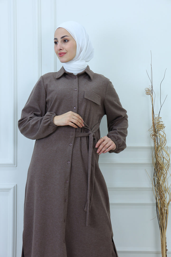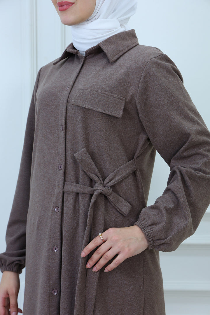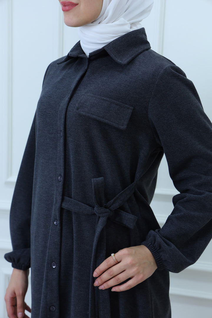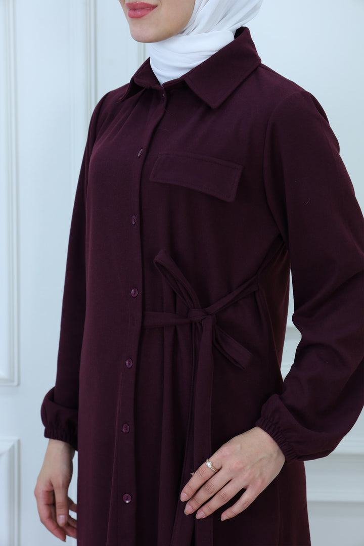 The long Shirt-Tunic is styled like an elongated shirt dress, featuring a crisp collar, a button-up front, and a practical chest pocket. It is cinched with a thin, matching tie belt to create a flattering waistline. The wide-leg bottoms (Palazzo style) offer a comfortable fit and an elegant, flowing silhouette that ensures complete modesty.