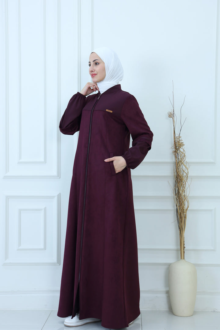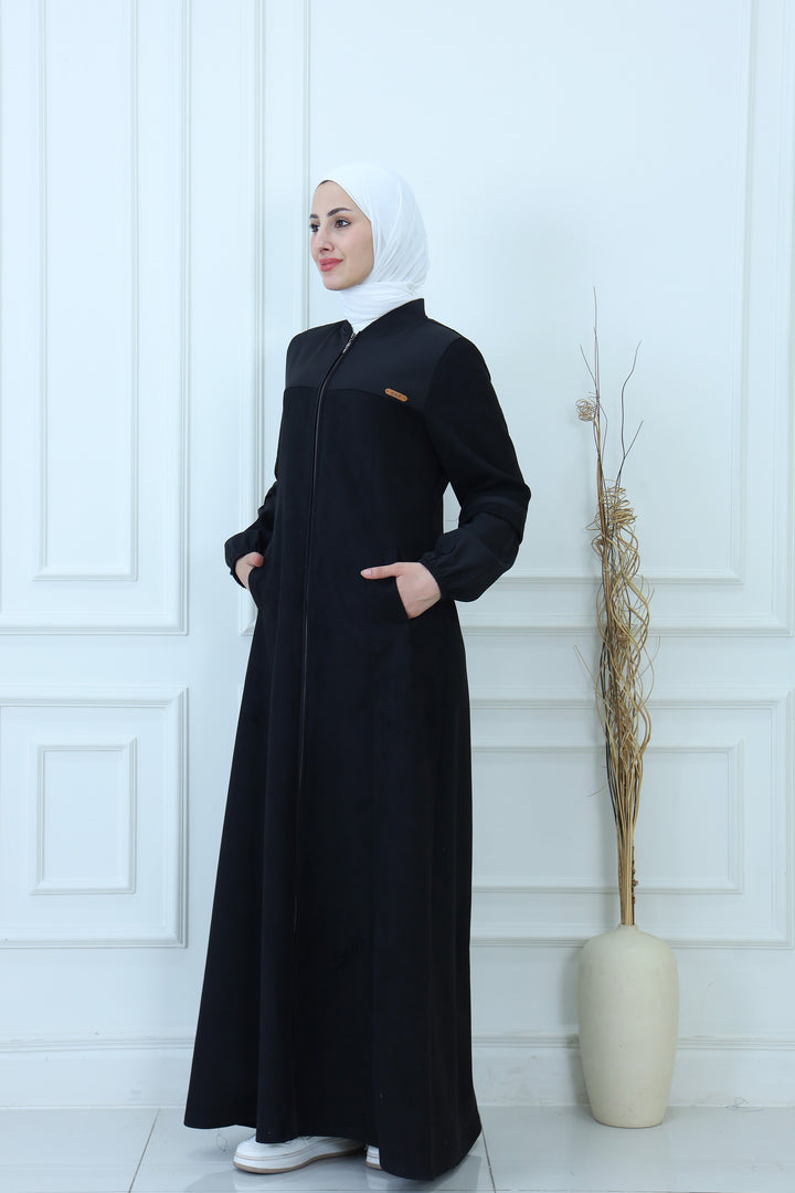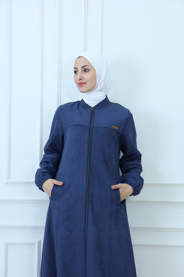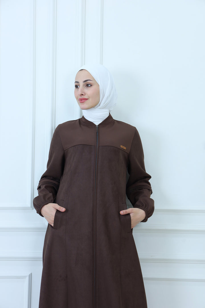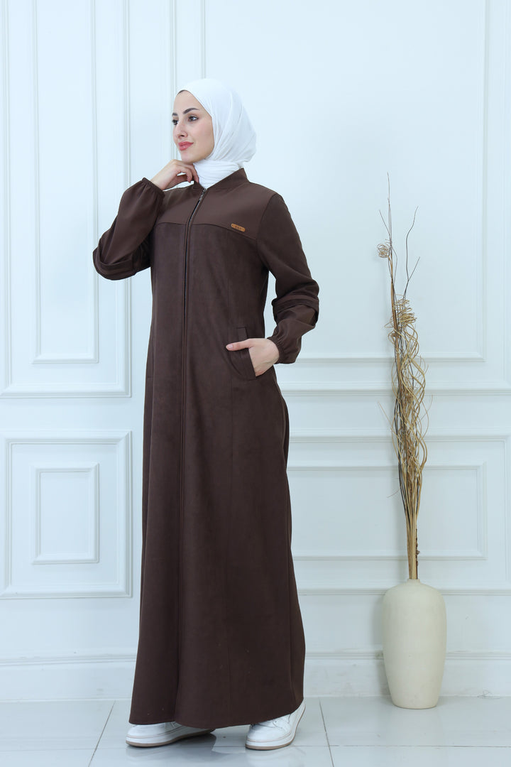 The dress features a convenient full zip-front closure leading up to a neat, high collar for added coverage. Made from a comfortable and structured fabric (likely a suedette or brushed knit), it provides a beautiful drape. Details like the large side pockets and elasticated cuffs add practicality and a casual charm.