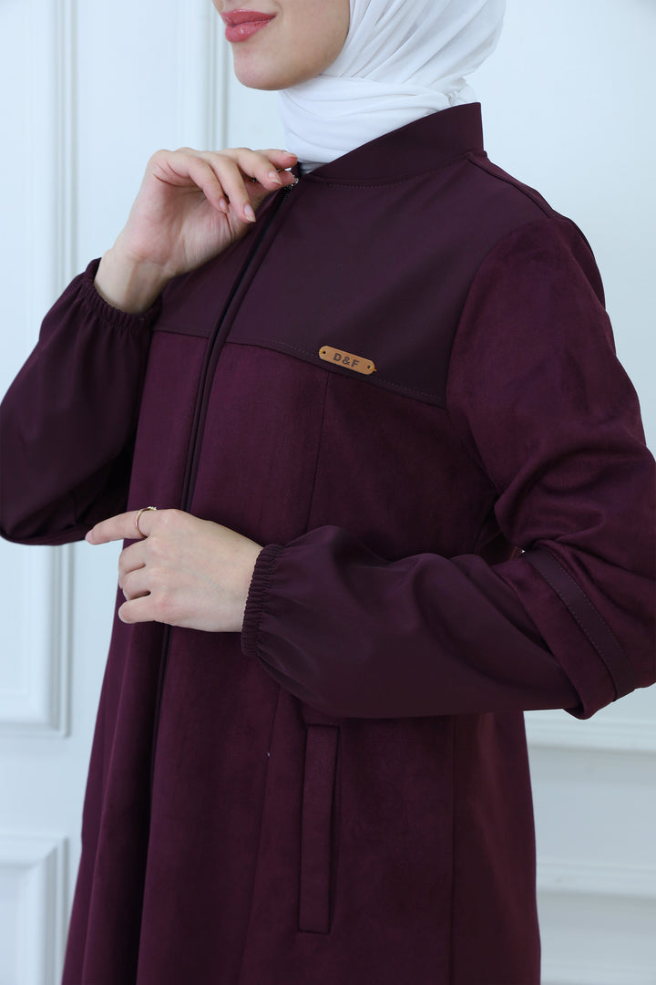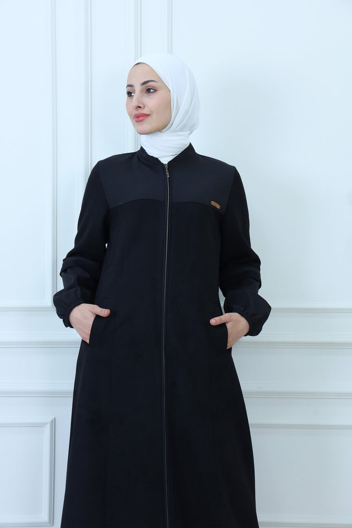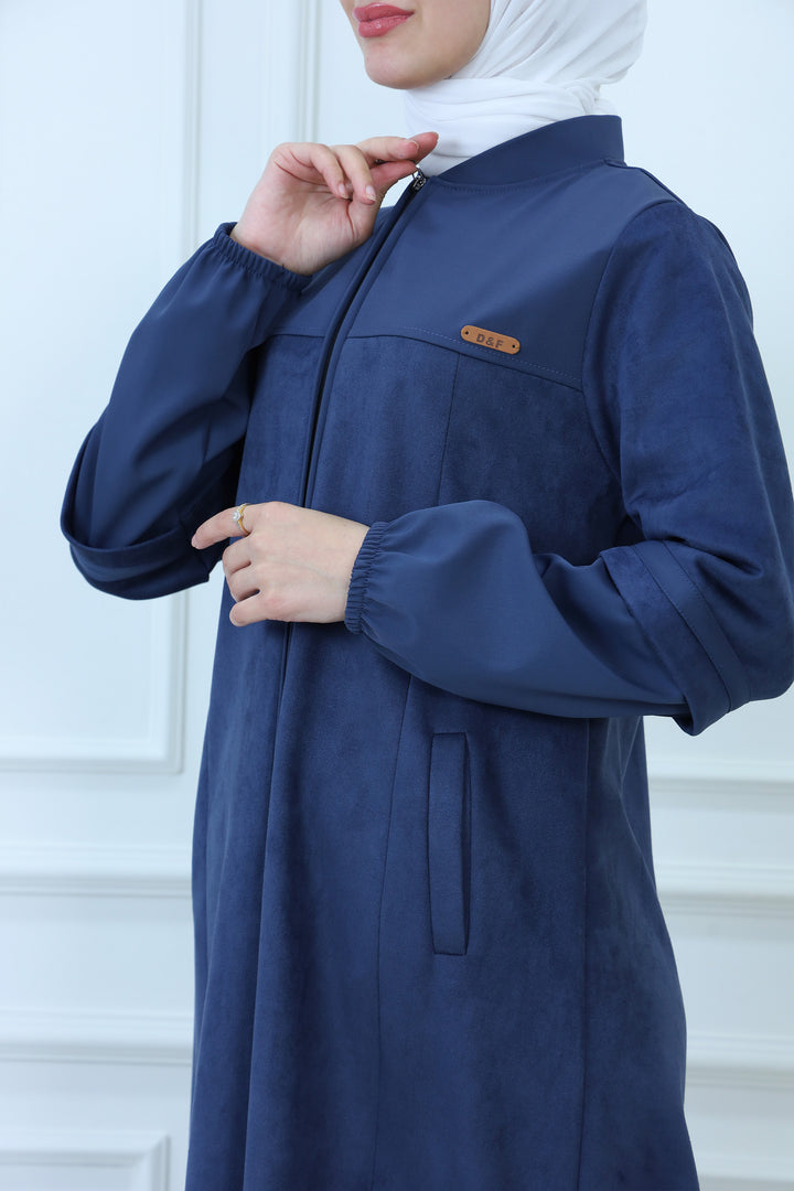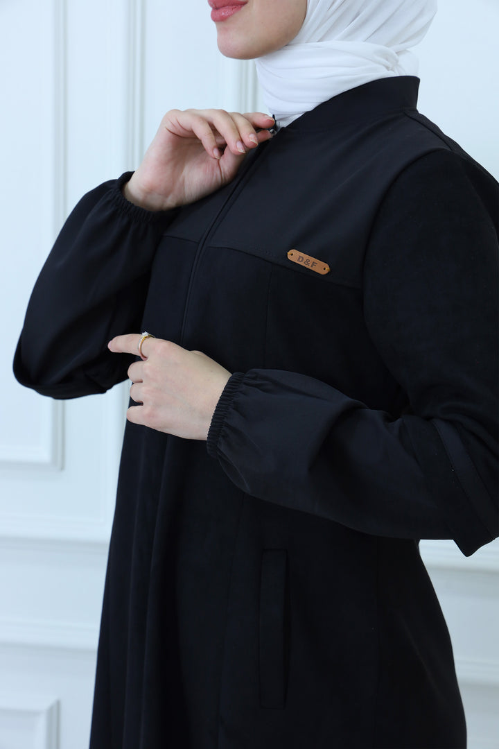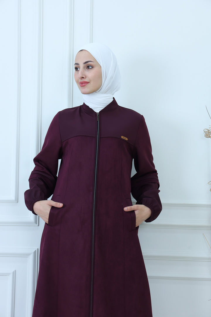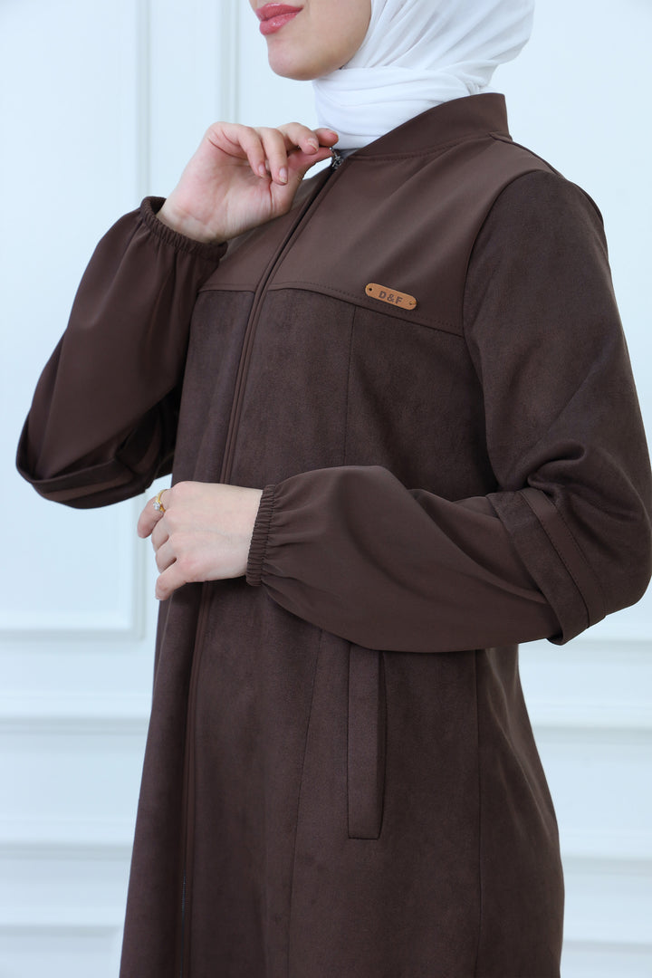 The dress features a convenient full zip-front closure leading up to a neat, high collar for added coverage. Made from a comfortable and structured fabric (likely a suedette or brushed knit), it provides a beautiful drape. Details like the large side pockets and elasticated cuffs add practicality and a casual charm.