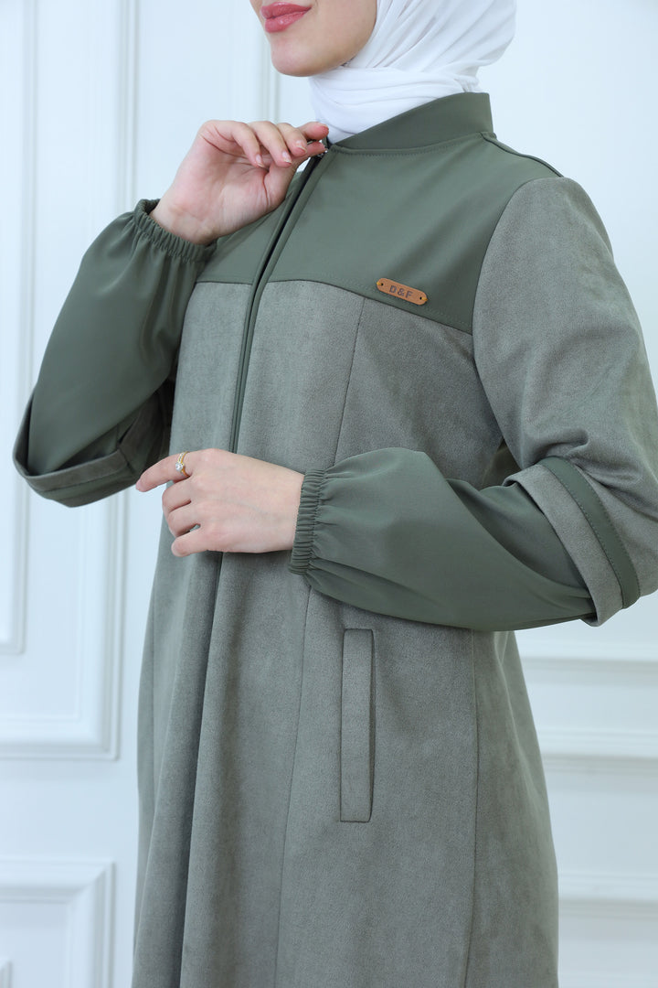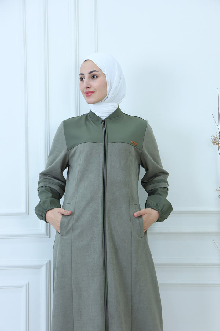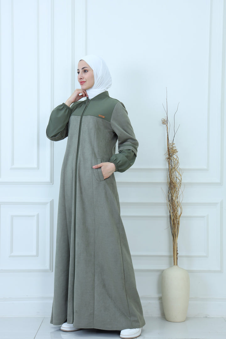 Achieve effortless style and comfort with this striking Two-Tone Modest Dress. Designed with a sophisticated color-block panel across the chest, this full-length piece merges modest coverage with a modern, sporty aesthetic. The sage and olive green tones are versatile and perfectly suited for the fall and winter seasons.
