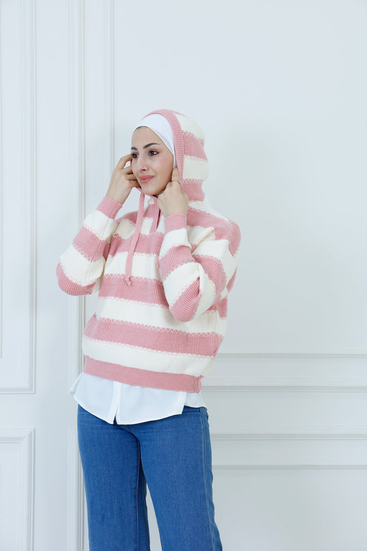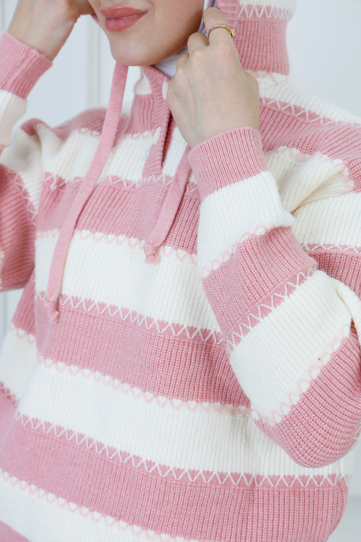 The knitted hoodie features a playful, wide pink and cream stripe pattern. A unique contrast decorative stitch runs along the edges of the stripes, adding an artisanal detail that makes this sweater stand out. It includes a comfortable hood with adjustable drawstrings and a small, stylish button placket at the neck. The relaxed fit is perfect for easy layering and offers a modern, effortless silhouette.