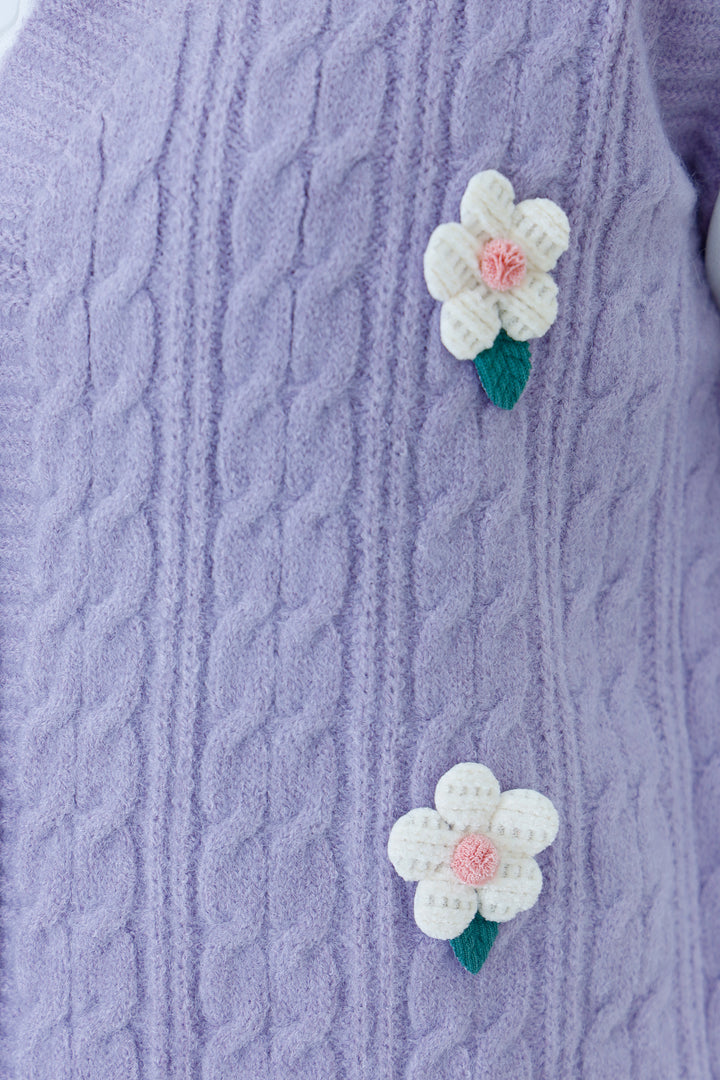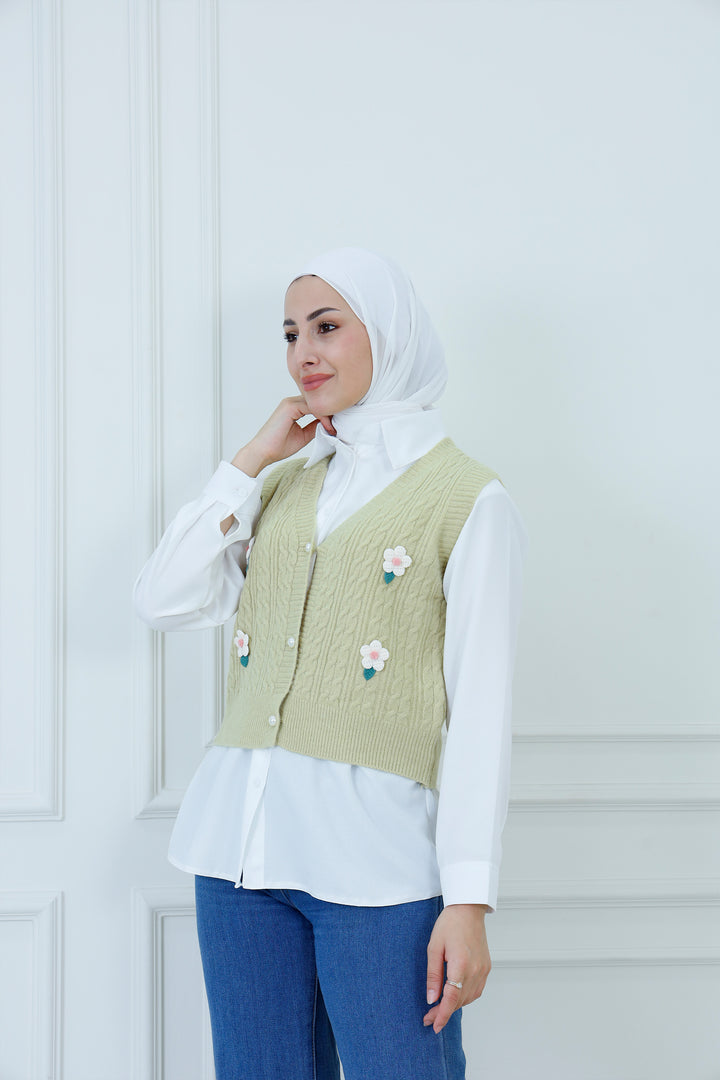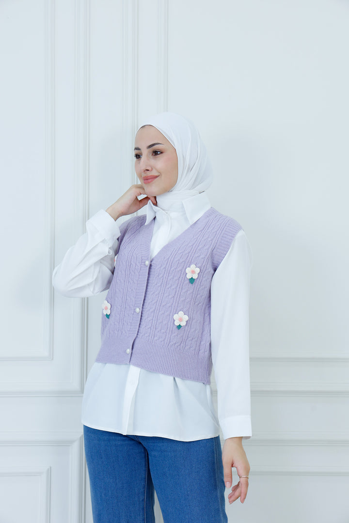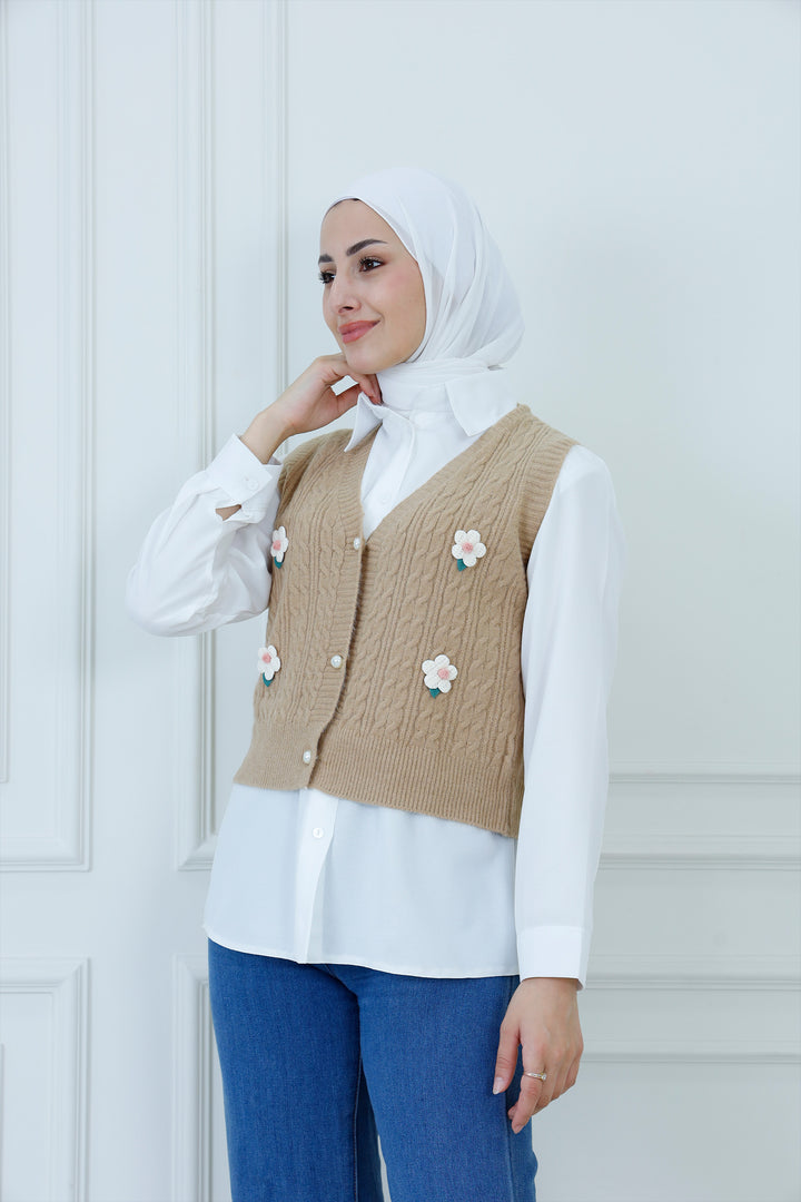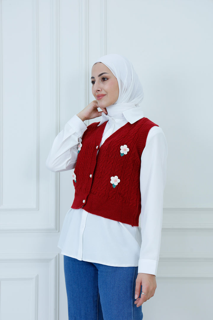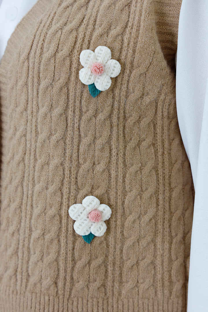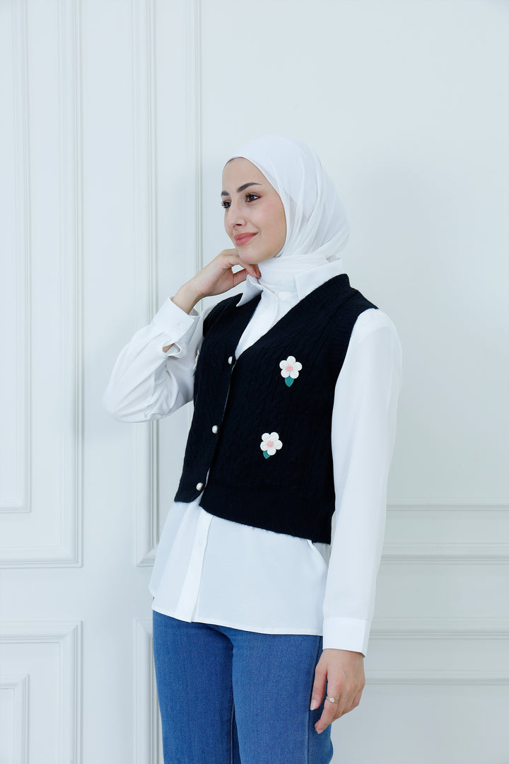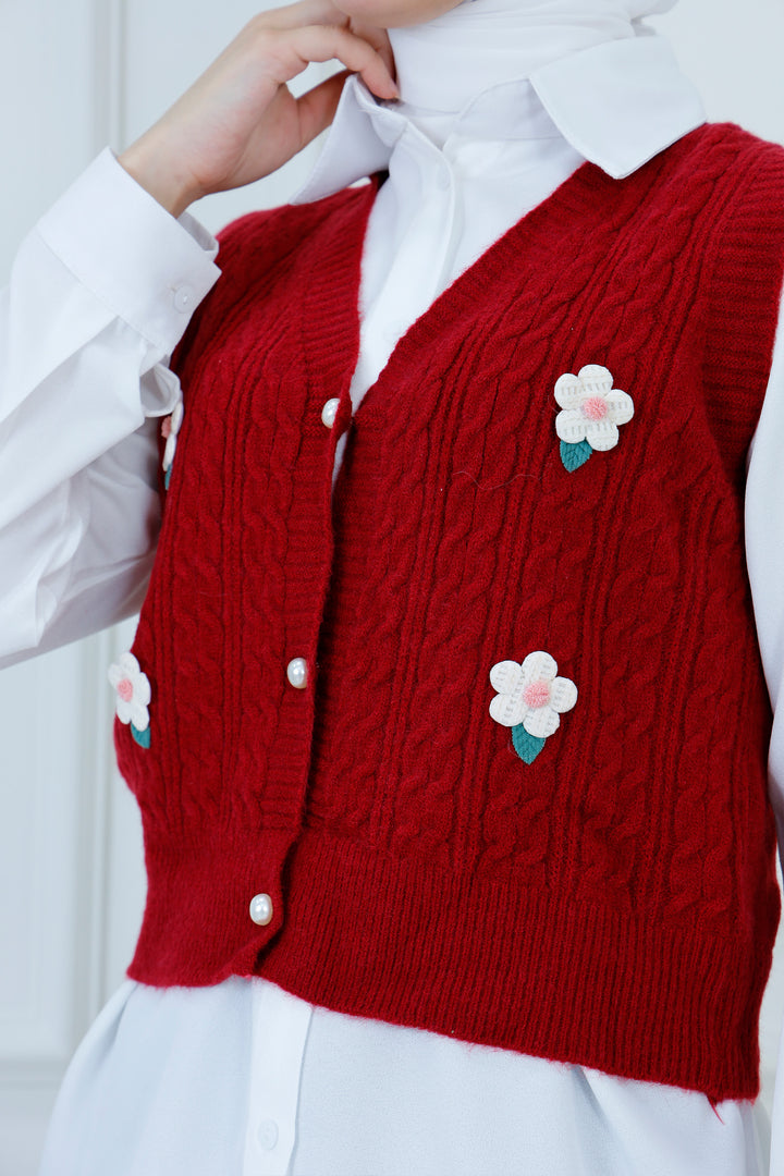 This vest is meticulously crafted with a rich, textured knit pattern that offers classic warmth and dimension. It features a chic V-neckline and a flattering cropped silhouette that pairs perfectly over longer shirts and blouses. The vest is finished with a button-front closure accented by beautiful pearl-like buttons, adding a touch of vintage elegance.