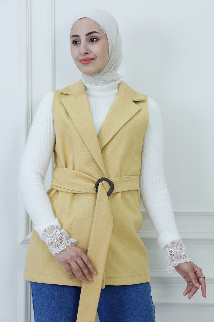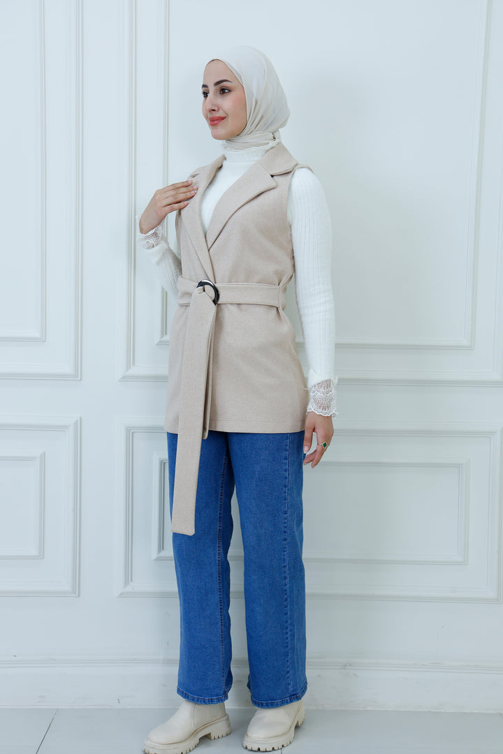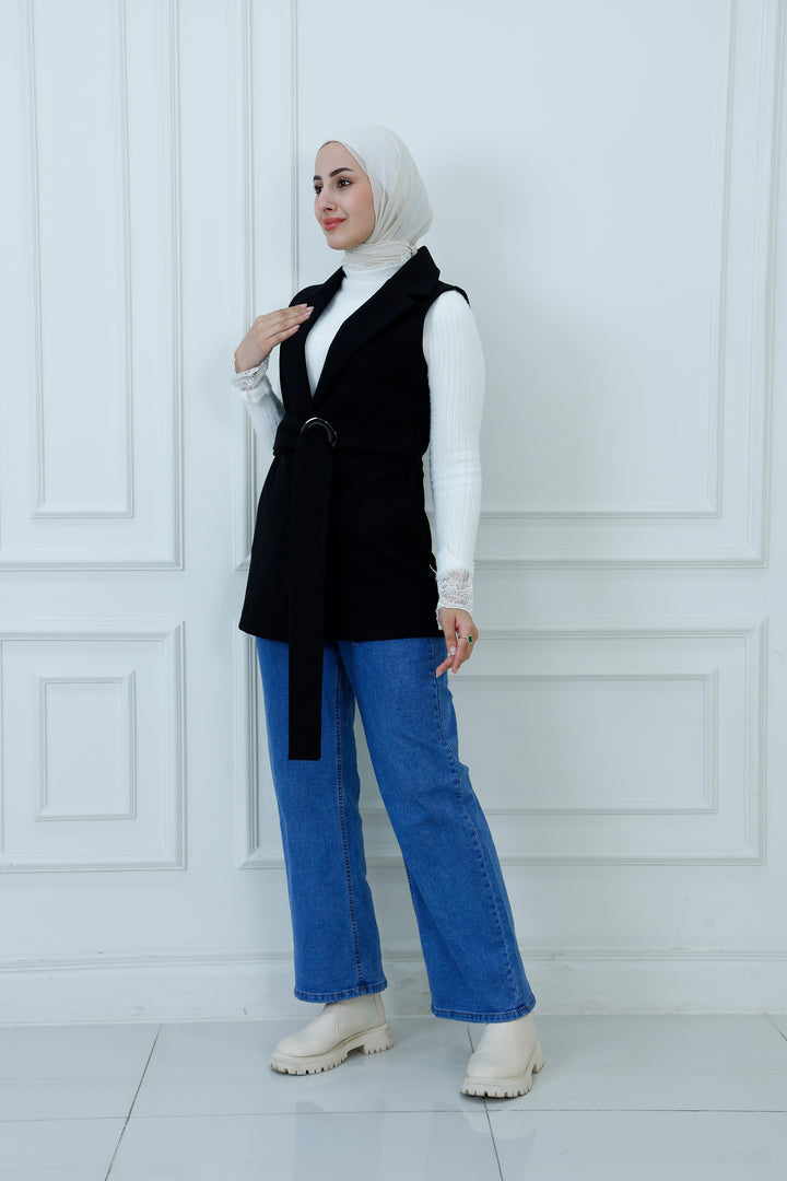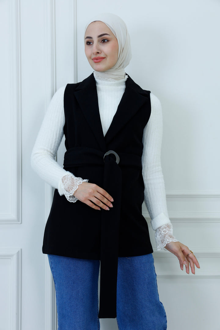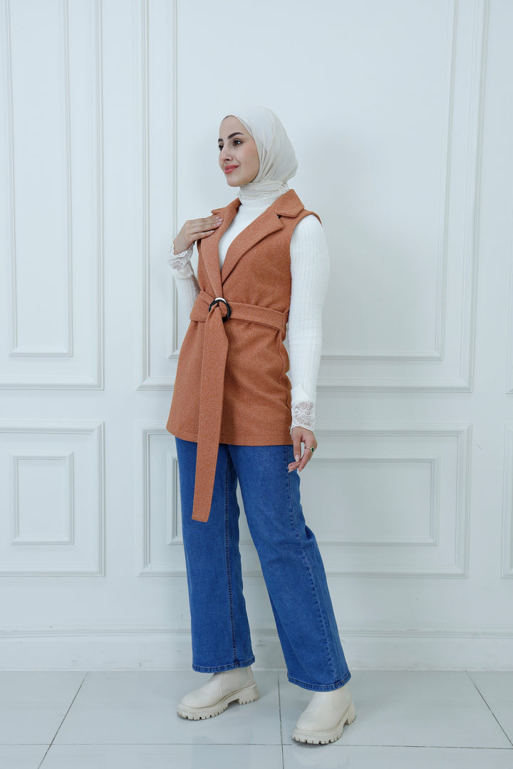 Introduce a sophisticated and versatile piece to your wardrobe with our Structured Lapel Belted Vest. This mid-length vest offers the perfect blend of style and modesty, making it an essential layering piece for any season.