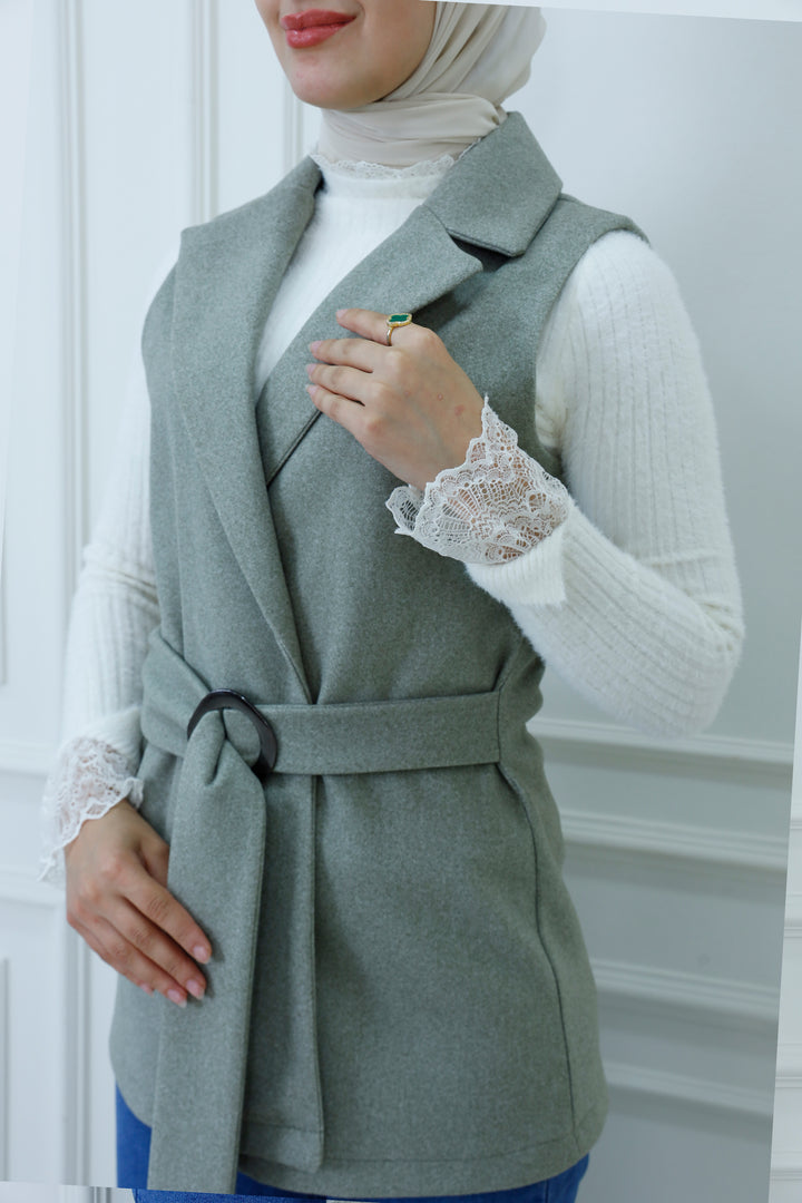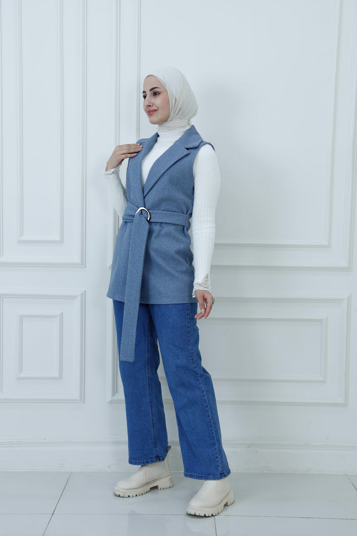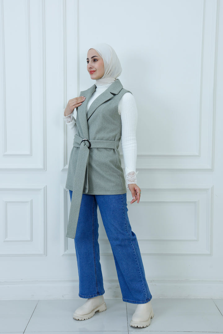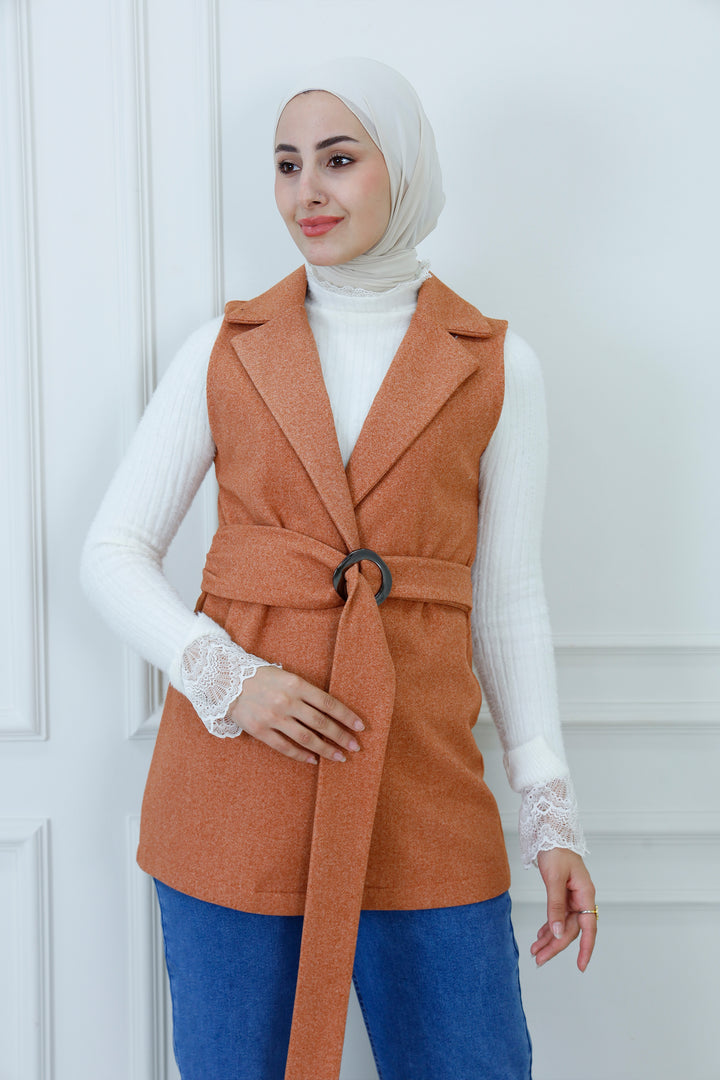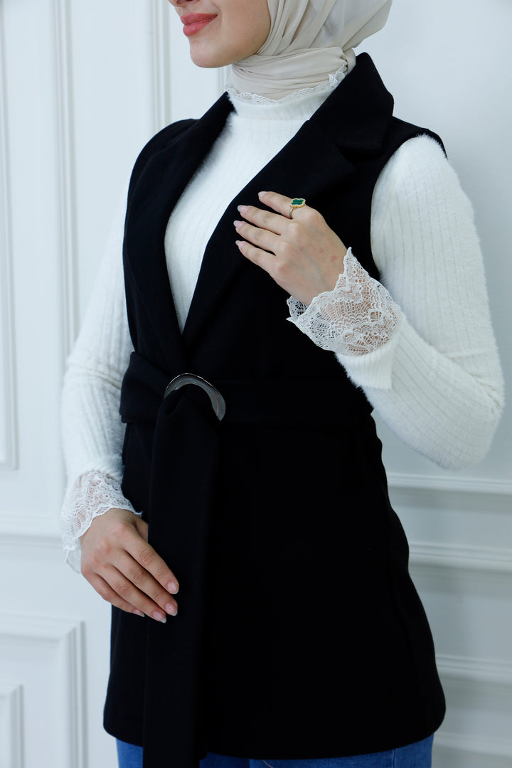 Introduce a sophisticated and versatile piece to your wardrobe with our Structured Lapel Belted Vest. This mid-length vest offers the perfect blend of style and modesty, making it an essential layering piece for any season.