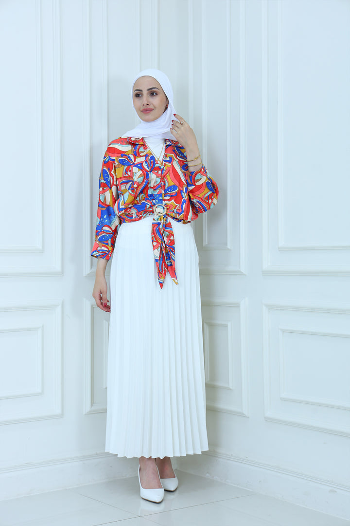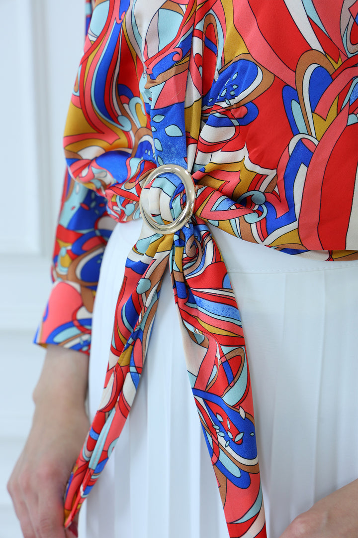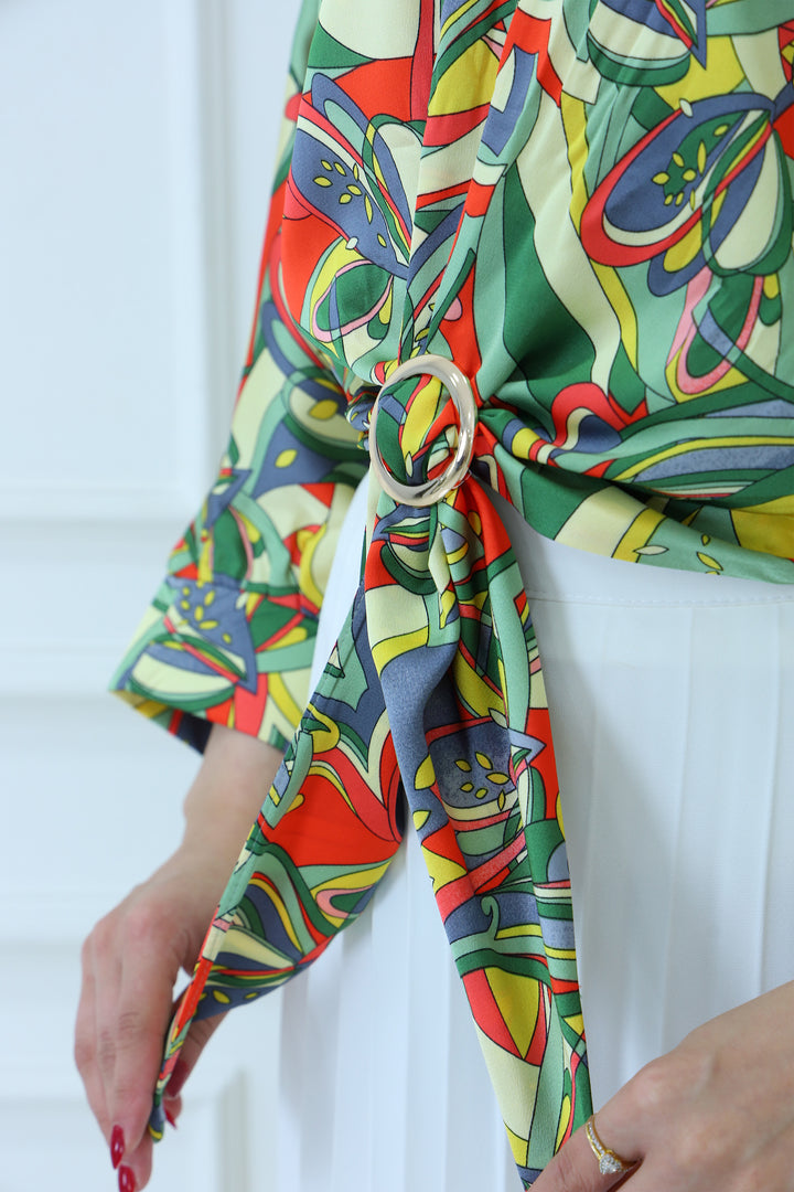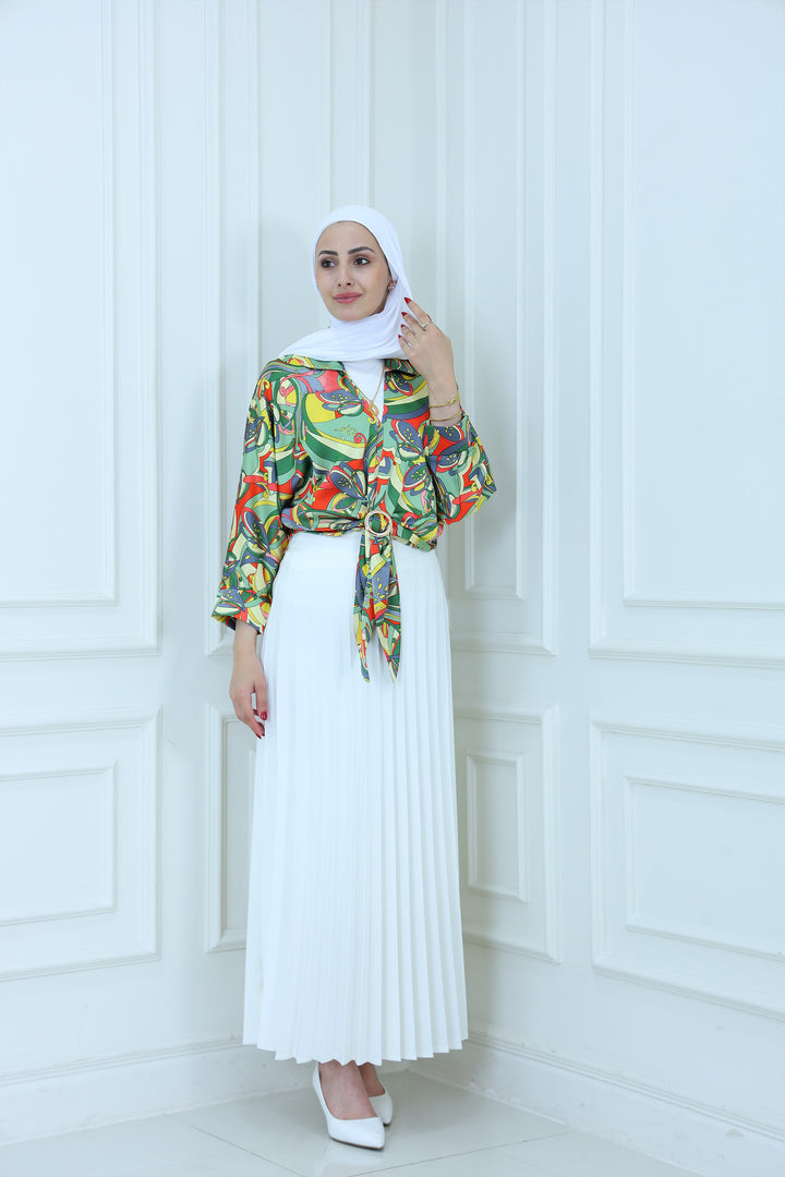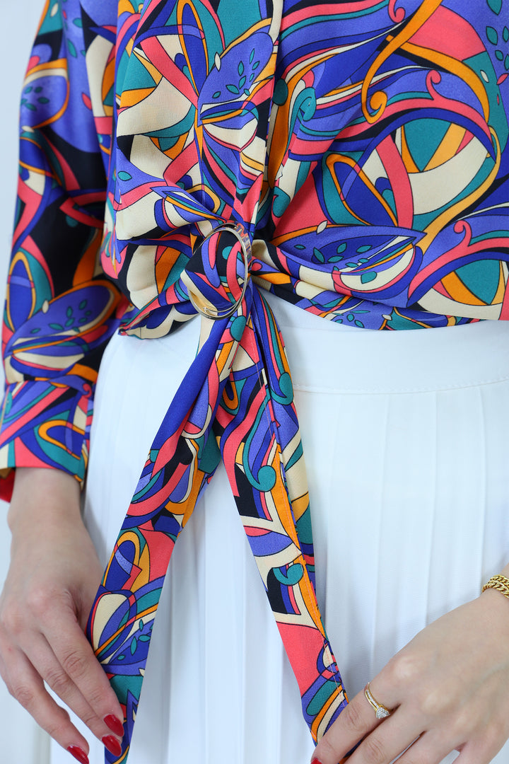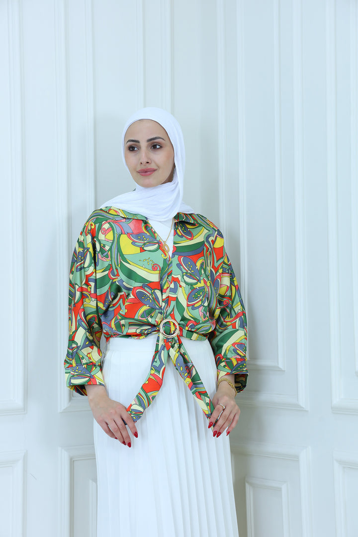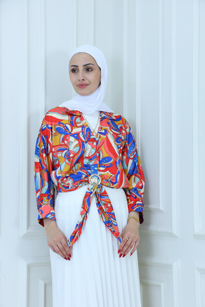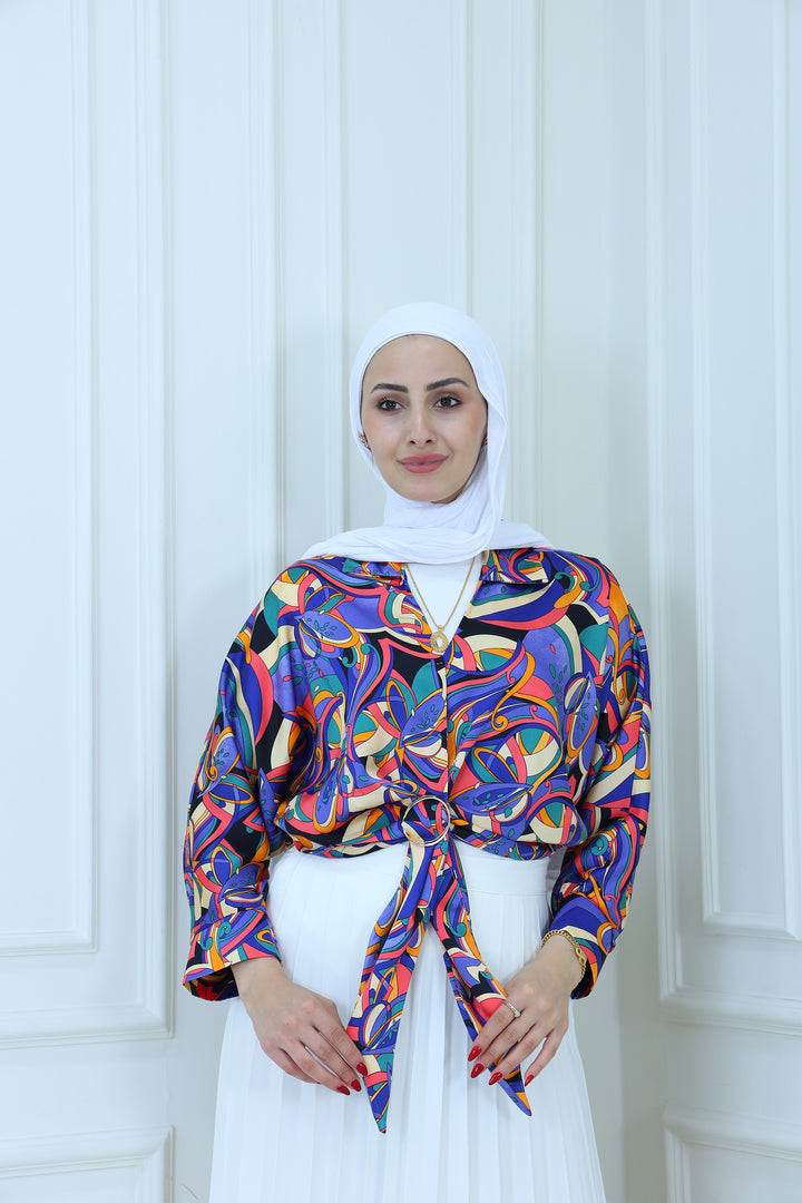 Turn heads with this vibrant abstract print satin blouse featuring bold multicolor patterns and a stylish front tie design. Made from lightweight, silky fabric, this blouse is perfect for adding a pop of color to your modest wardrobe. Pair it with a pleated skirt or tailored pants for a chic, fashion-forward look ideal for casual outings, parties, or semi-formal events