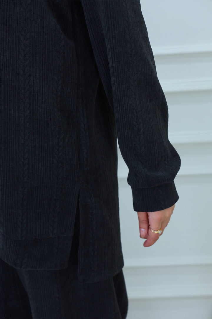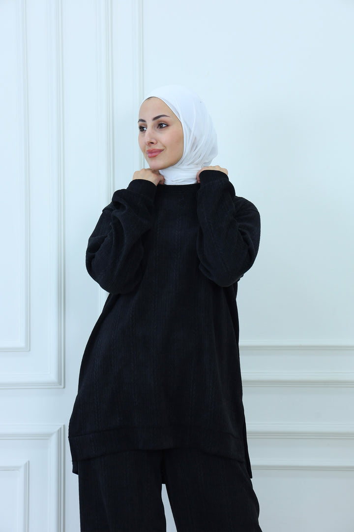 The full winter ensemble features a comfortable, long-sleeve top with a classic ribbed texture and a high neckline for maximum warmth. It is perfectly paired with coordinating wide-leg trousers for a modern, balanced look. Made from a thick fabric, this heavyweight tracksuit is designed to keep you comfortable all day long, making it an essential addition to your winter wardrobe.