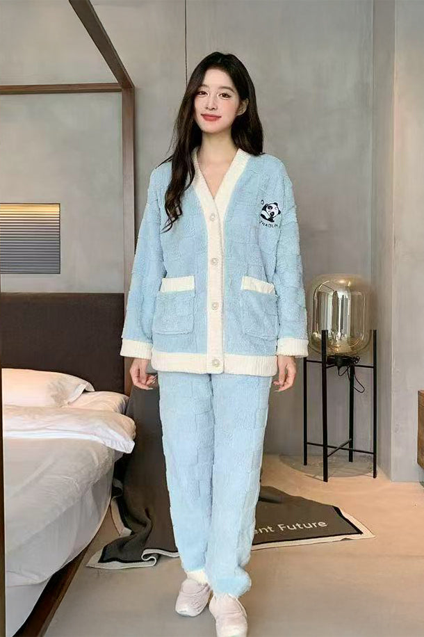 Elevate your lounging experience with this chic two-piece set. Designed in a fashionable V-neck button-up style, it offers the perfect balance of comfort and elegance. The jacket features contrast ribbed trim on the cuffs and pockets, adding a refined touch to the relaxed silhouette. The subtle all-over block texture and comfortable fit make this suit your essential companion for cozy nights and relaxed home days. A truly comfortable and sophisticated addition to your winter wardrobe
