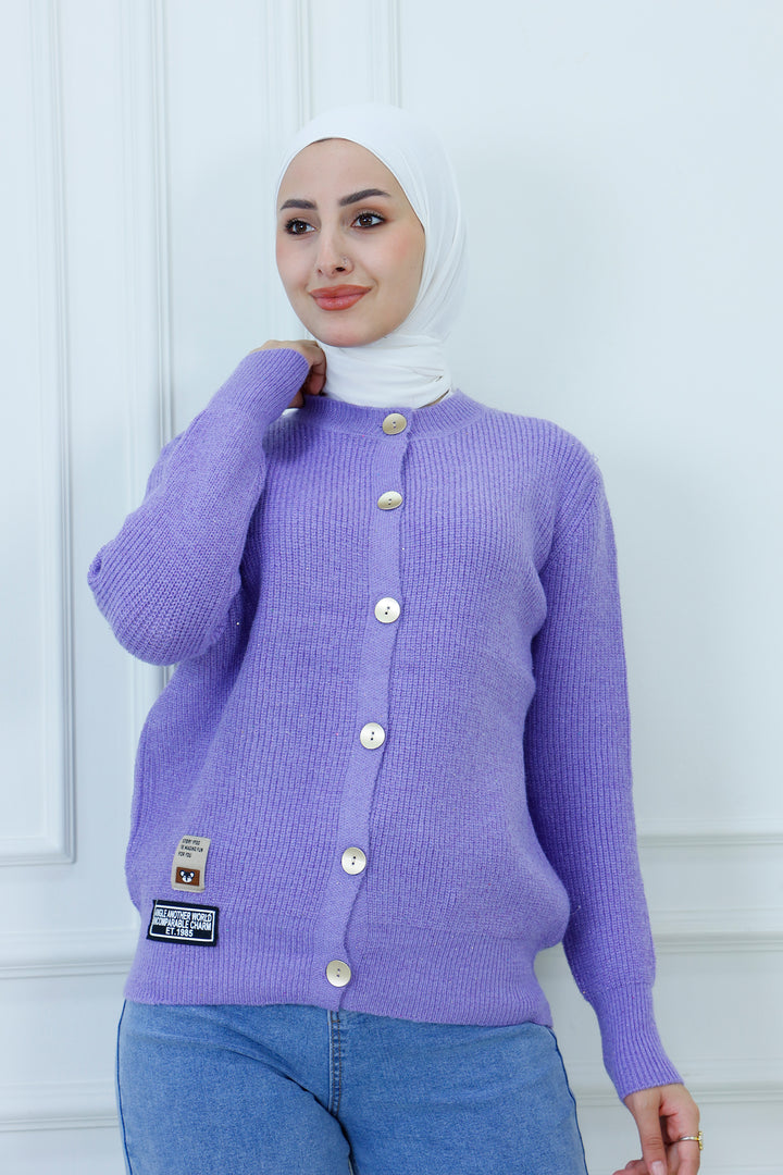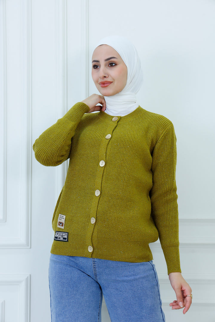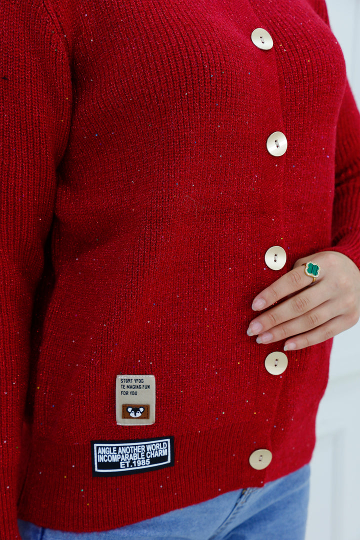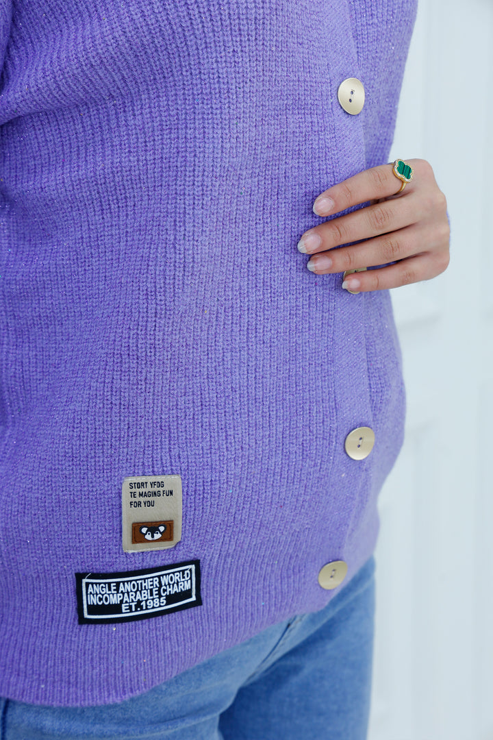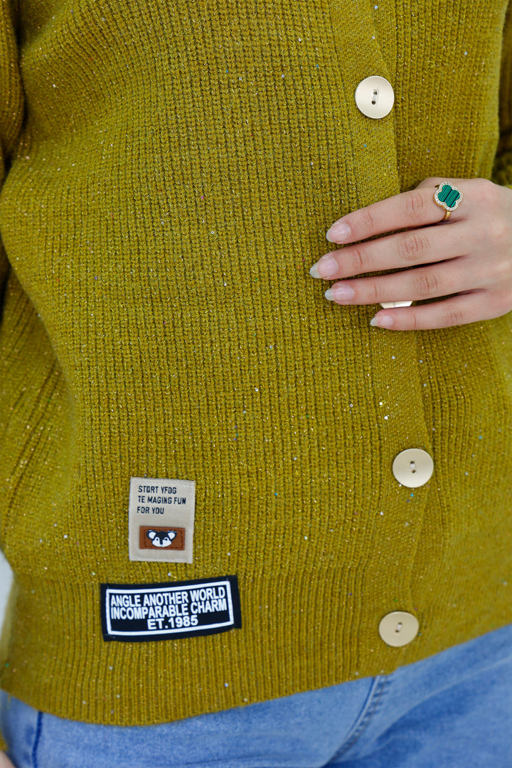 Adding a modern, slightly edgy touch are the decorative woven patches stitched near the hem. These distinctive details lend the cardigan a personalized, "found-object" feel. The simple, elegant buttons provide a sophisticated contrast against the textured knit.
