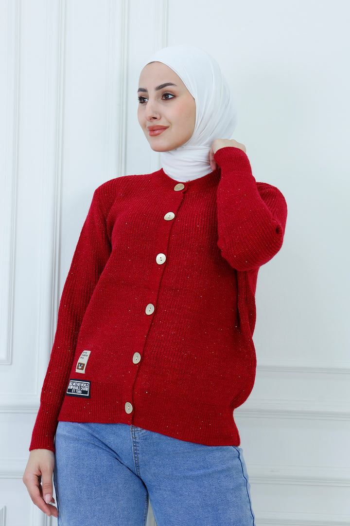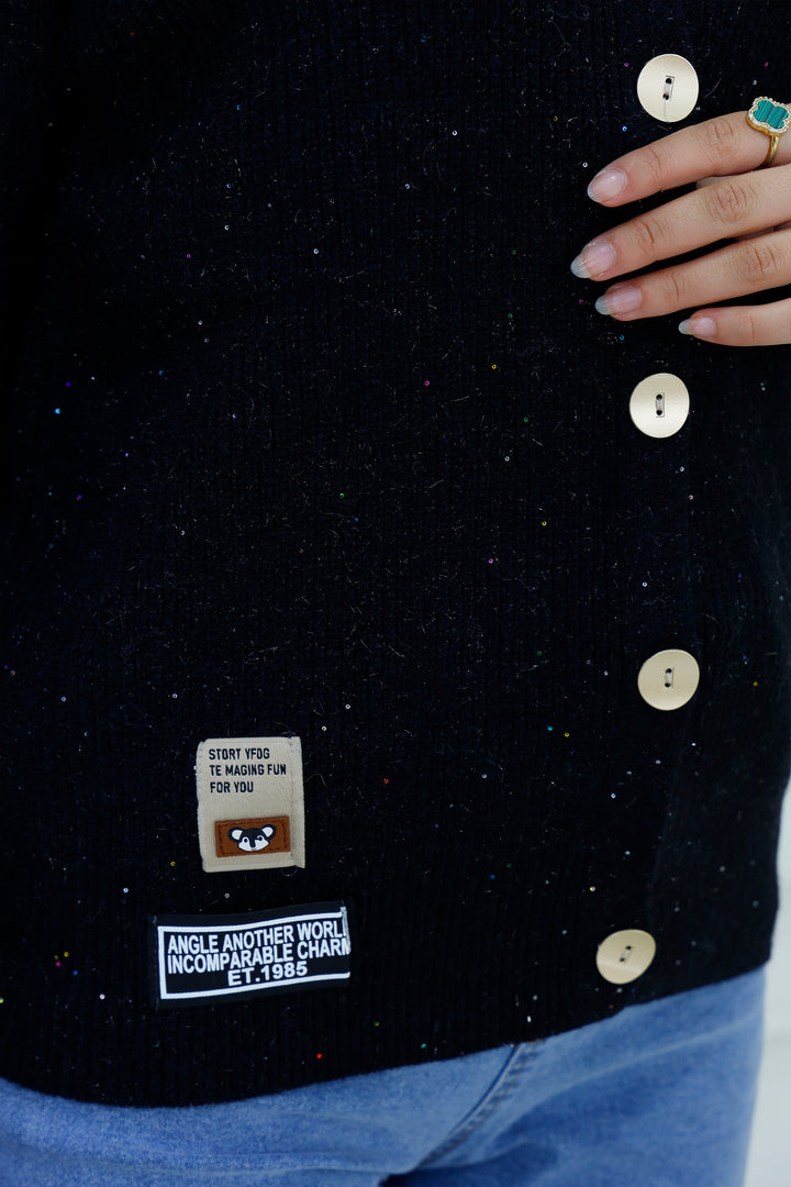 Crafted from a soft, medium-weight knit, the fabric features a charming multicolor flecked yarn (often called tweed or sparkle yarn), which gives the knit a subtle shimmer and unique texture. The crewneck design and full button front offer easy layering and styling versatility.
