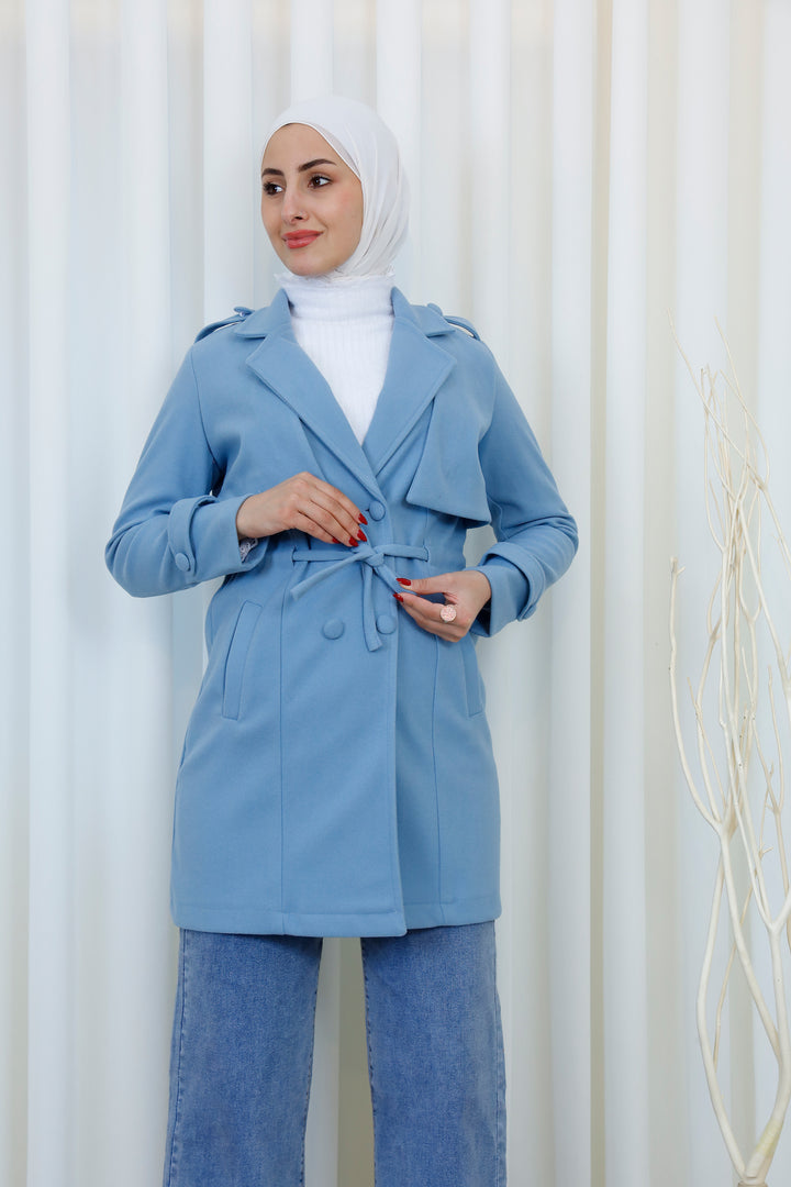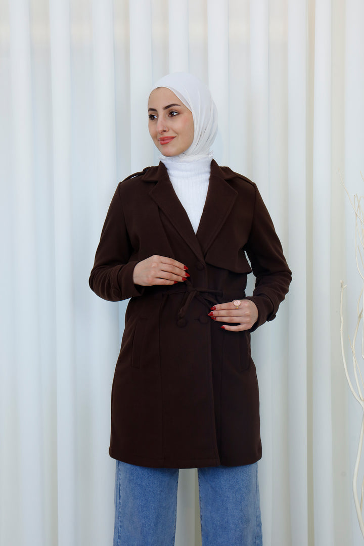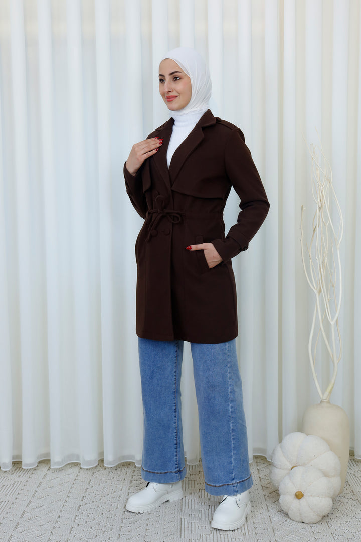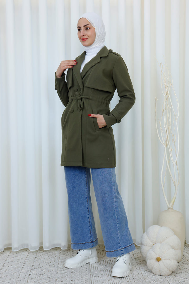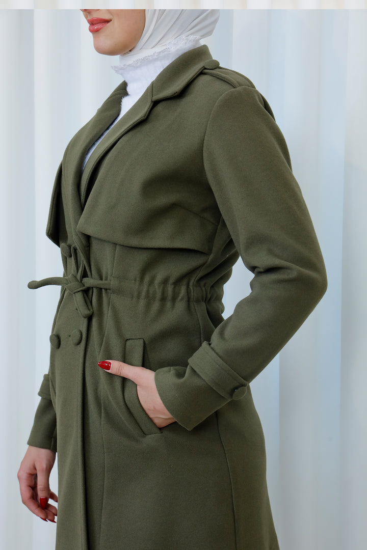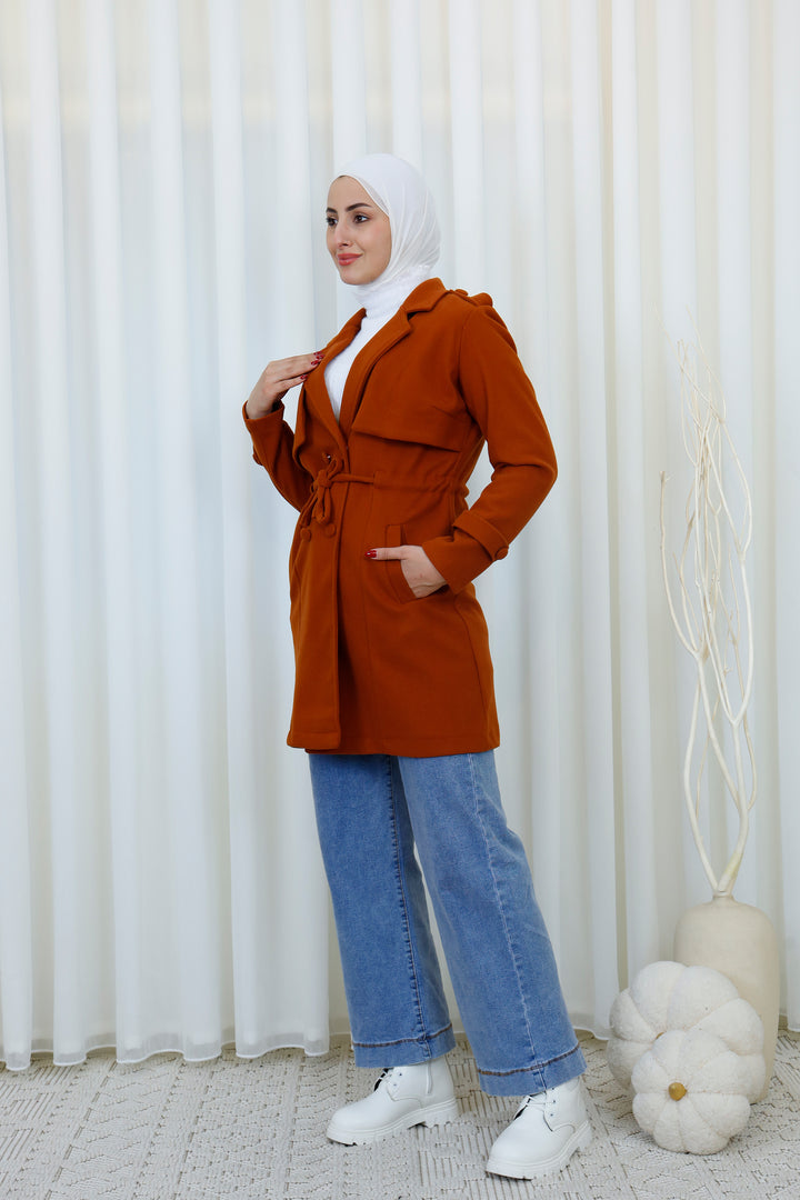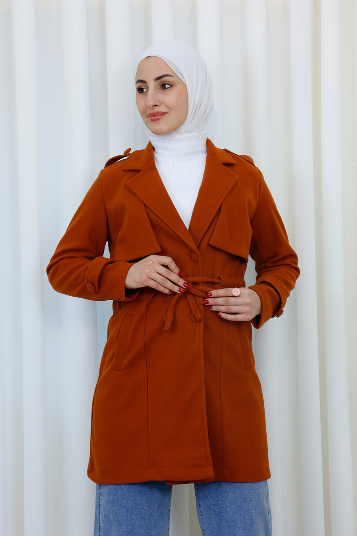 Step into the season with this elegant belted trench coat designed for a polished and modest look. Featuring a structured silhouette, layered front detail, and a matching waist belt, it offers the perfect balance between style and functionality. The soft, warm fabric provides comfort during cooler days while maintaining a refined appearance.
