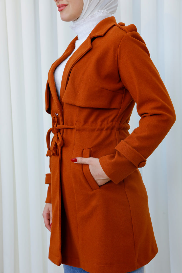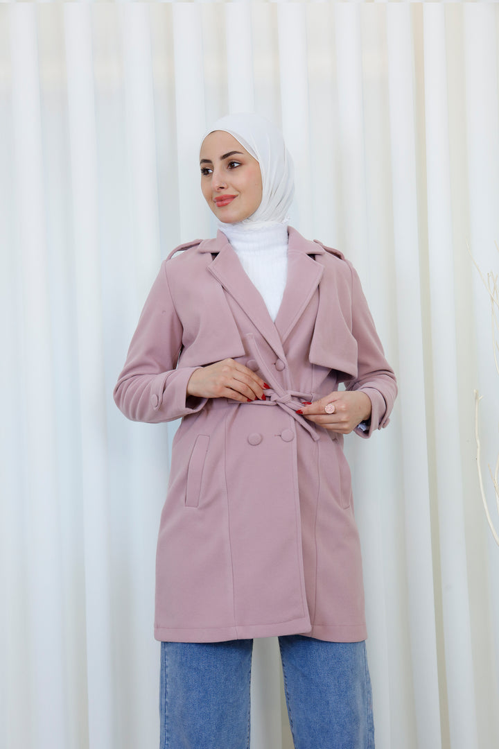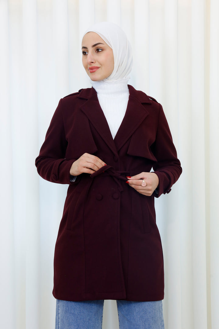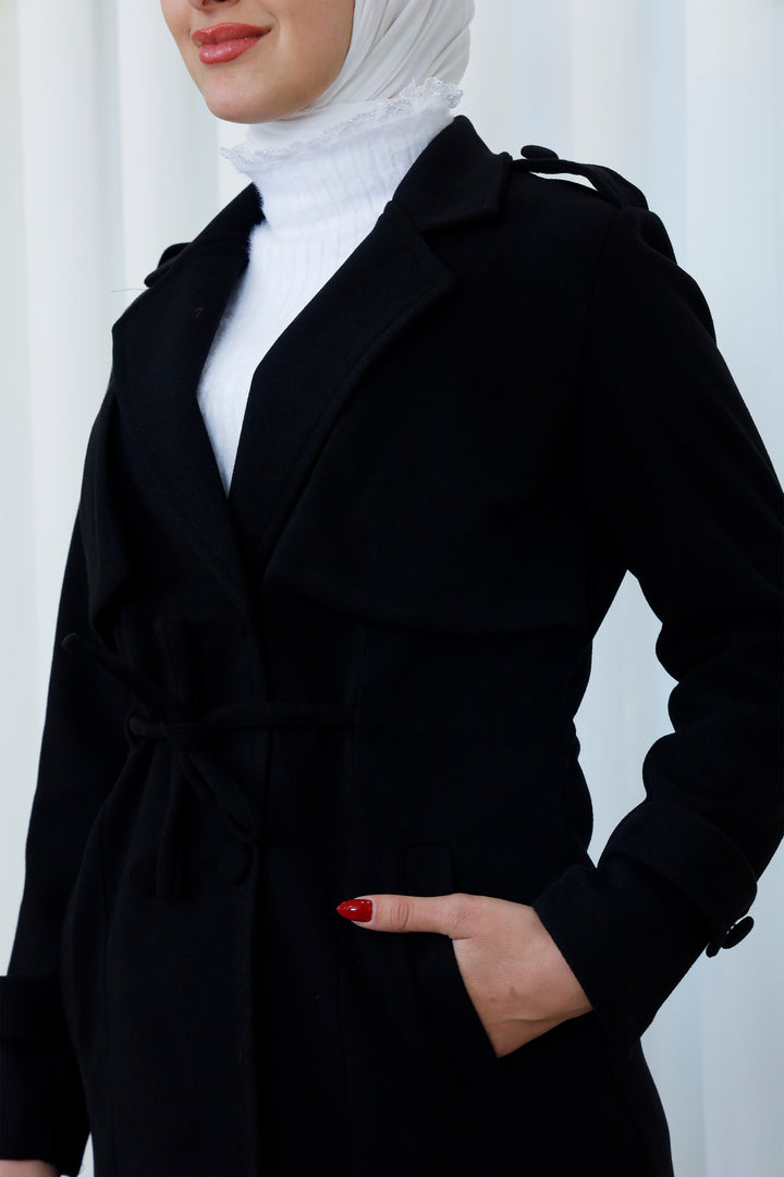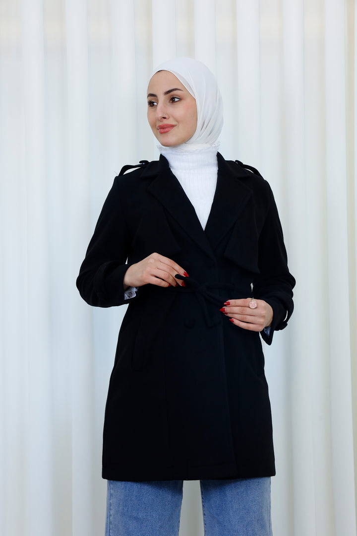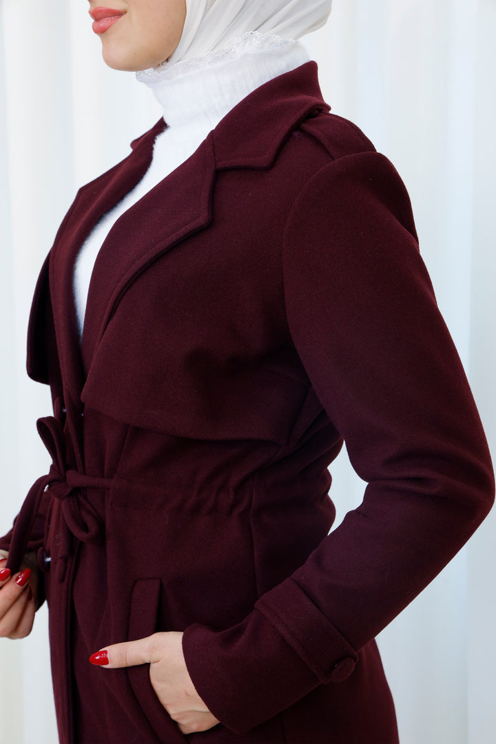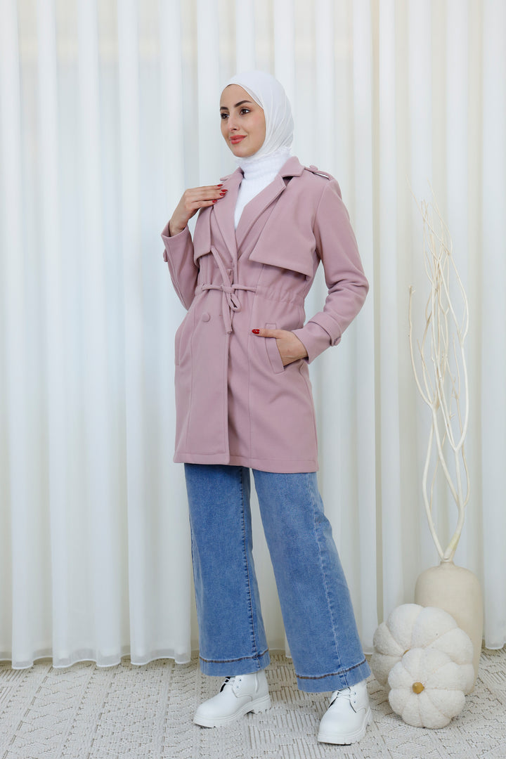 Step into the season with this elegant belted trench coat designed for a polished and modest look. Featuring a structured silhouette, layered front detail, and a matching waist belt, it offers the perfect balance between style and functionality. The soft, warm fabric provides comfort during cooler days while maintaining a refined appearance.