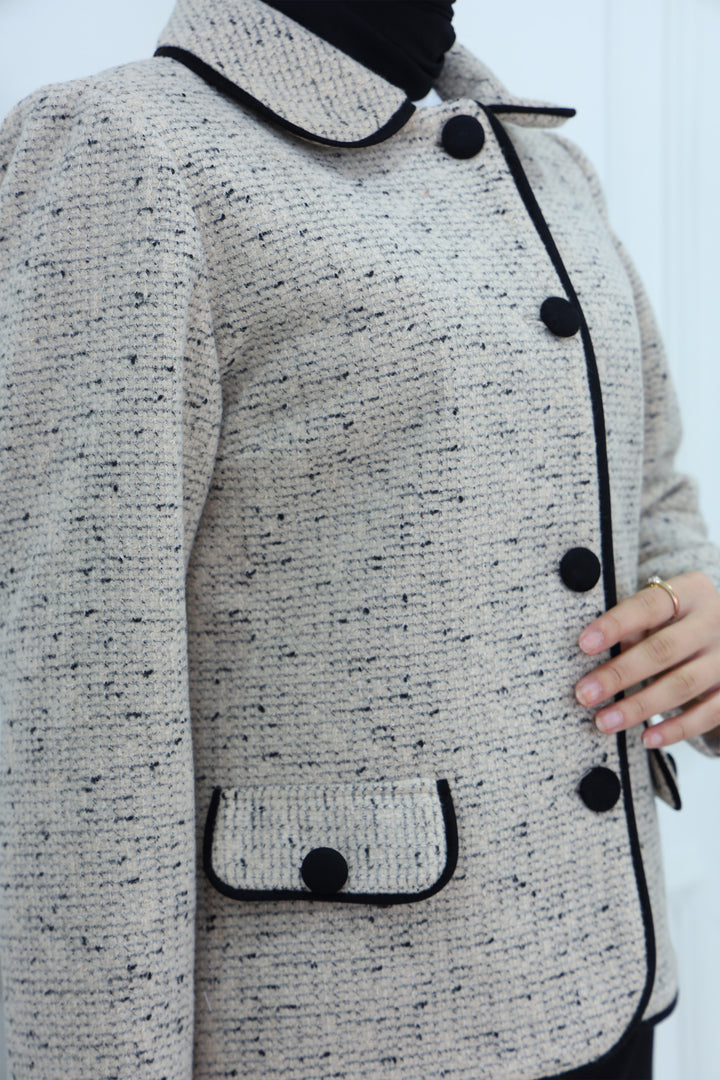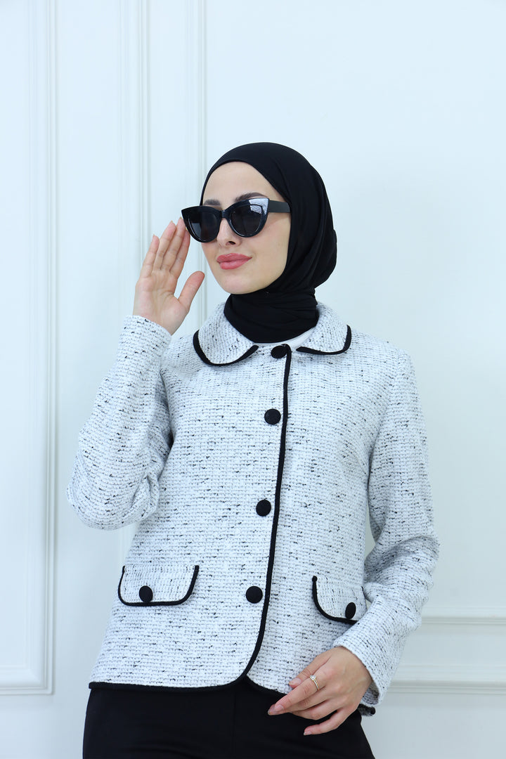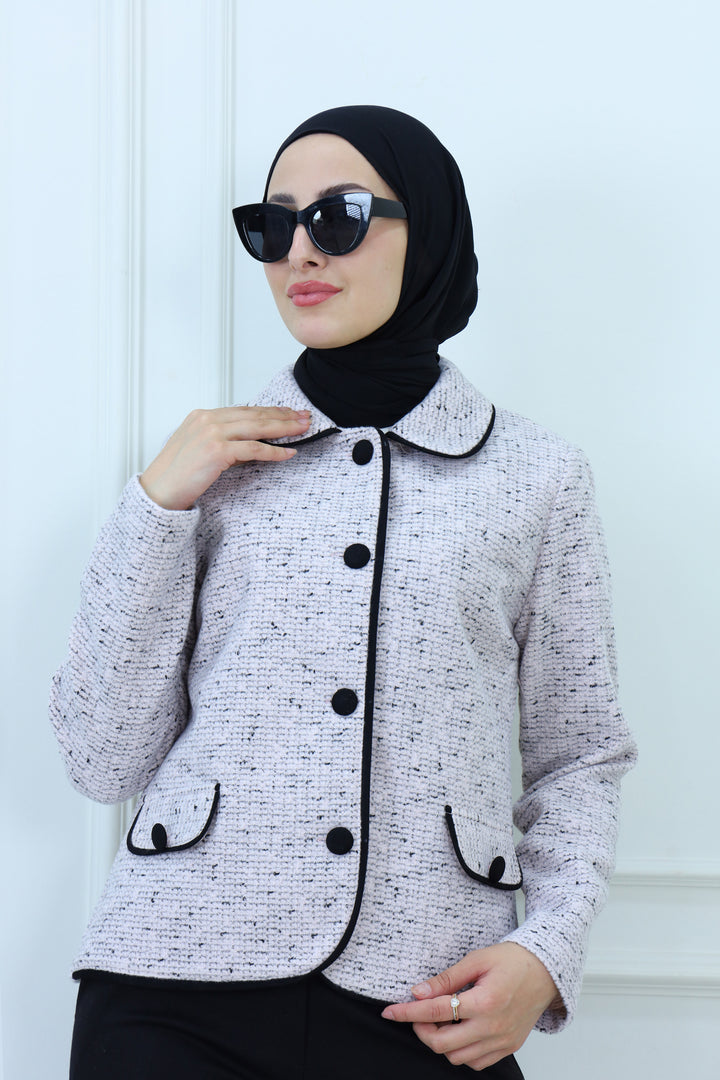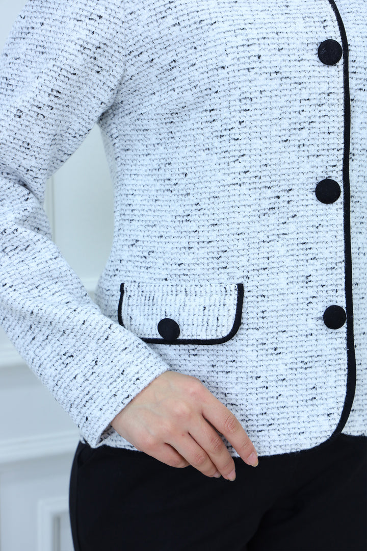 Contrast Trim & Buttons: Black piping outlines the jacket edges and the decorative front pockets, creating a clean, crisp silhouette.