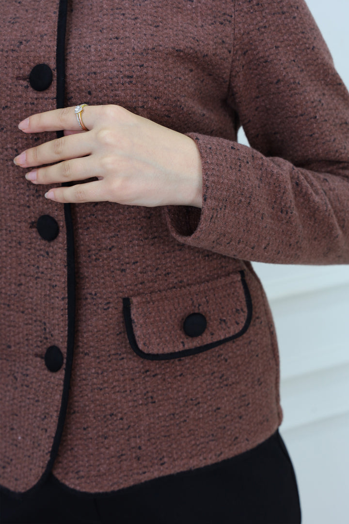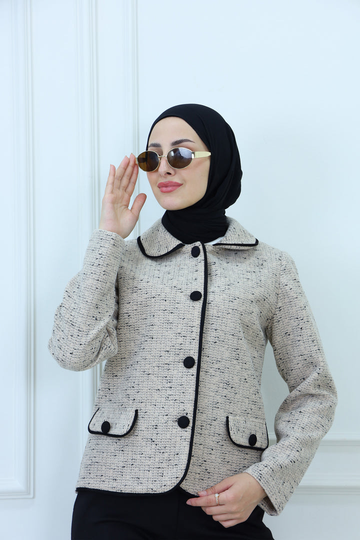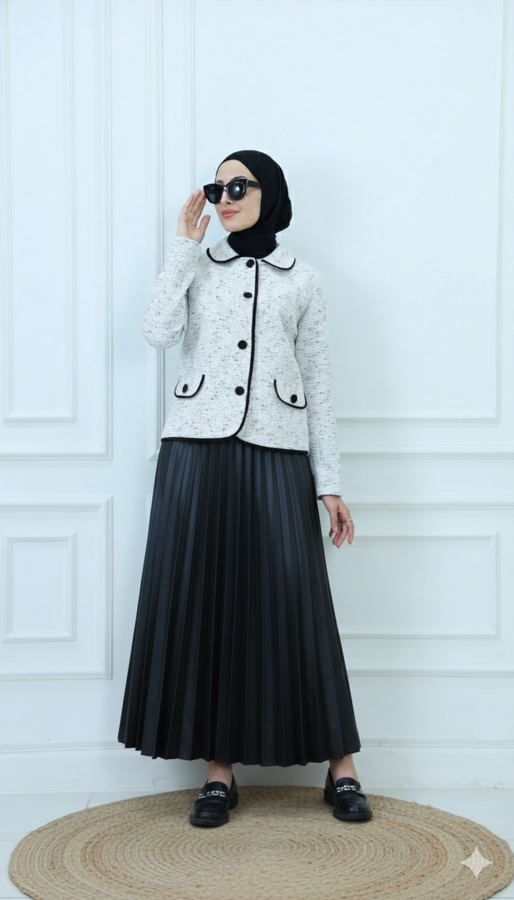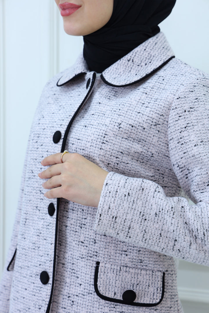 Contrast Trim & Buttons: Black piping outlines the jacket edges and the decorative front pockets, creating a clean, crisp silhouette.