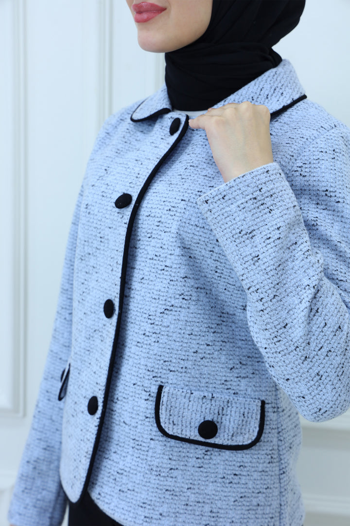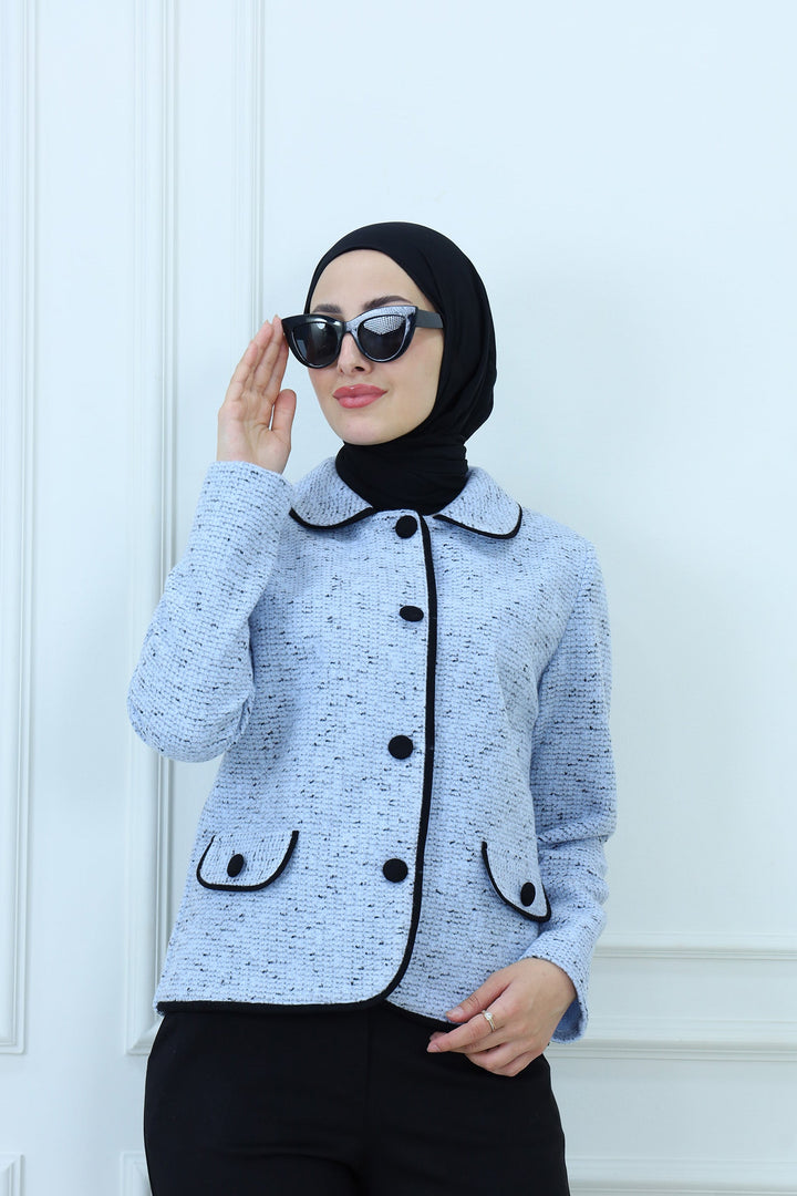 Elevate your professional and modest wardrobe with this chic, cropped jacket and Skirt, expertly crafted from smooth, high-quality broadcloth fabric in a sophisticated light blue hue. This jacket perfectly blends classic tailoring with modern, stylish details.
